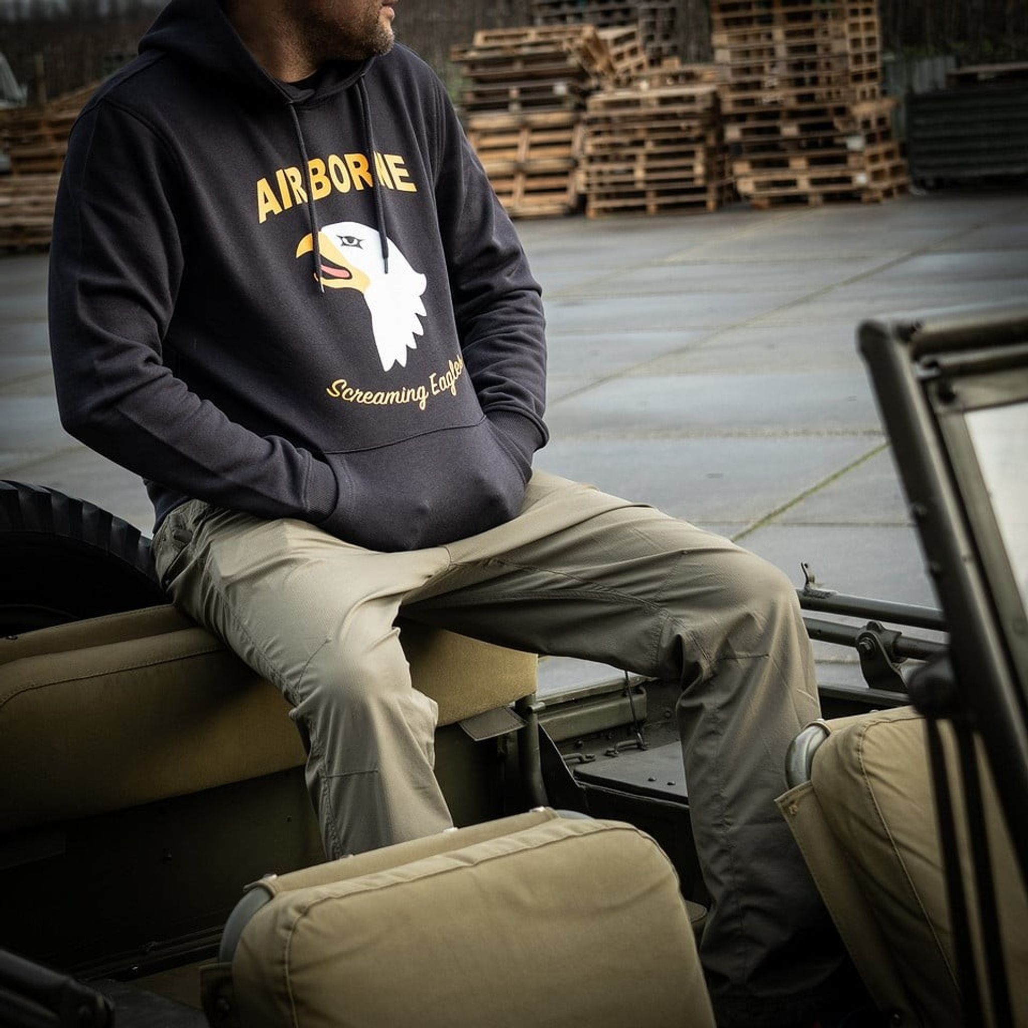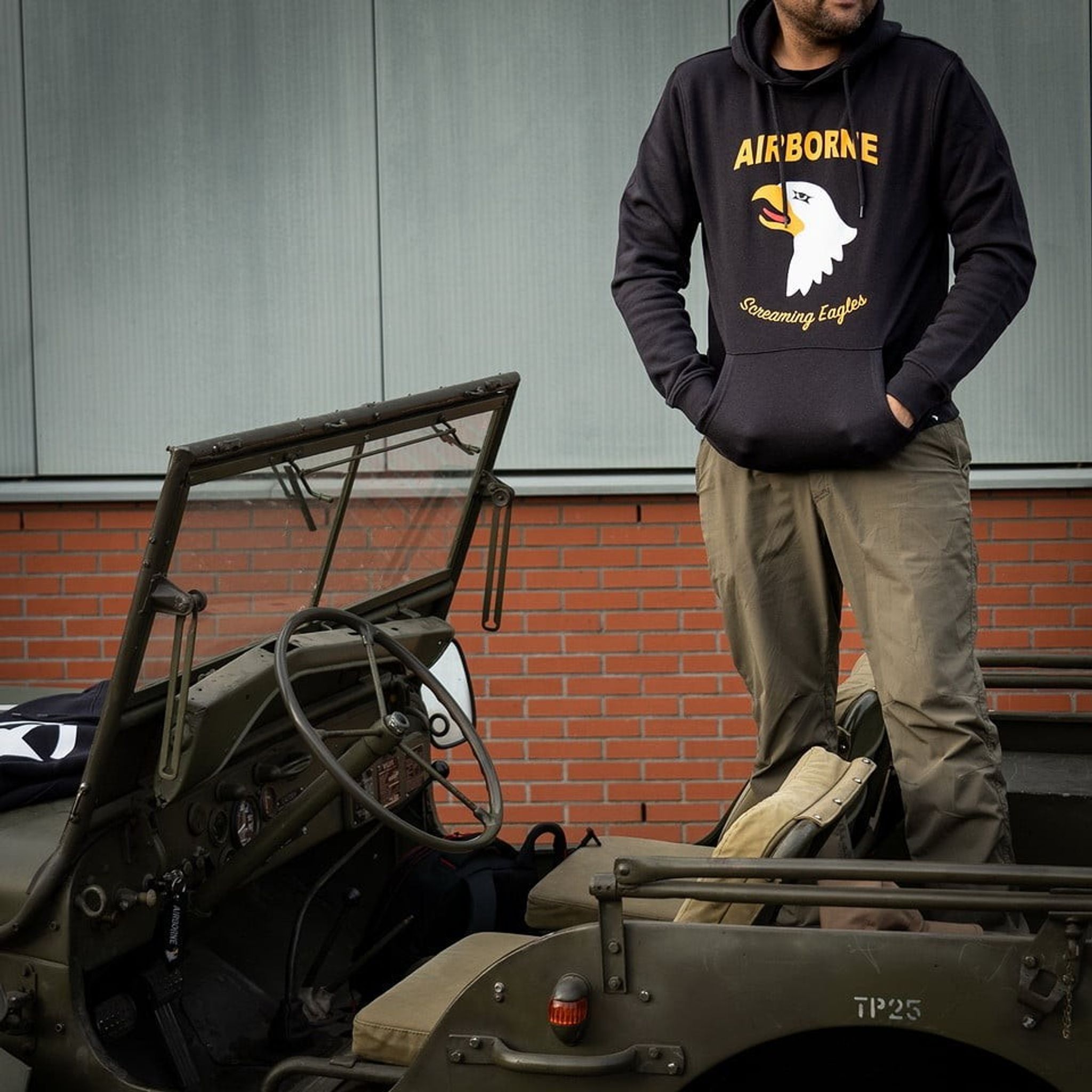 Hættetrøjen er dekoreret med et print af en skrigende ørn, et symbol kendt fra den 101. luftbårne division af den amerikanske hær. Denne infanteridivision deltog i vigtige konflikter såsom Anden Verdenskrig, Vietnamkrigen og krigene i Irak og Afghanistan.