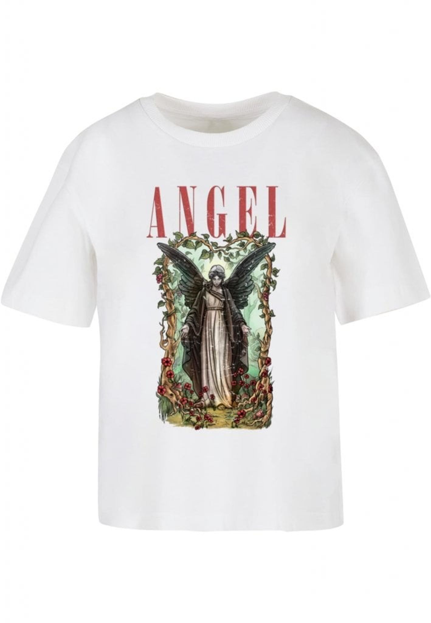Denne T-shirt er ikke bare en almindelig T-shirt, den er som en engel, der svæver over din garderobe! Motivet på tøjet viser en majestætisk engel, klædt i en smuk hvid kappe og en mørk kappe, der omfavner hendes engleform. hendes udstrakte vinger og arme giver en følelse af beskyttelse og sikkerhed, mens de snoede planter og blomster omkring hende tilføjer et strejf af skønhed og elegance.