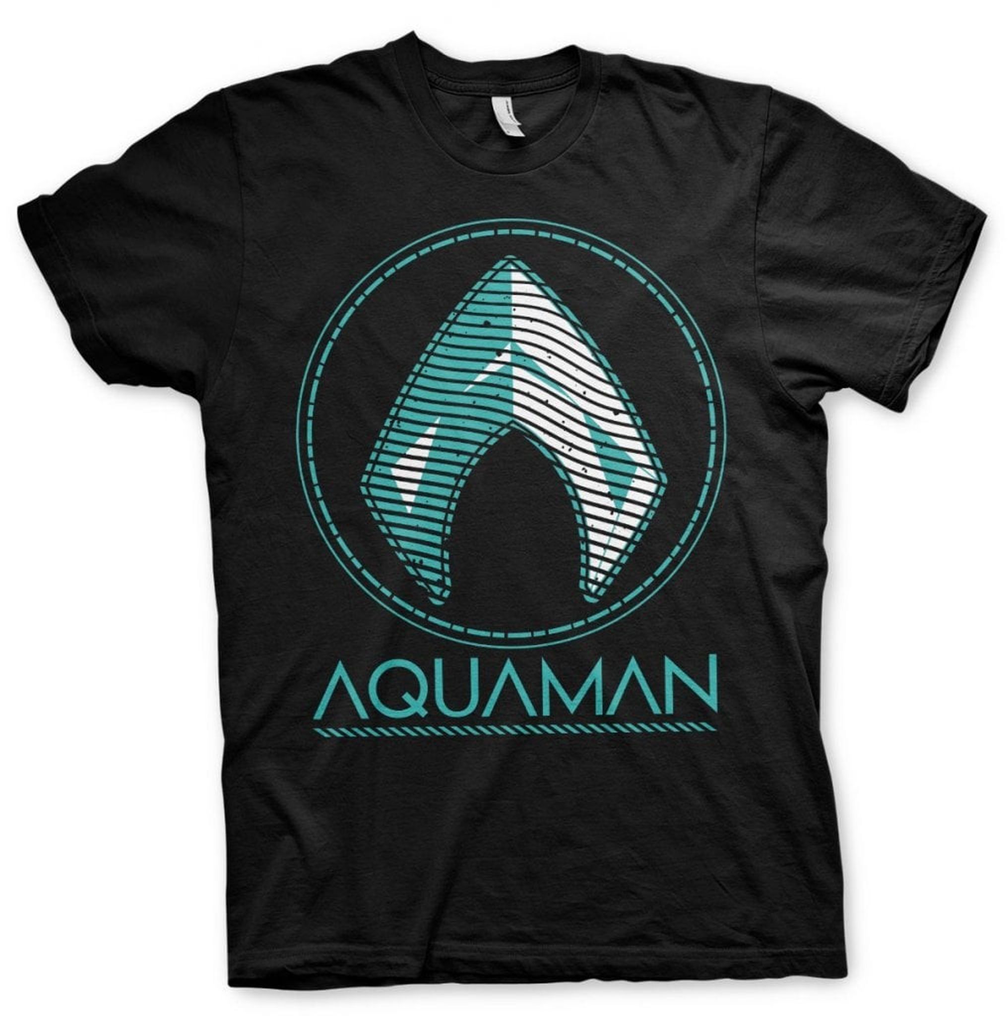 stærk som havet og holdbart som sømand! Aquamans nødlidende skjold-t-shirt viser en beskadiget og slidt version af heltens ikoniske skjold. Så nu kan du også se ud som om du har overlevet kampene mod havmonstre og onde skurke.