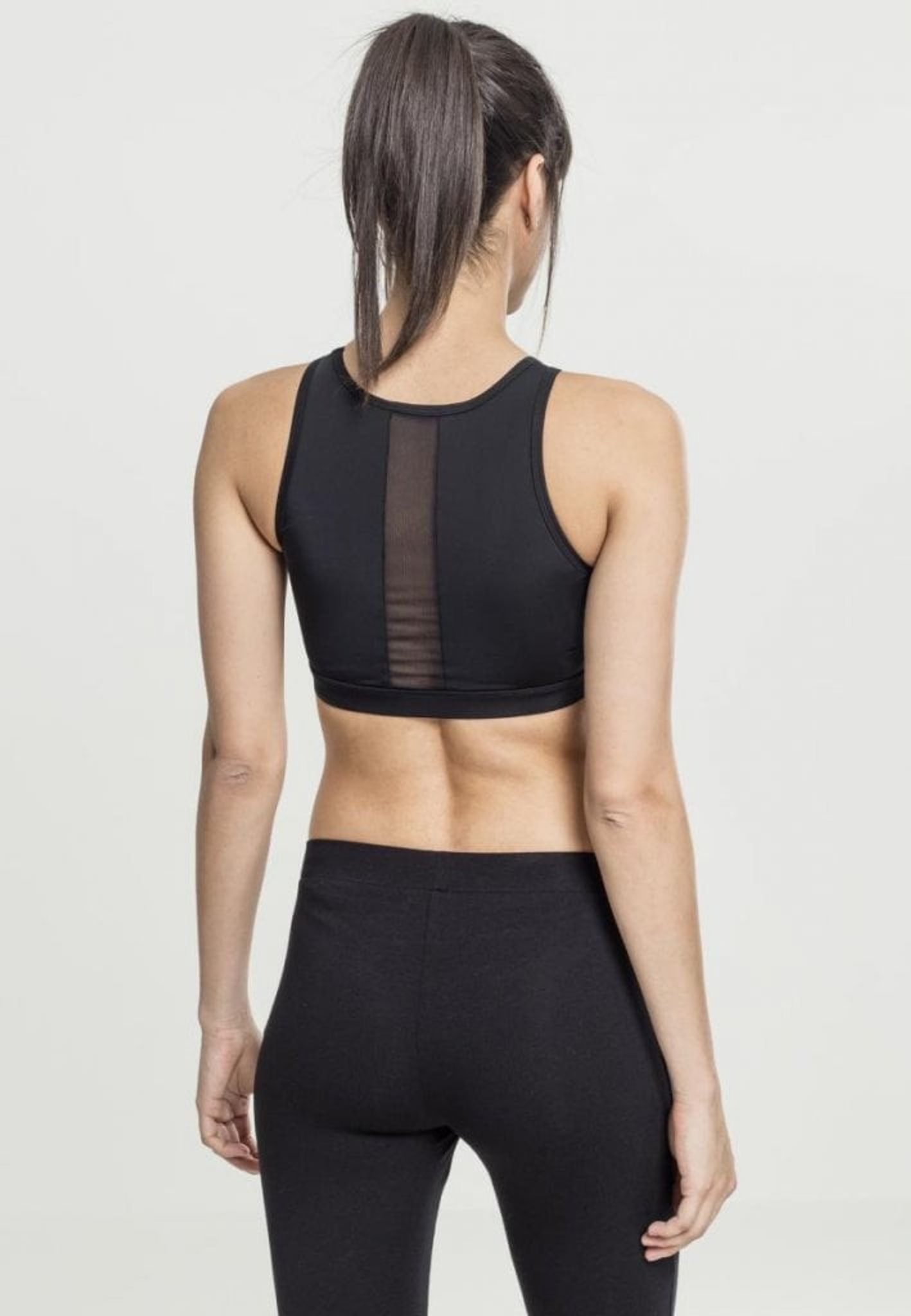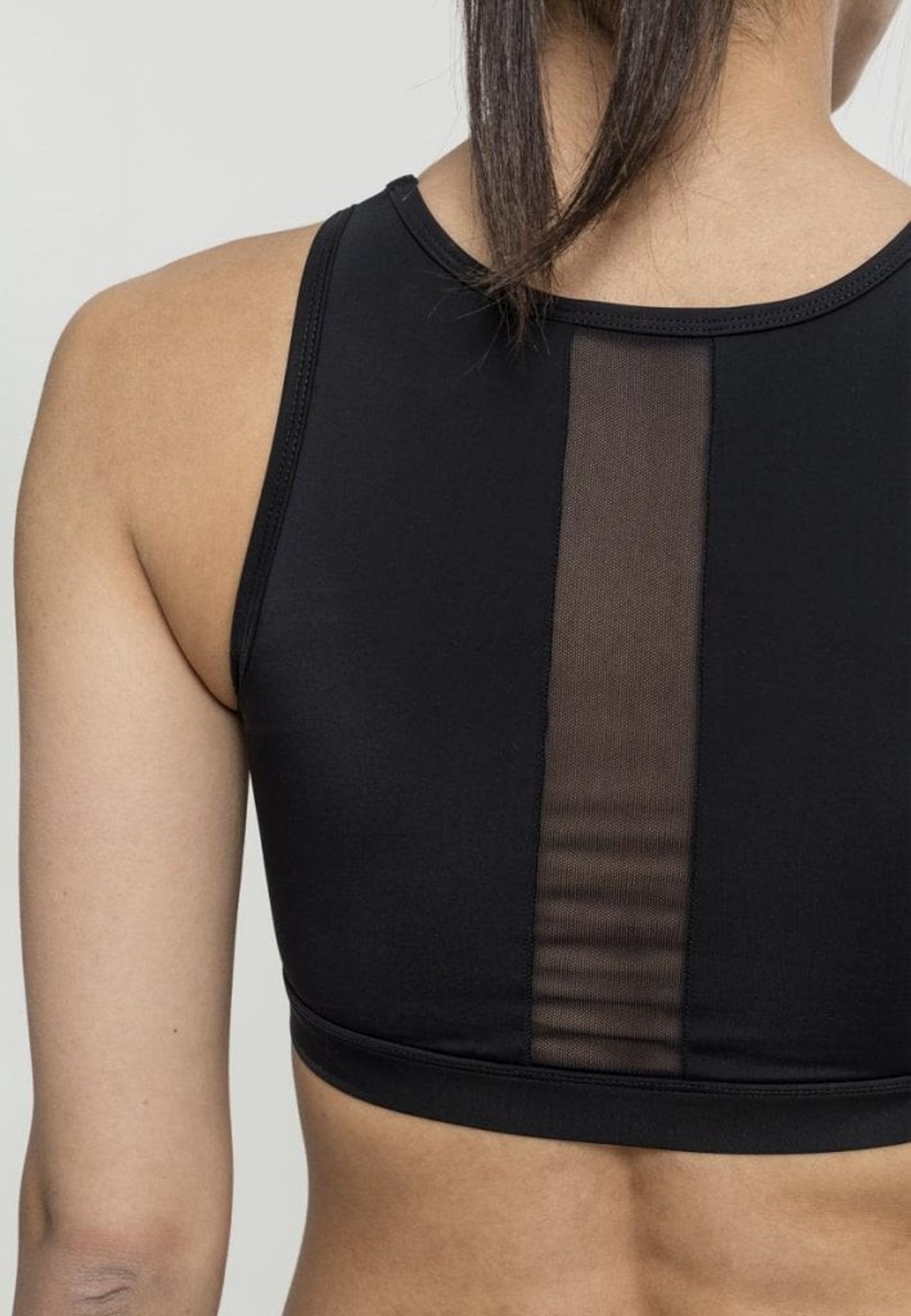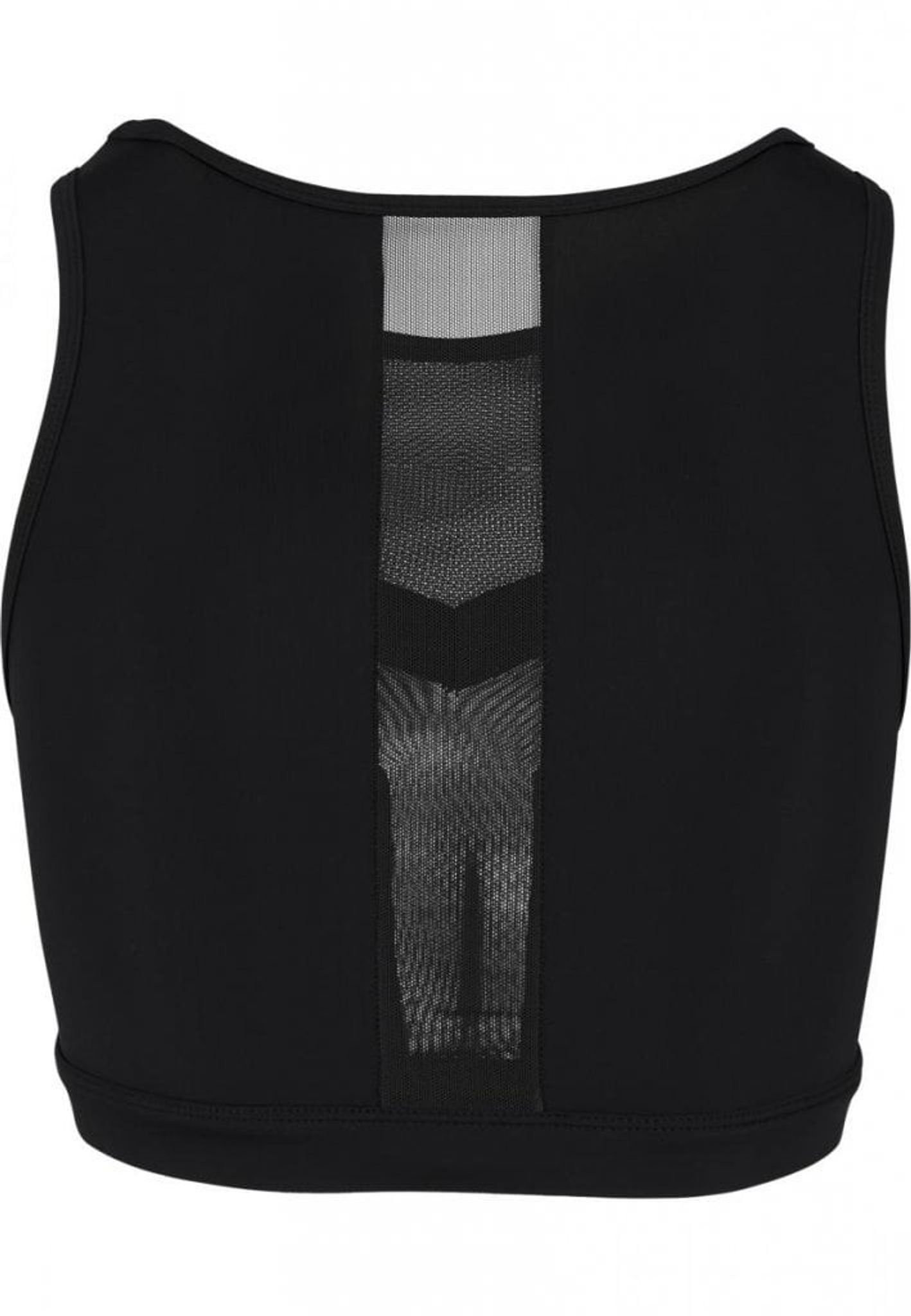 En dejlig træningstop med dele af det i tyndt netstof og over brystene med tykkere sort stof. Det samme gælder for ryggen, hvor der er en strimmel ned bagpå med det gennemsigtige maskestof.