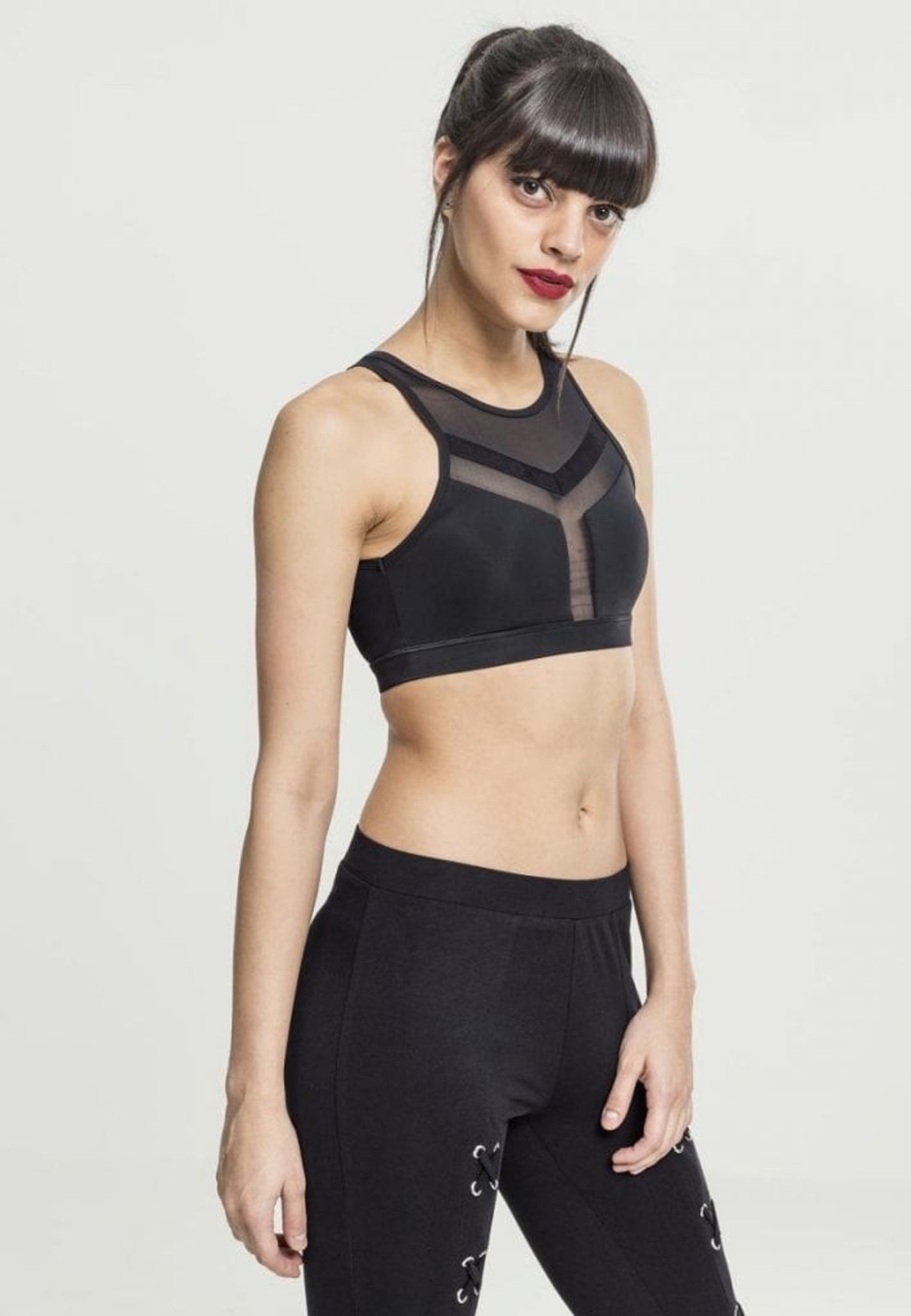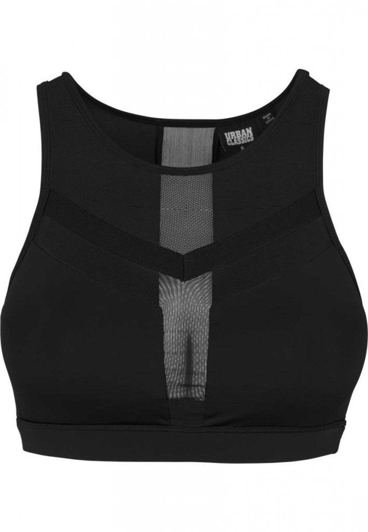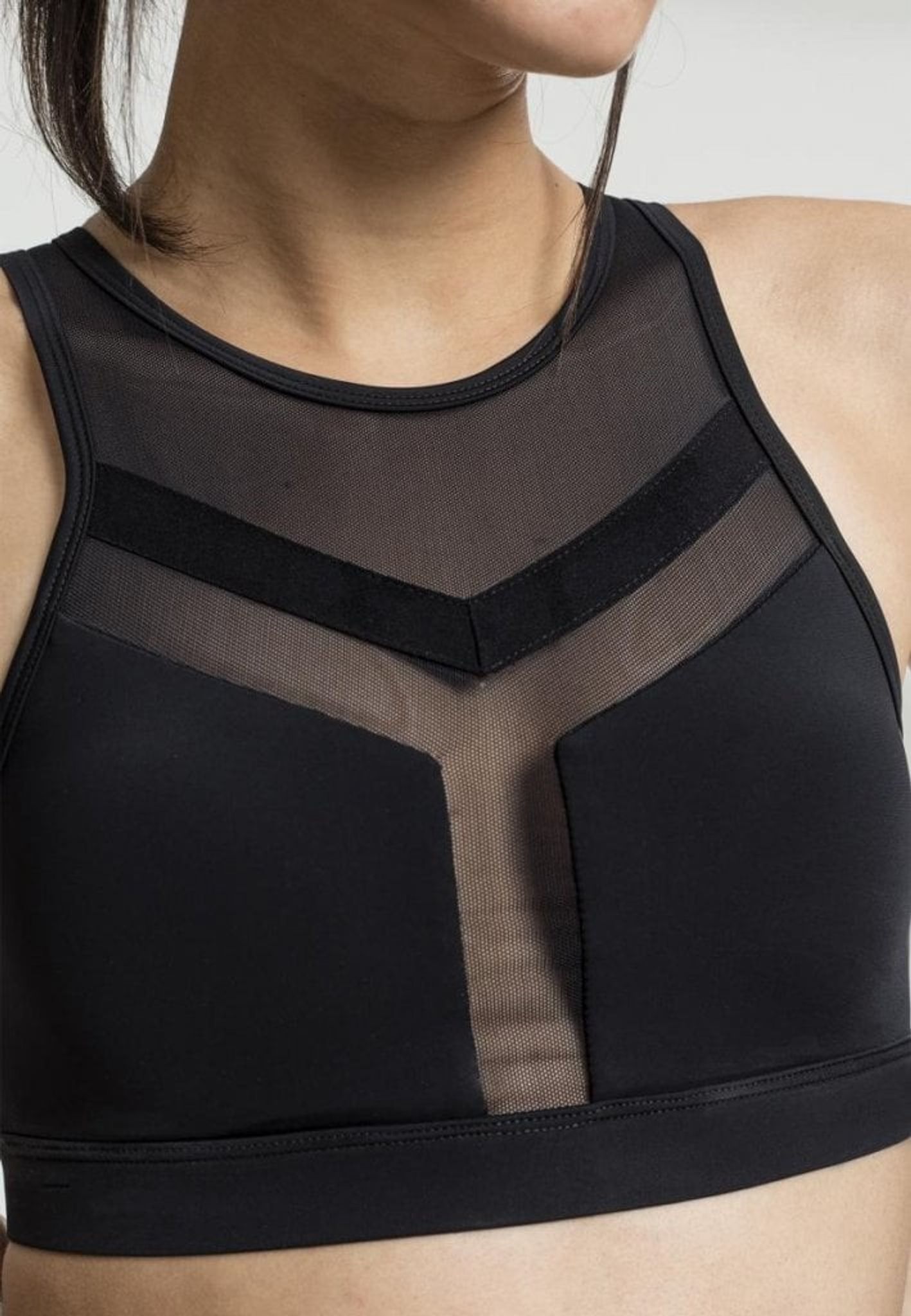 En dejlig træningstop med dele af det i tyndt netstof og over brystene med tykkere sort stof. Det samme gælder for ryggen, hvor der er en strimmel ned bagpå med det gennemsigtige maskestof.