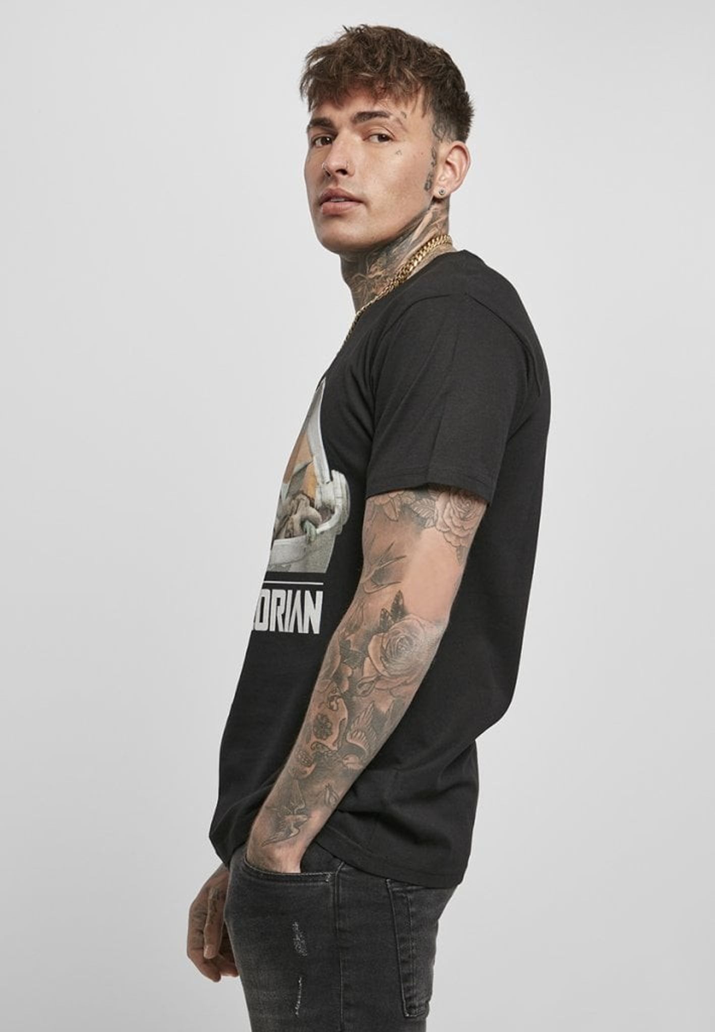 Baby Yoda i et stort brysttryk.