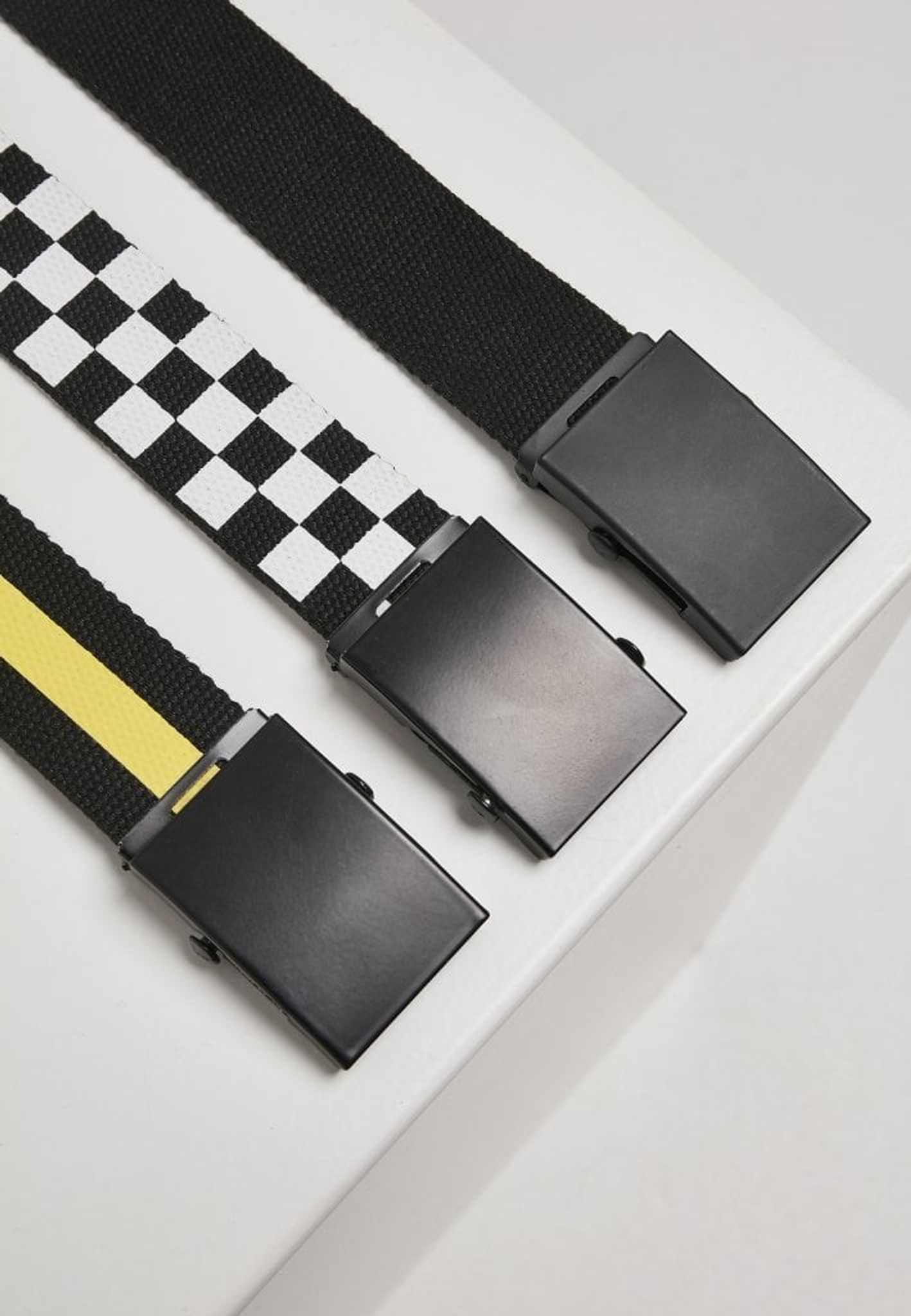 Et bælte er stribet i sort og gul, et bælte er plettet i sort og hvidt og det tredje bælte er fuld sort. Et bælte til enhver lejlighed.