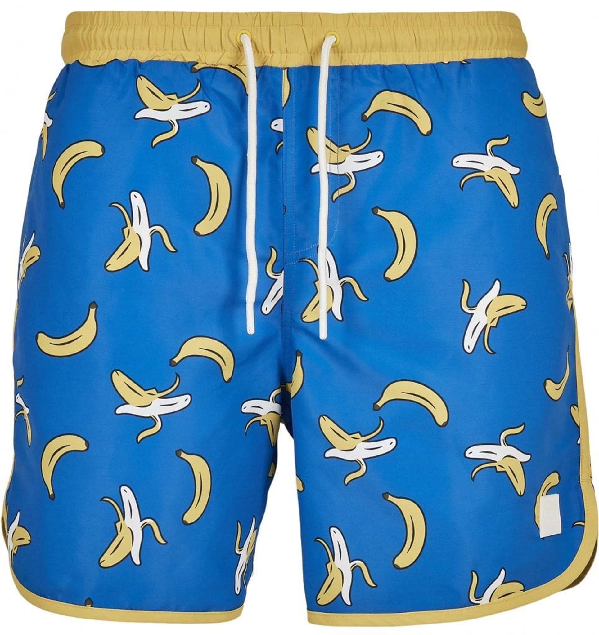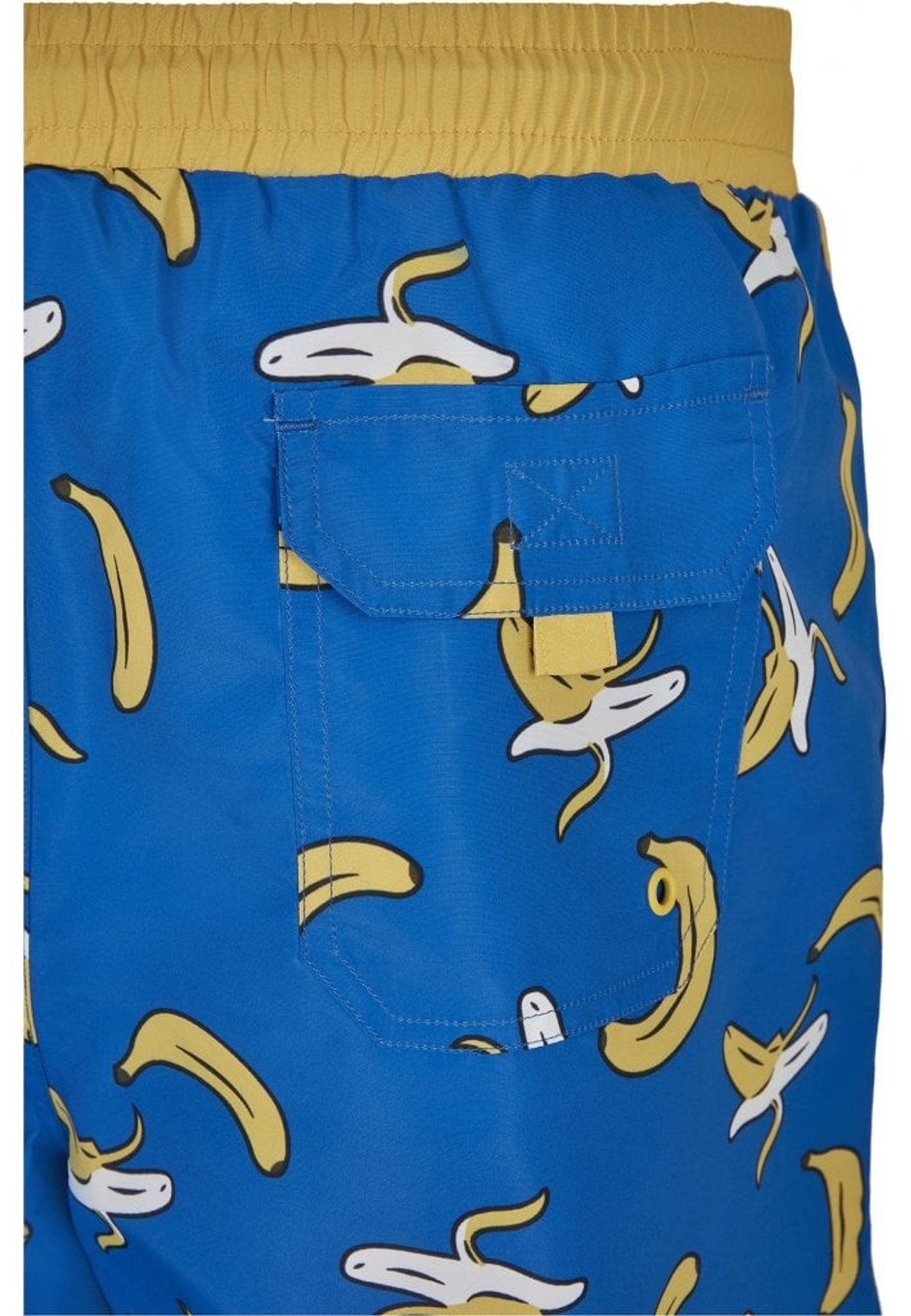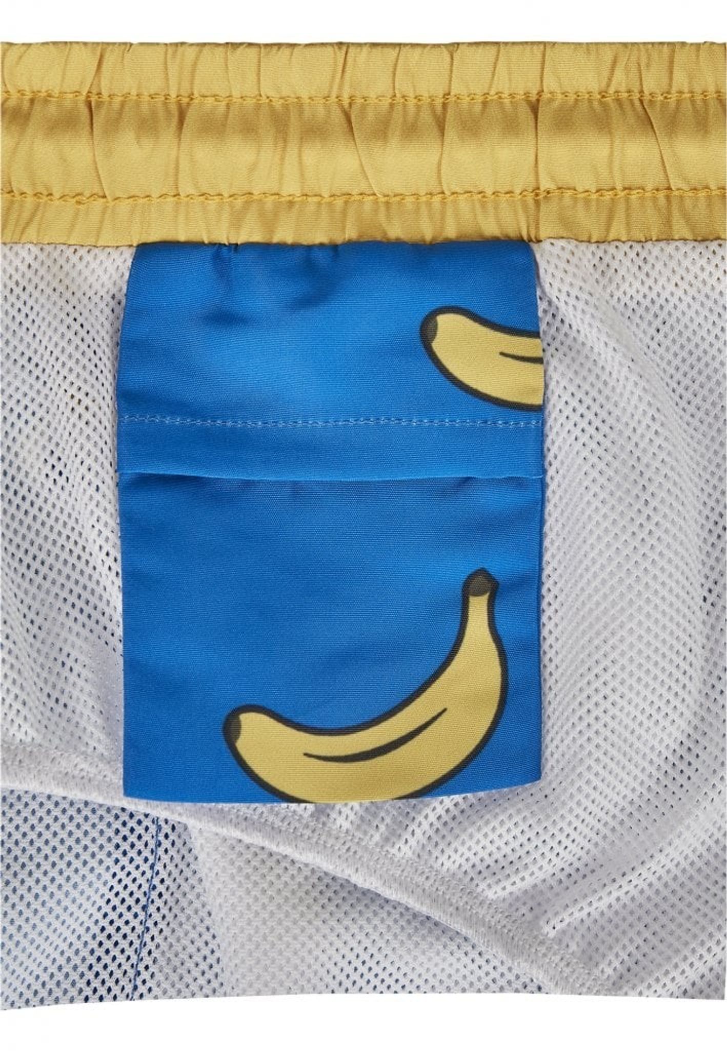 Et par rigtig cool badeshorts i blå og gul. Det blå stof er fuld af bananer.