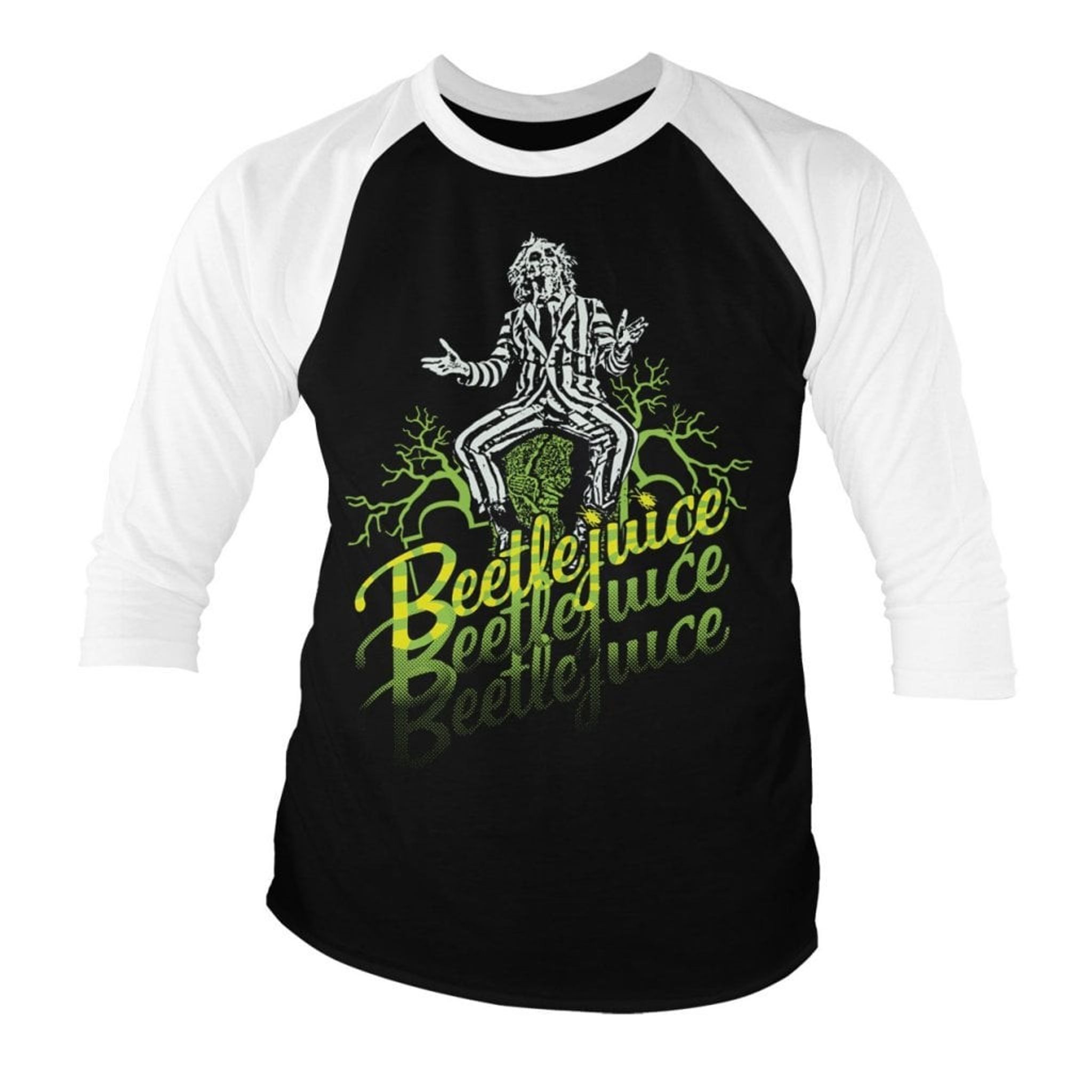 Her er en baseball-tee med 3/4 lange ærmer og Beetle juice i motiver over brystet.