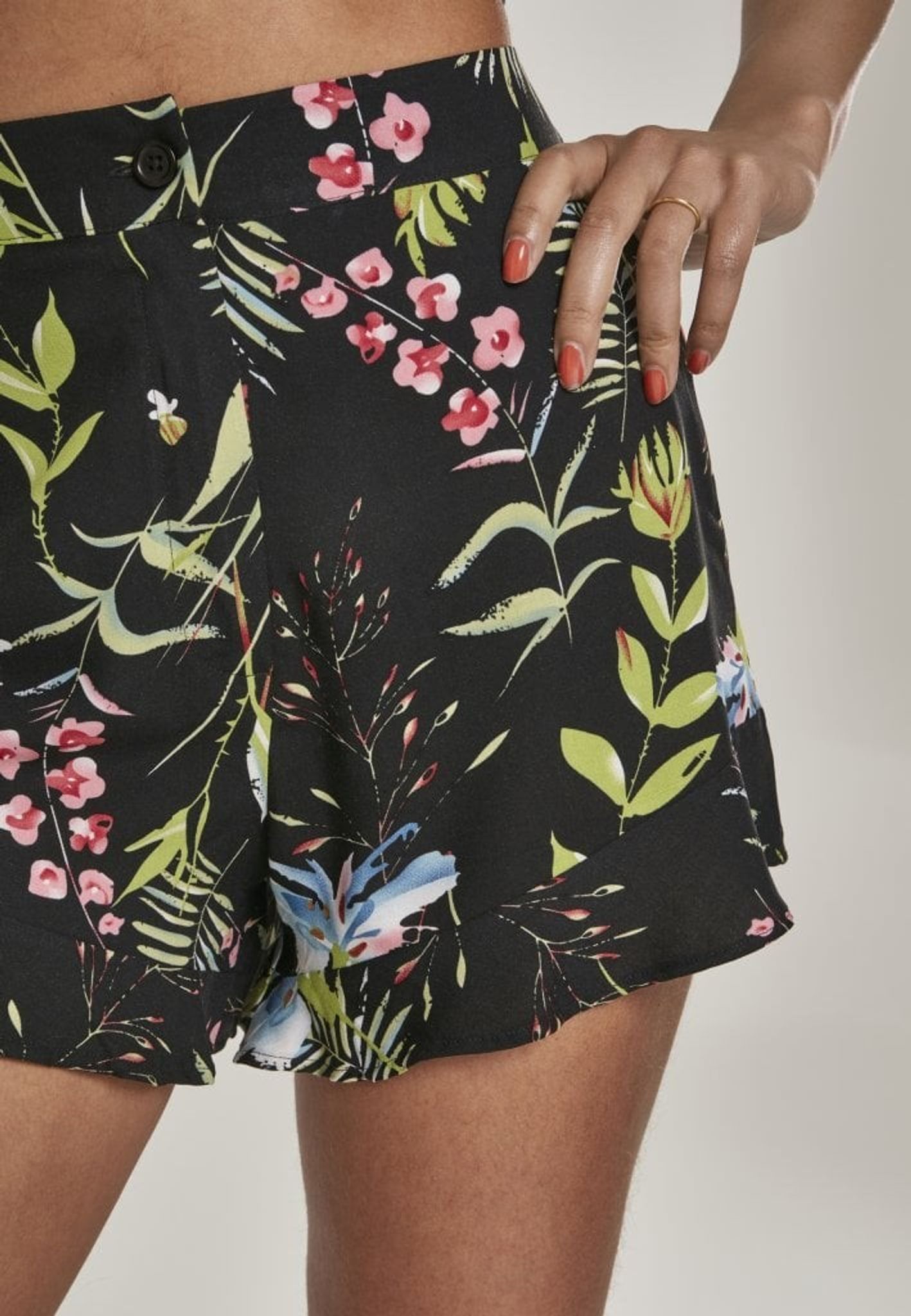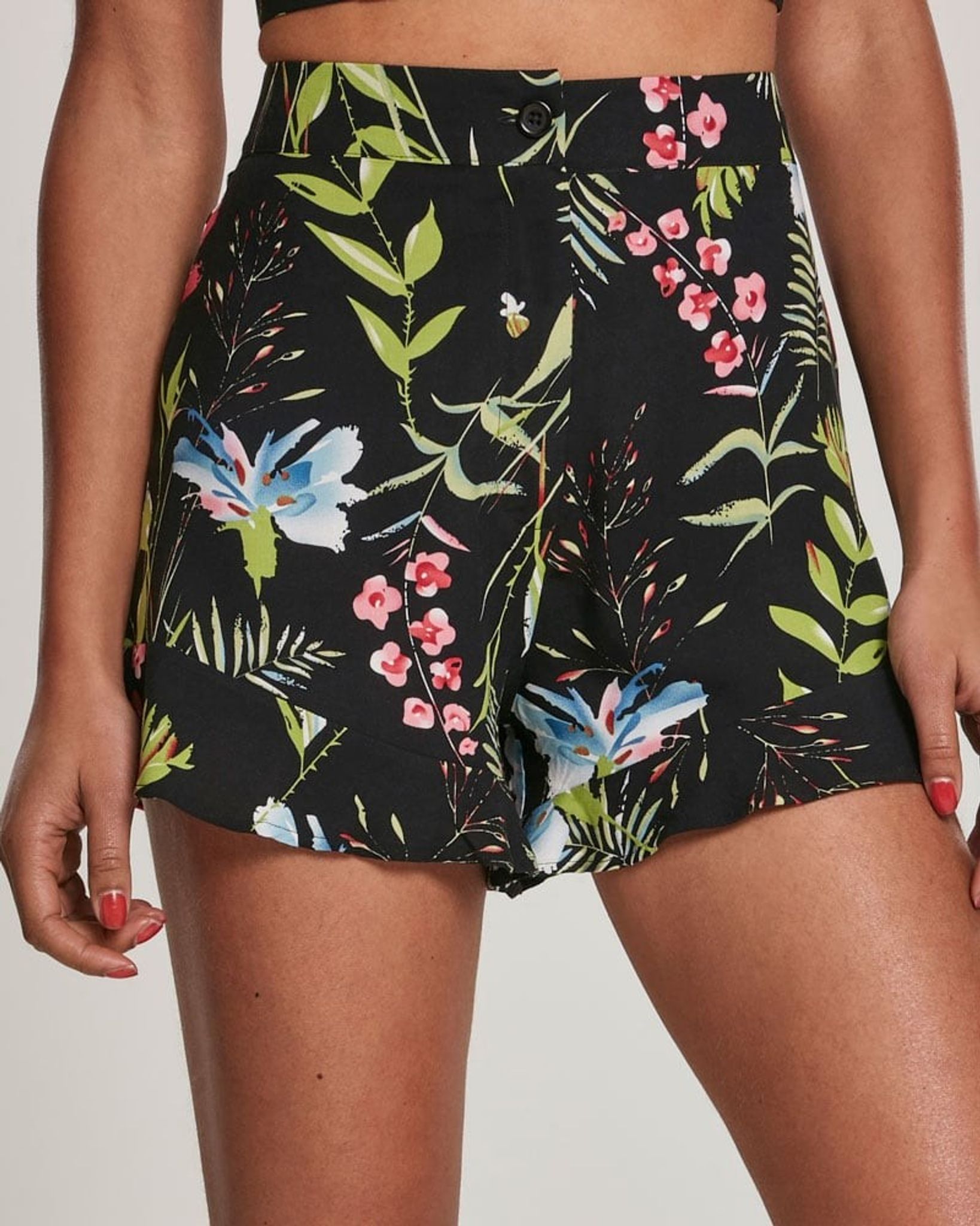 Den korte shorts er sort med et blomstermønster i blå, lyserød og grøn farve.