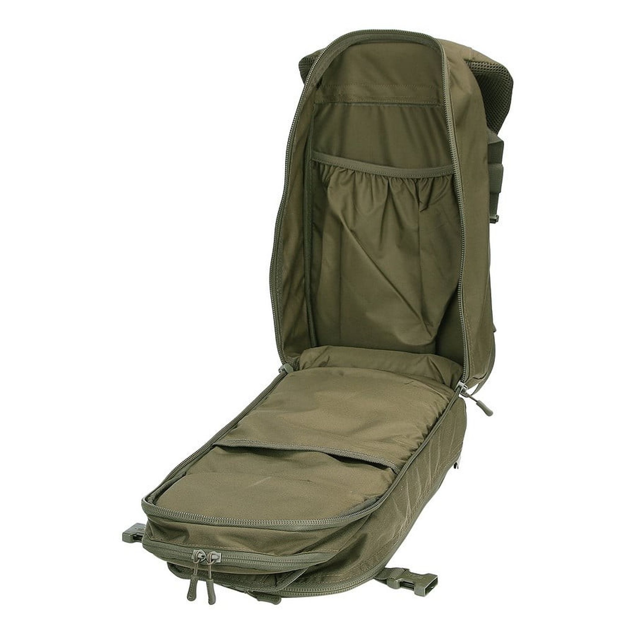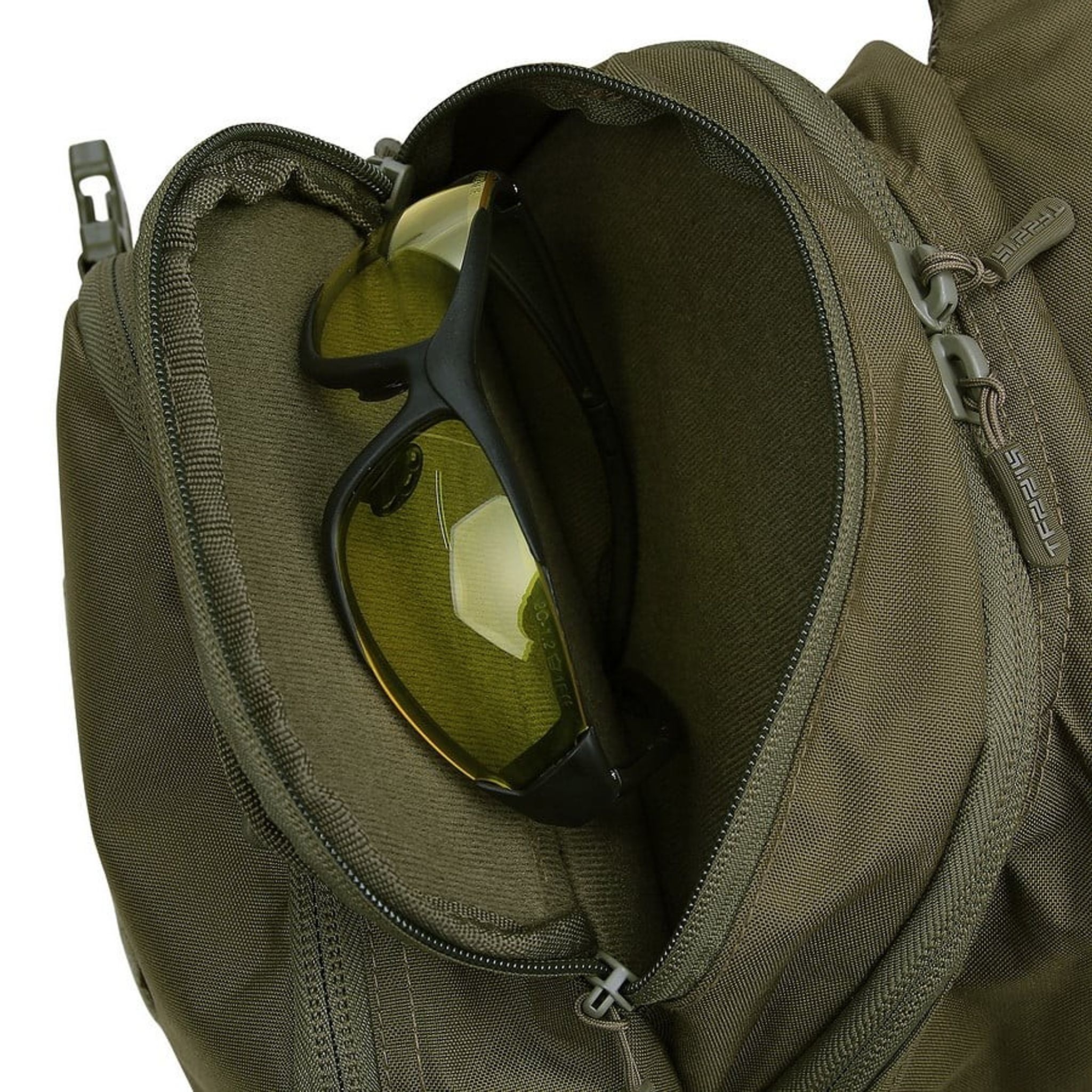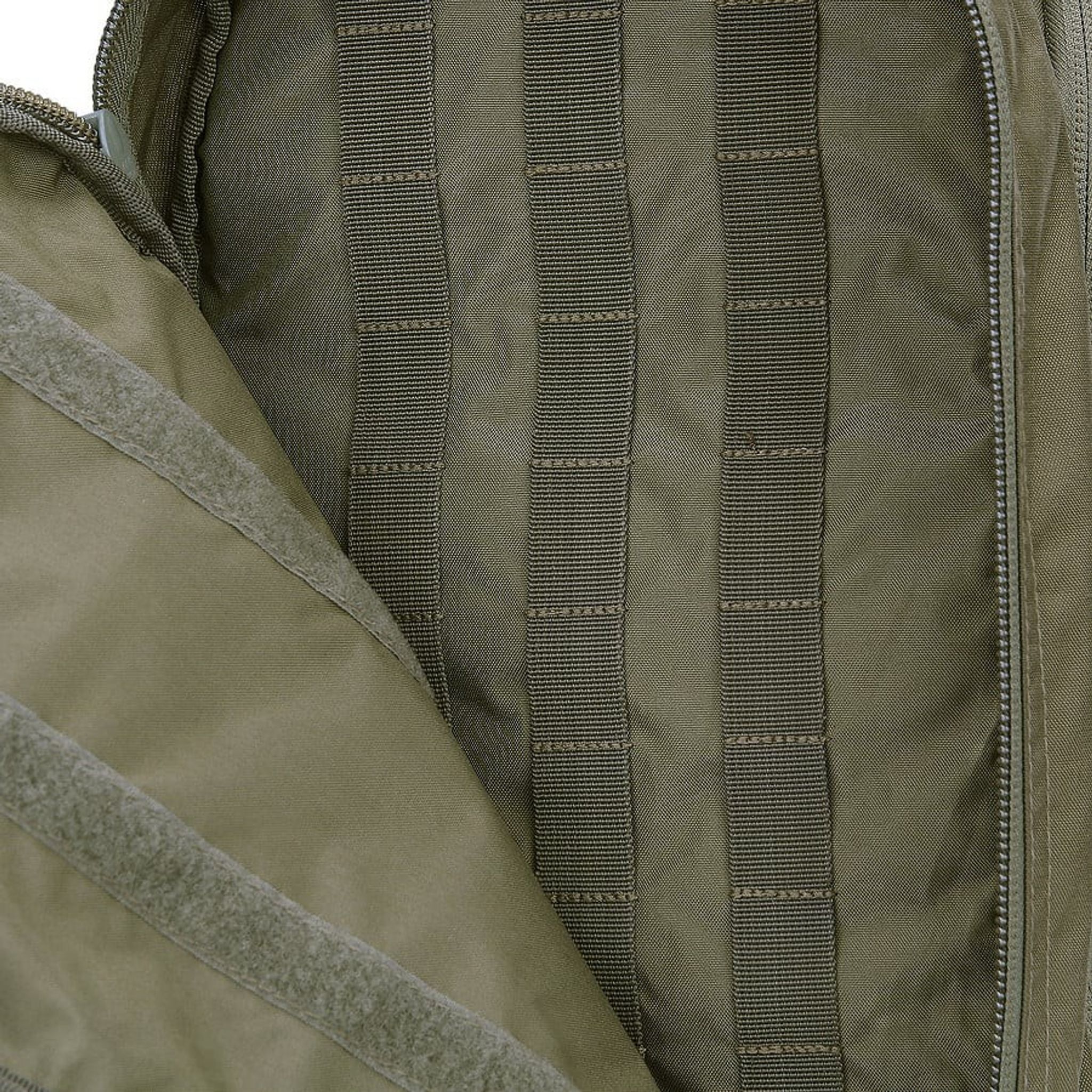 Bushmate Pro har to lynlåsrum. Foran har en lomme med MOLLE-stropper på indersiden til fastgørelse af forskellige lommer. Hovedrummet har et specifikt sted til en 15-tommer bærbar computer.