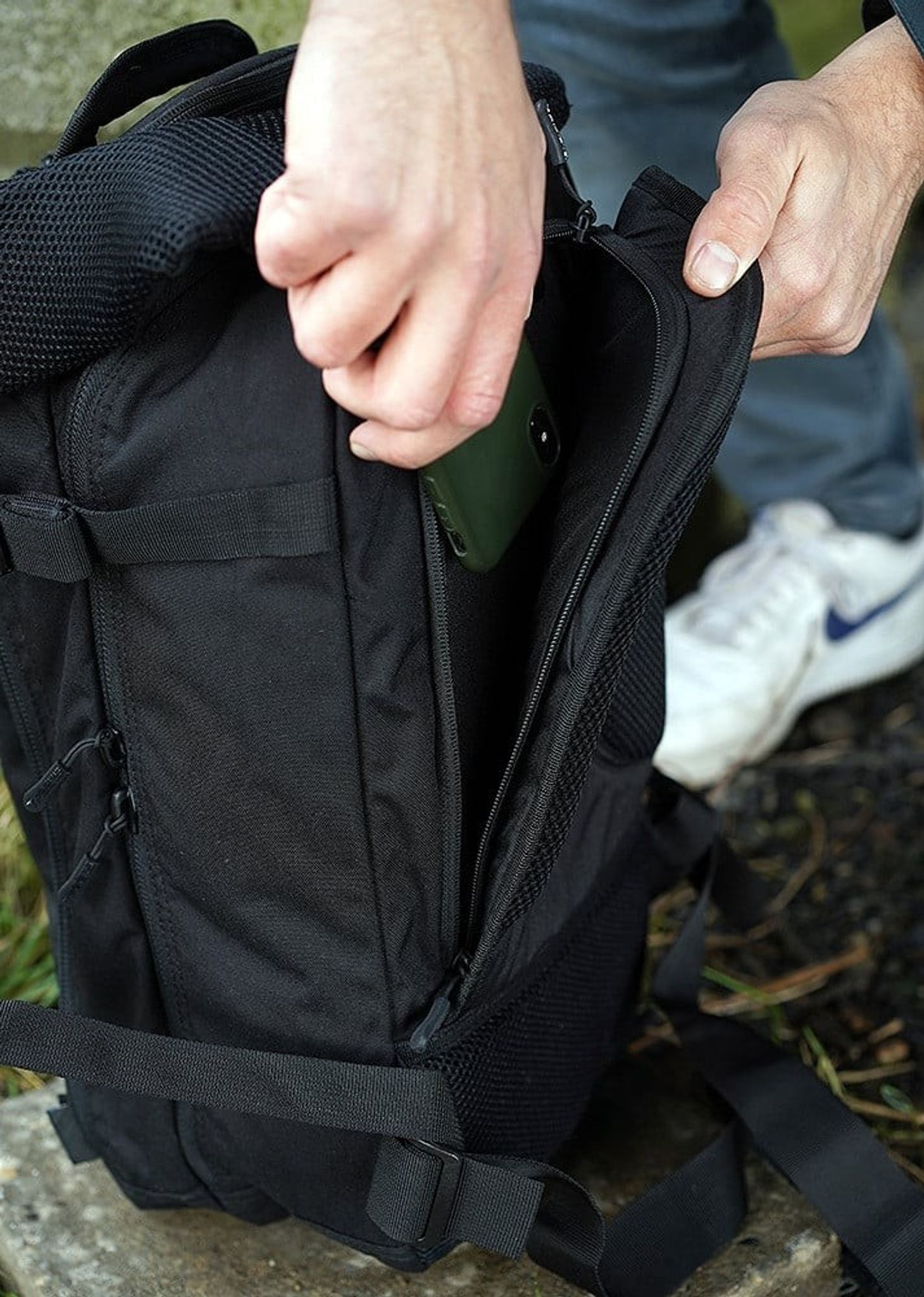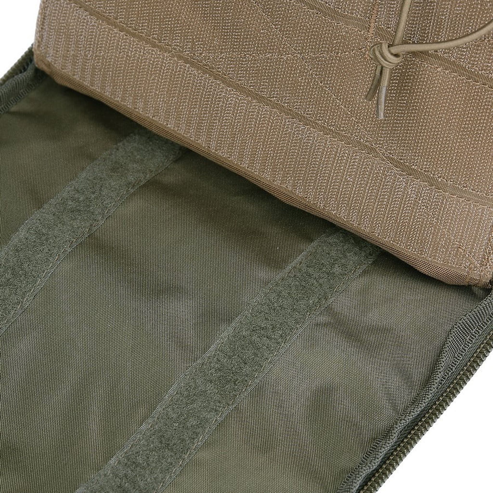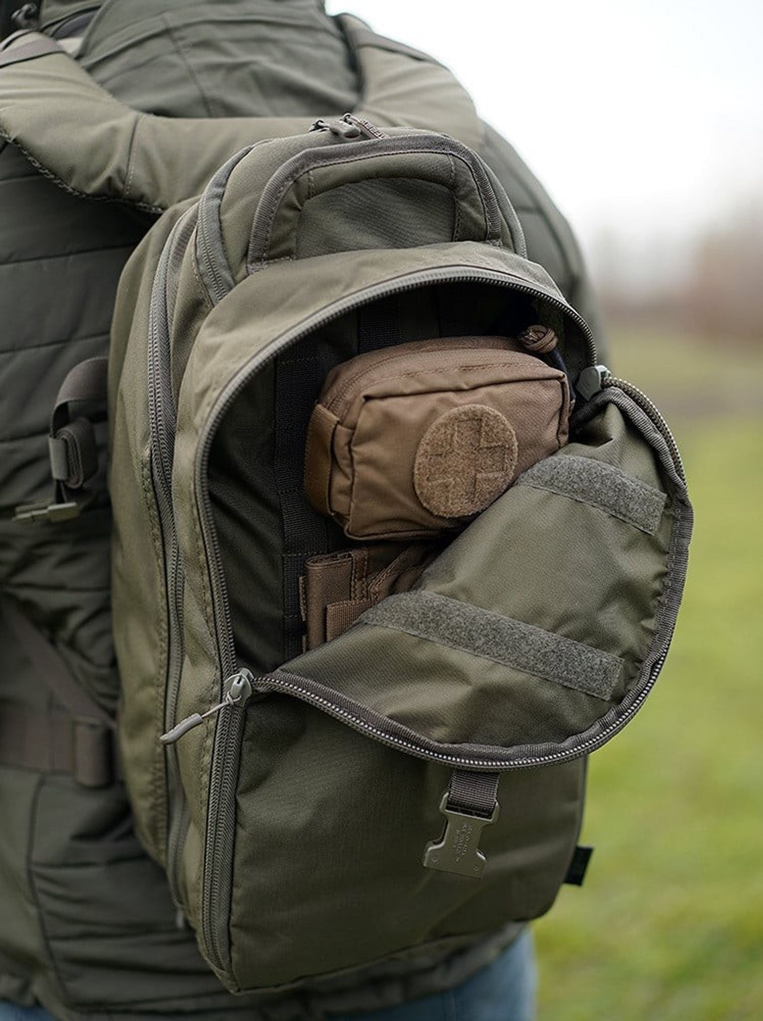 Bushmate Pro har to lynlåsrum. Foran har en lomme med MOLLE-stropper på indersiden til fastgørelse af forskellige lommer. Hovedrummet har et specifikt sted til en 15-tommer bærbar computer.