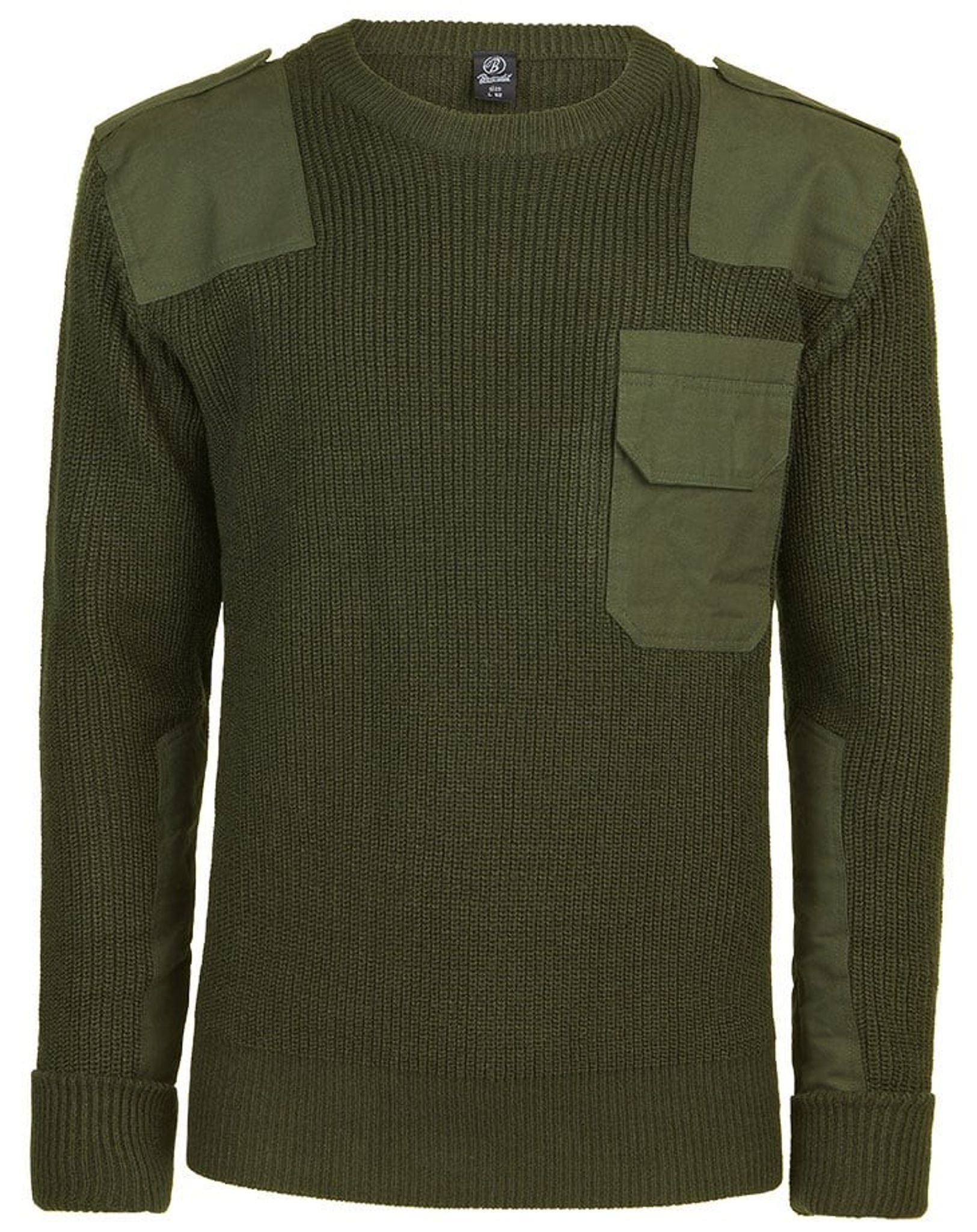 Trøjen har stærke manchetter og lapper over skuldrene og en lomme foran på venstre bryst.