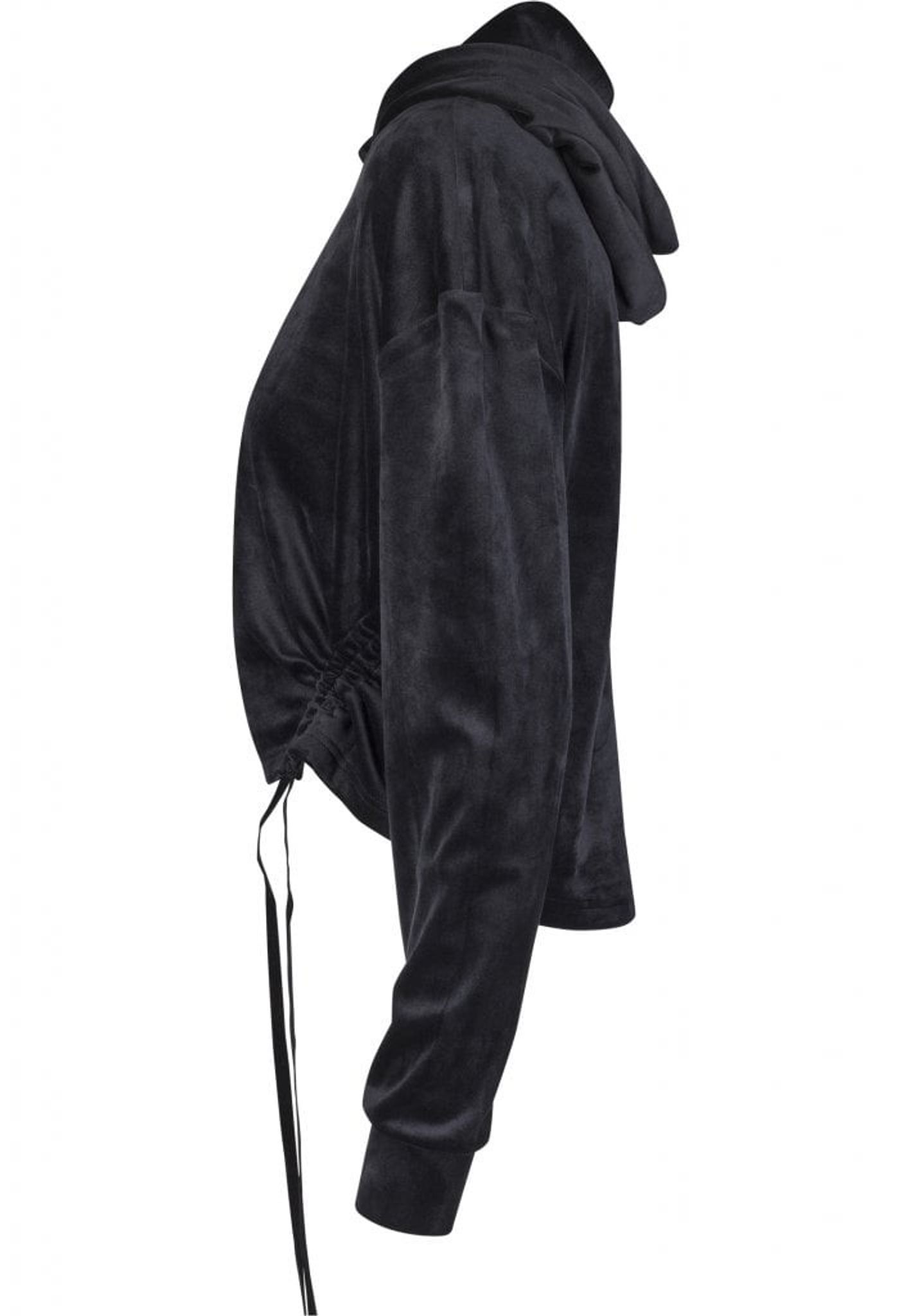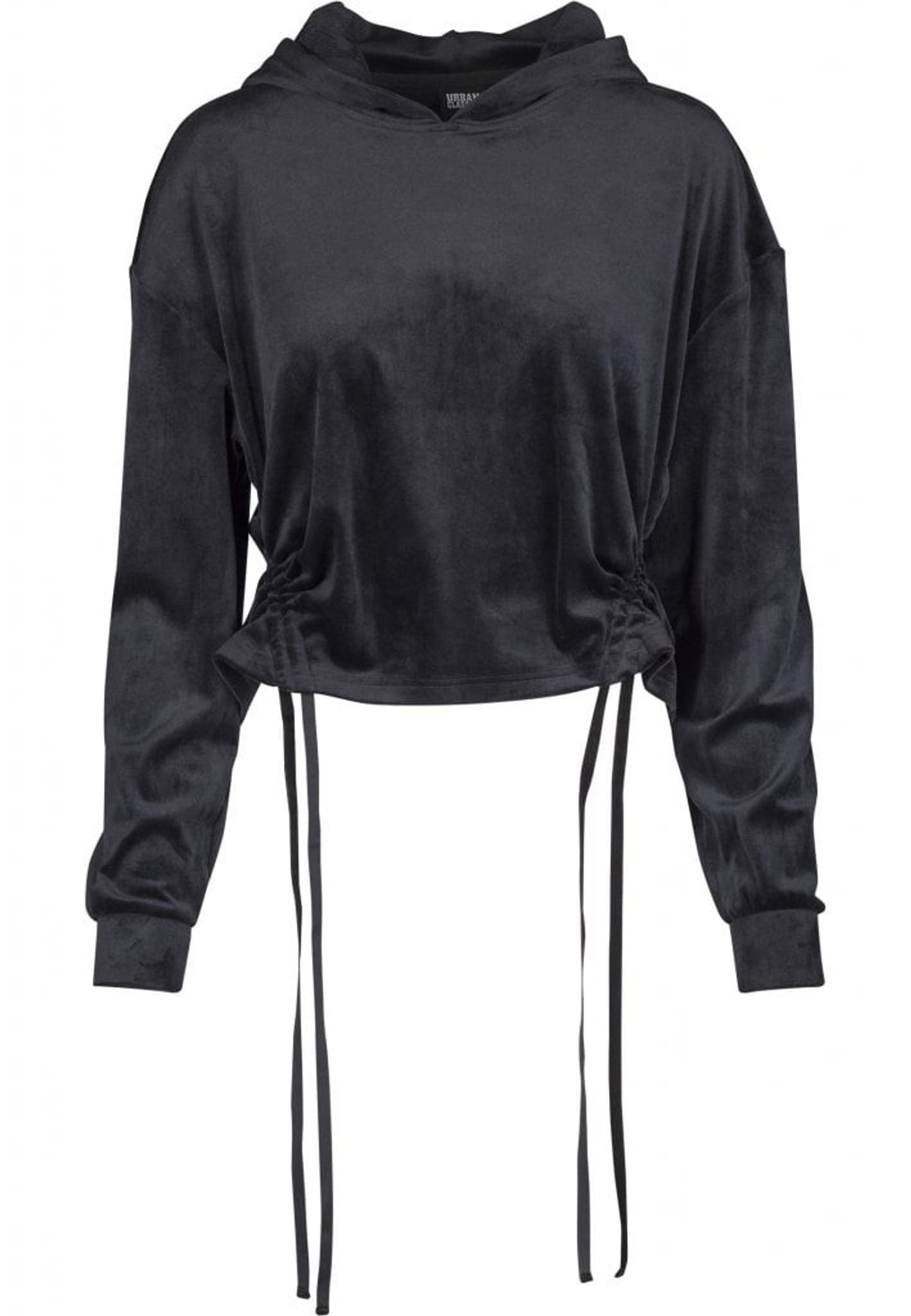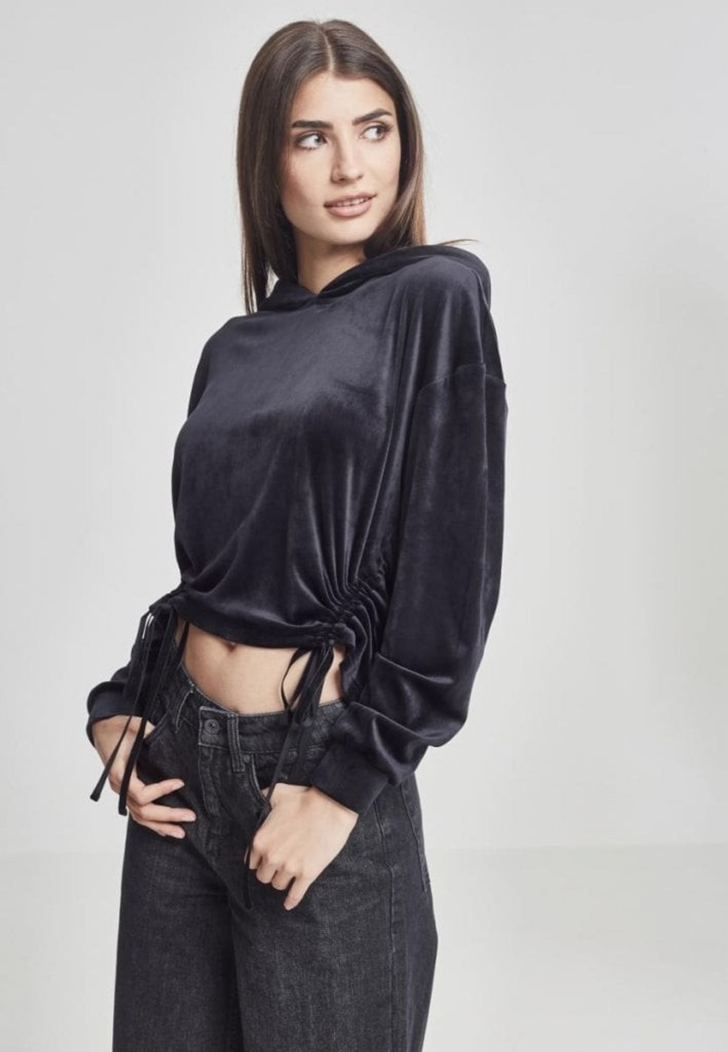 Denne hættetrøje er i en kort oversize model. Skjorten har snørebånd med blørremme på forsiden af trøjen. Strengene kan reguleres forskelligt. Hætten uden snorbånd gør det feminin.