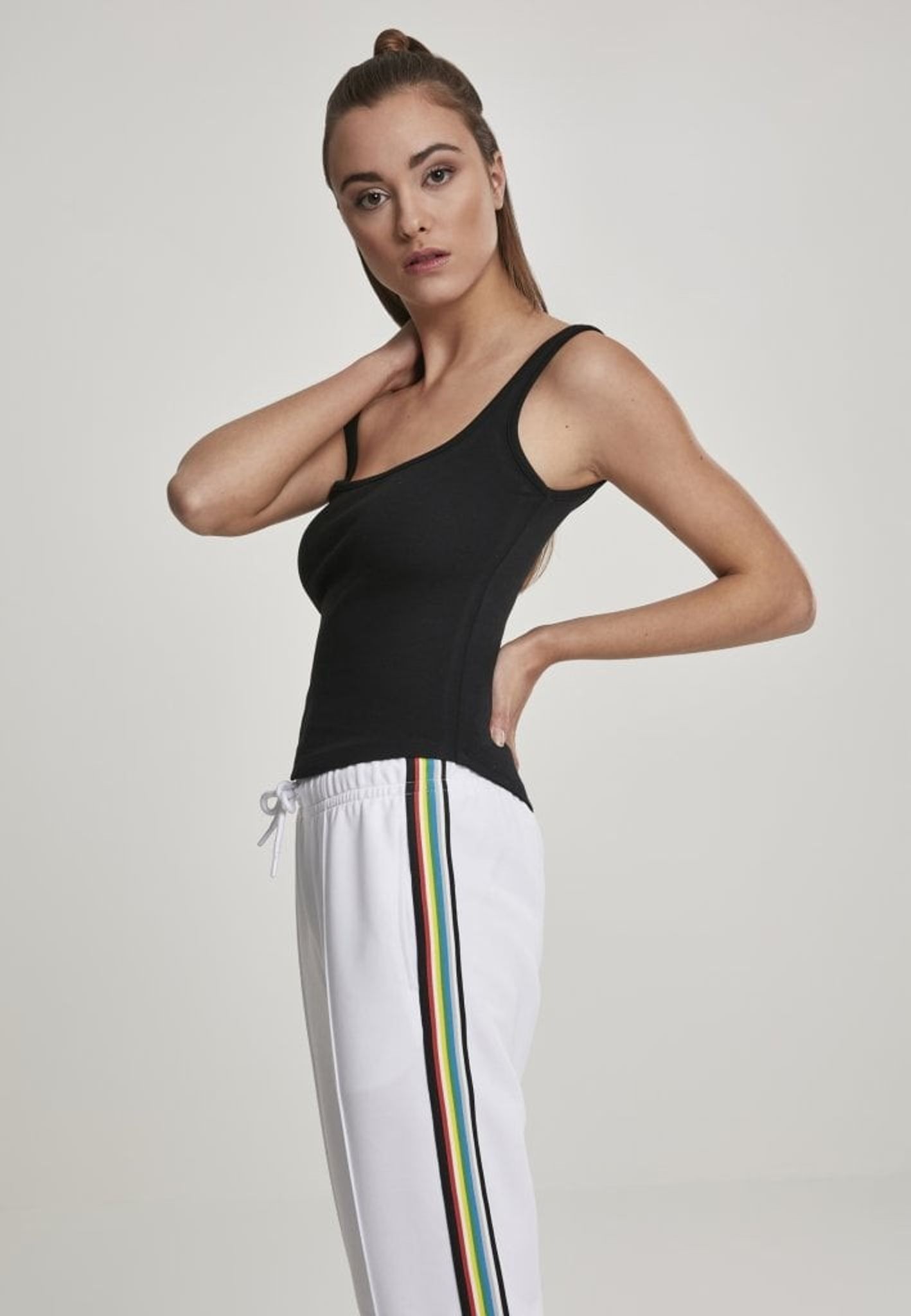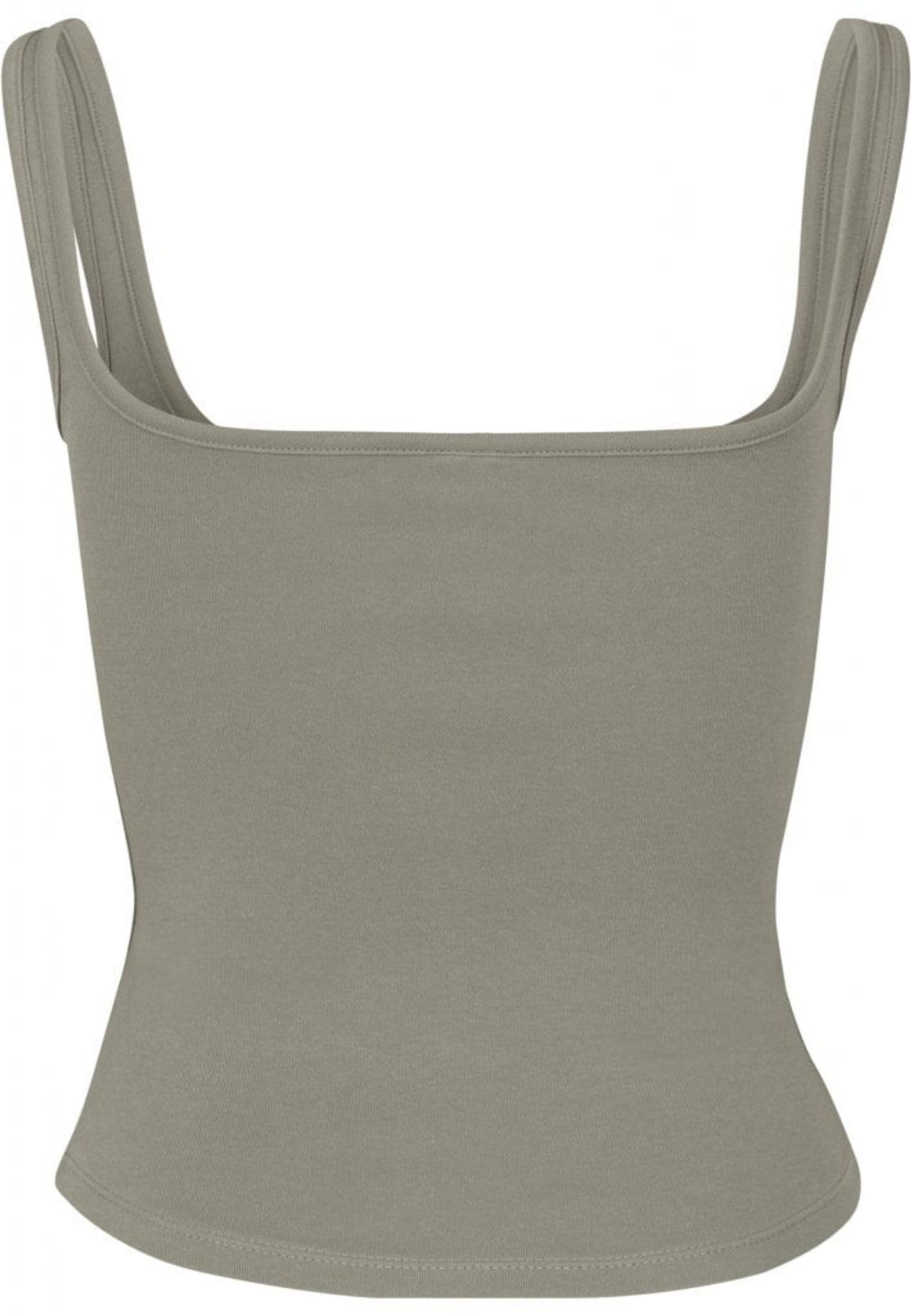 En top med rund bundkant, lidt længere tilbage, og nakke foran og bagpå. Skulderstropperne er brede.