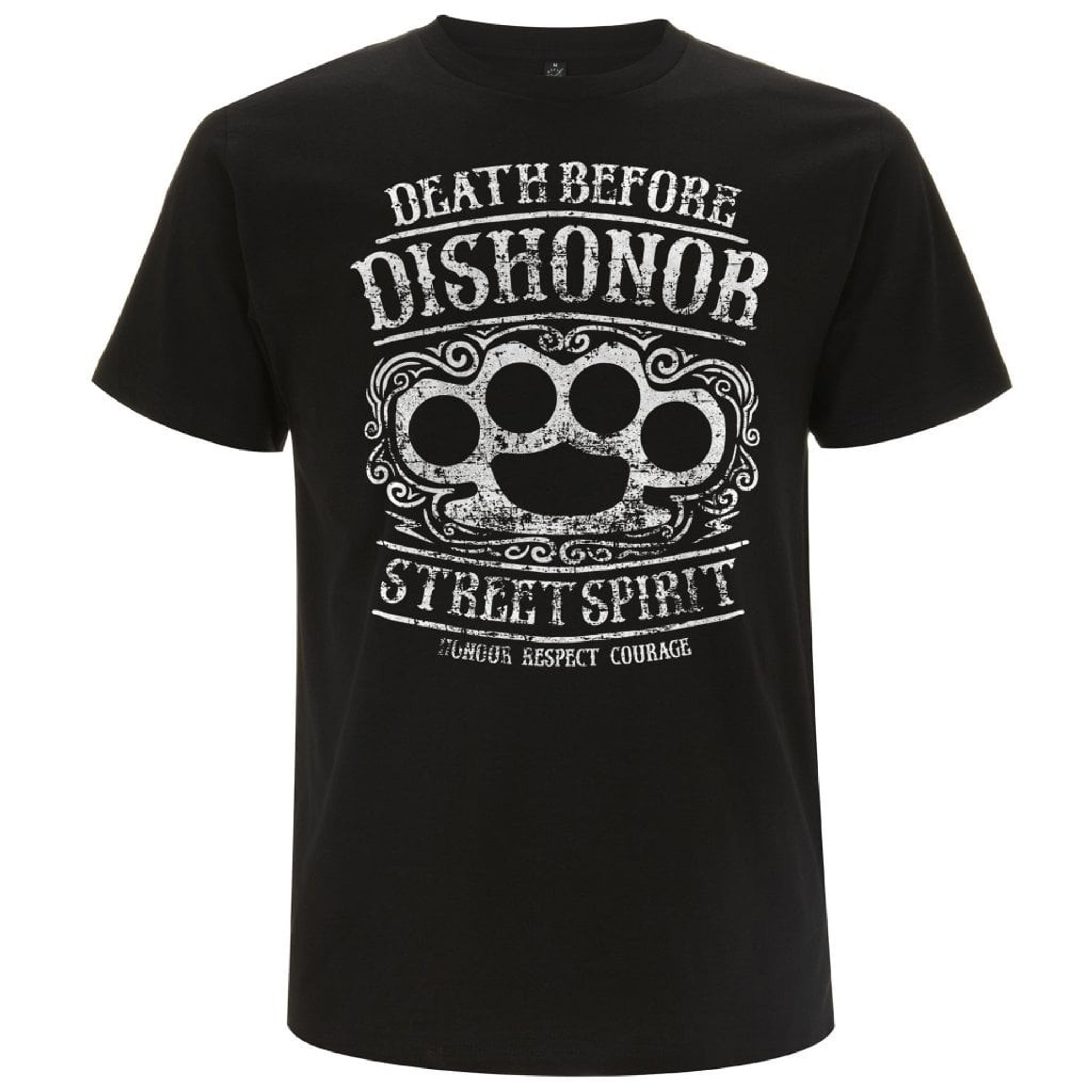 En hård t-shirt med et knudejern indrammet af et mønster og teksten Death Before Dishonor.