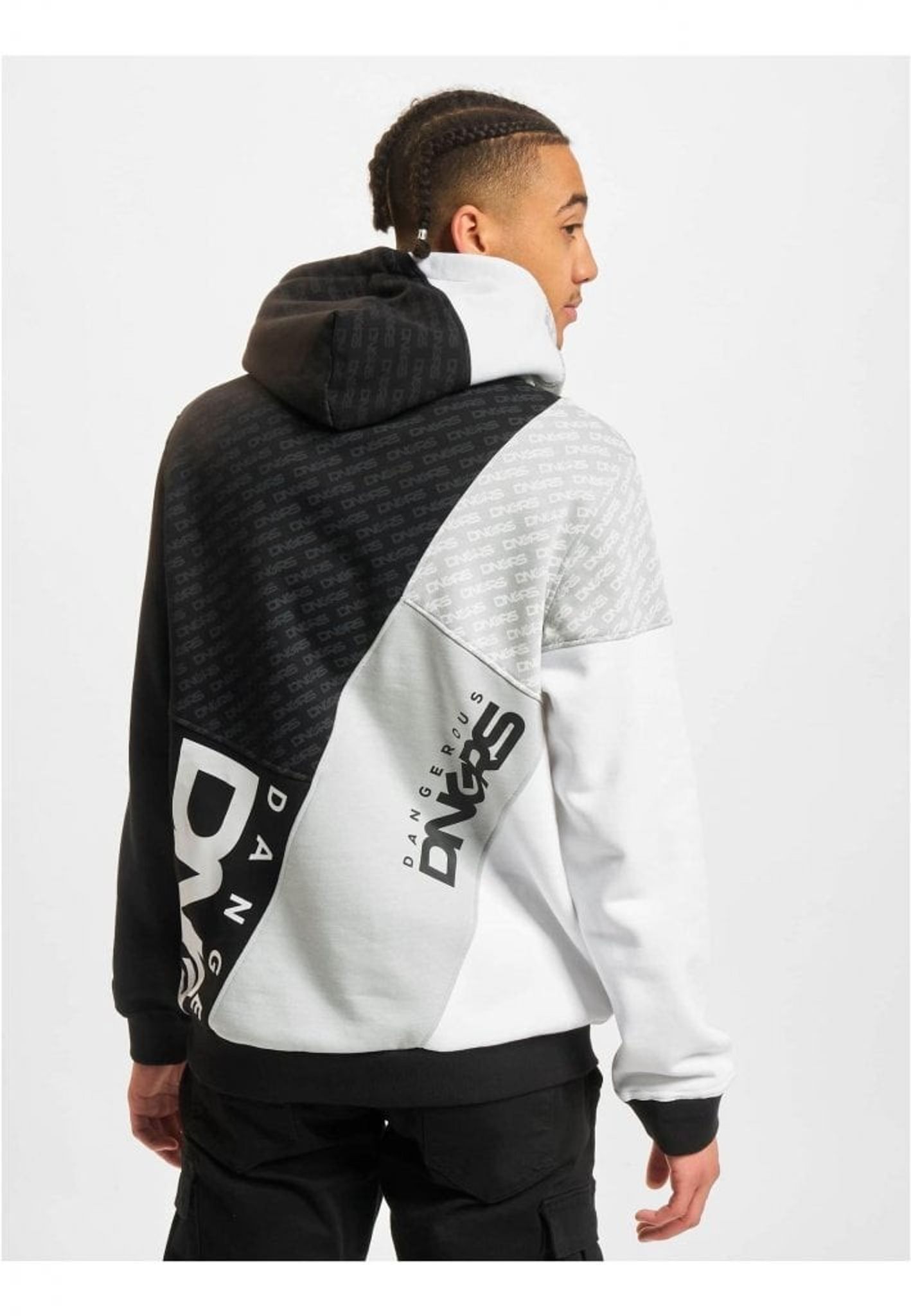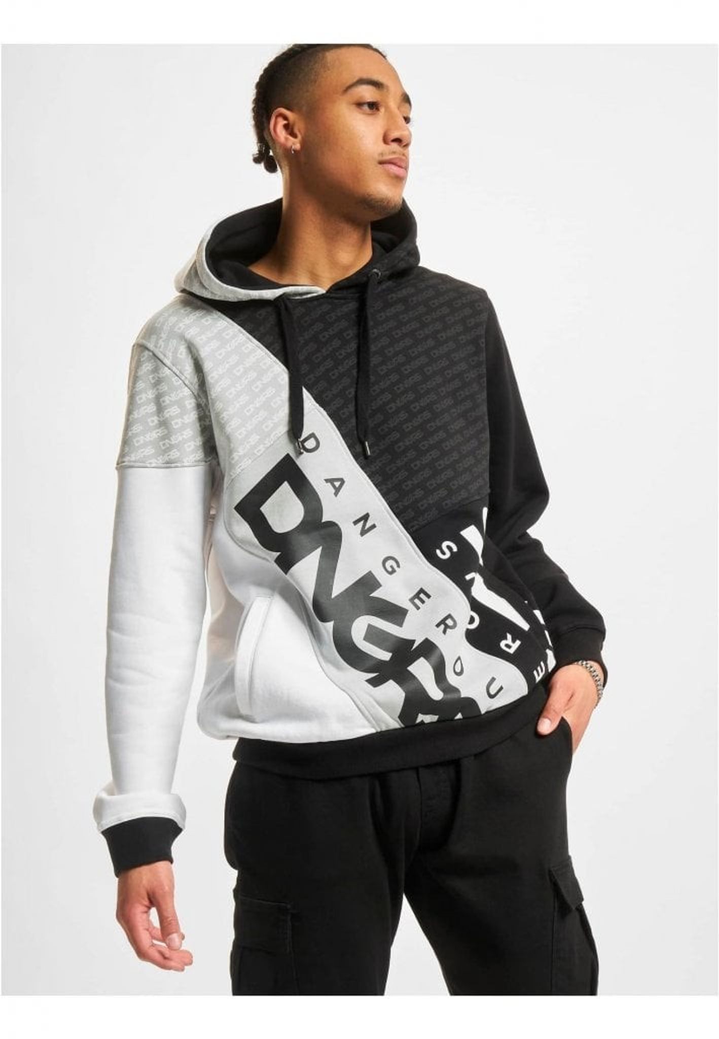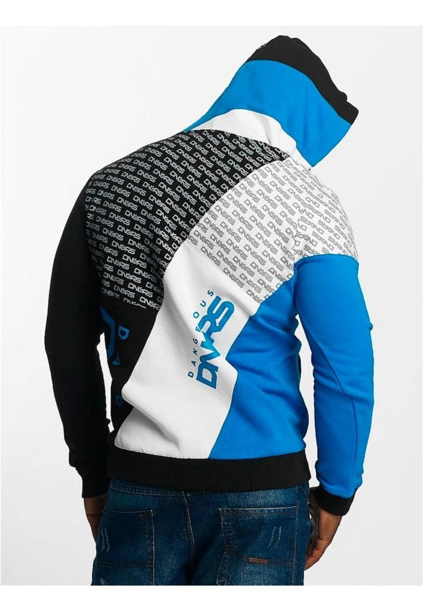 Her har du en rigtig fin hættetrøje fra DNGRS, der kombinerer flere forskellige farver på en og samme hættetrøje med print over det meste af hættetrøjen. Hættetrøjen har almindelige sidelommer i stedet for den klassiske kængurulomme.