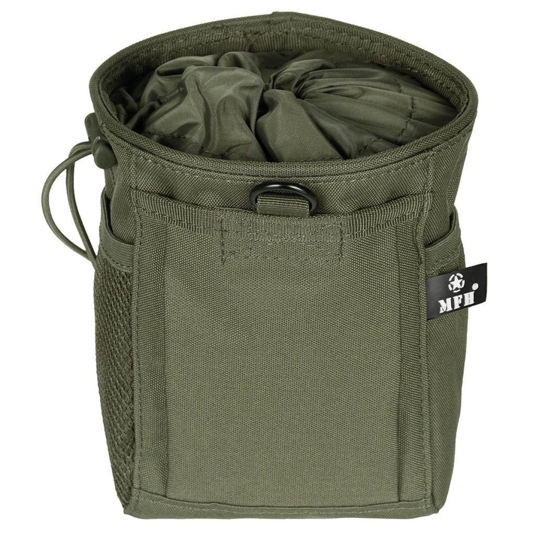 Den forreste lomme er stor og har velcro og en D-ring for at sikre dine ejendele sikkert. Med to Molle Fest -stropper er denne dumppose let at fastgøre til dit Molle -udstyr. Med en diameteråbning på ca. 14 cm og dimensioner på ca. 14 x 20 x 8/14 cm (b x h x d) Denne taske har masser af plads til dine ejendele.