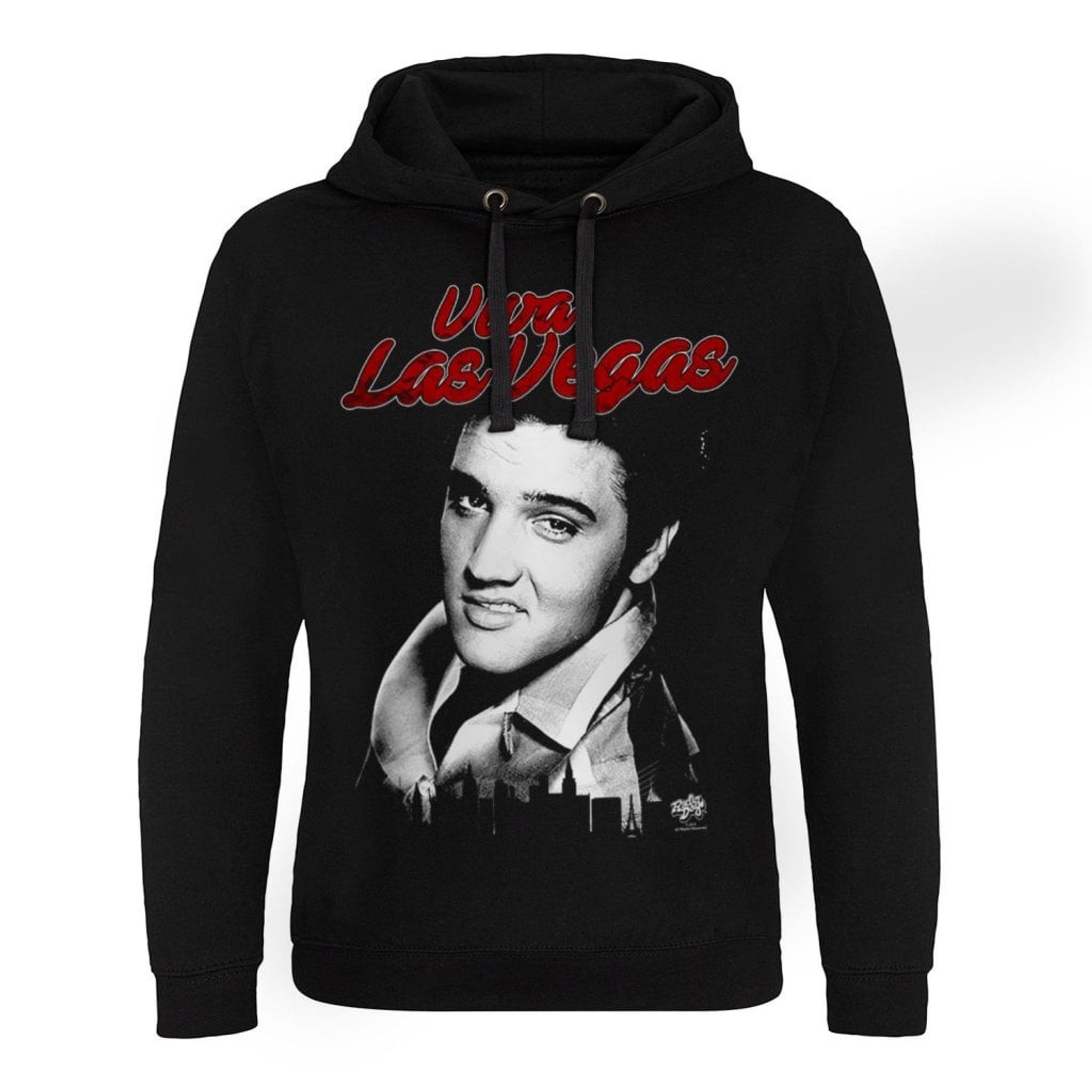 Dejlig sort hættetrøje med hætte og print i hvid / rød. Tekst "Viva Las Vegas" og et grinende Elvis med en skyline i forgrunden.