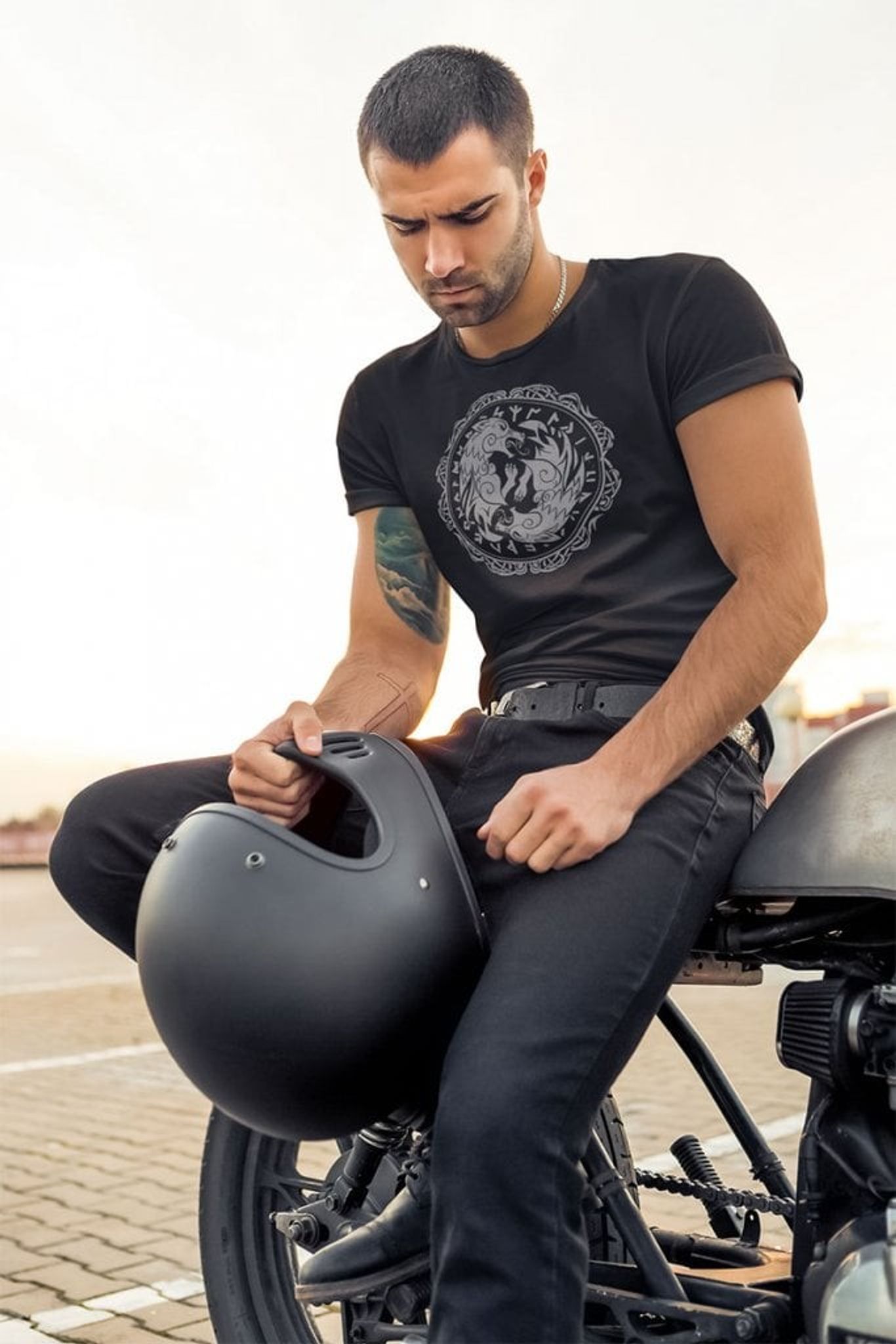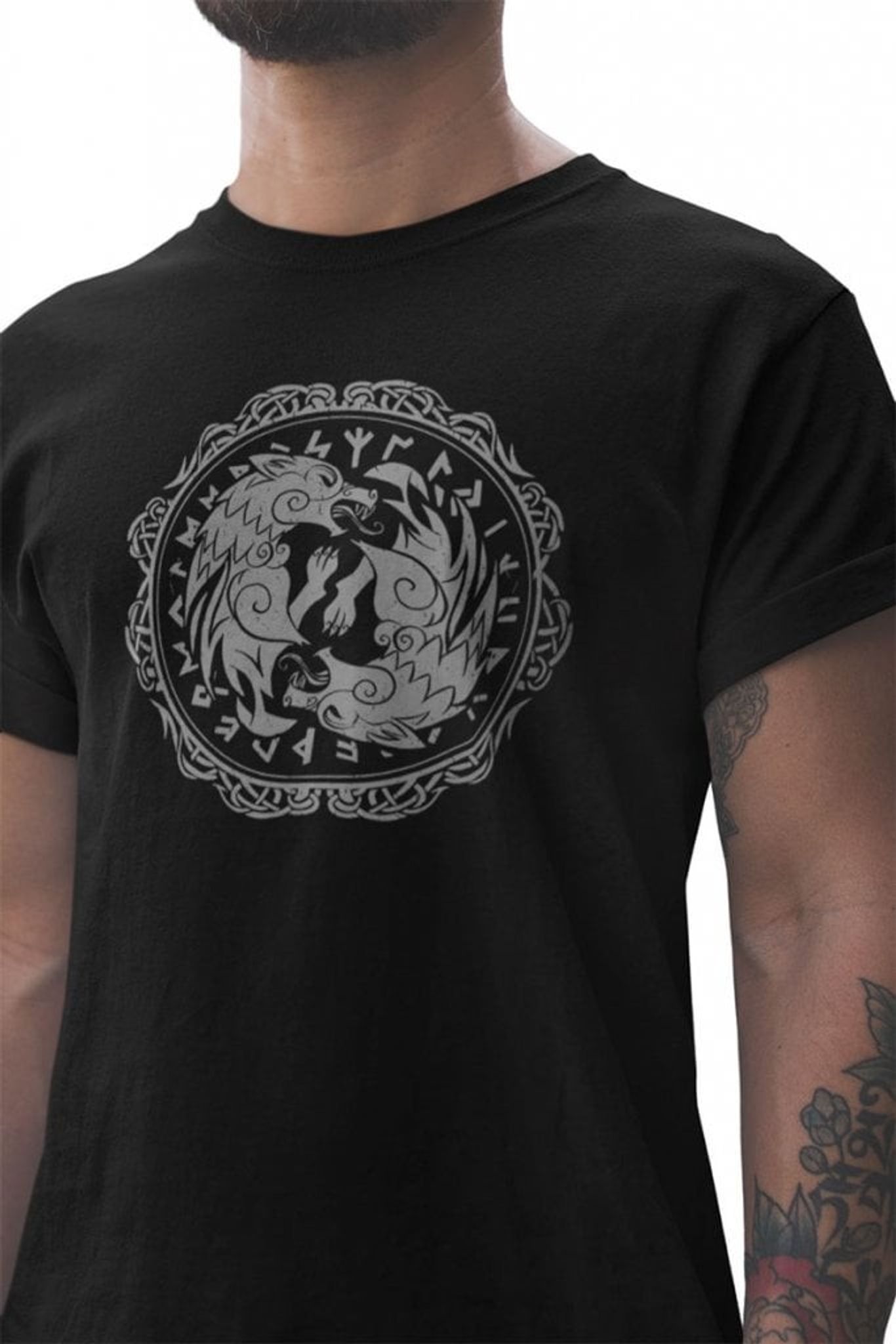 T-shirt med et motiv inspireret af oldnordisk billedkunst med dets slyngede mønster. Runer kan ses i baggrunden og Fenrisulven kan ses i dobbeltversioner foran.