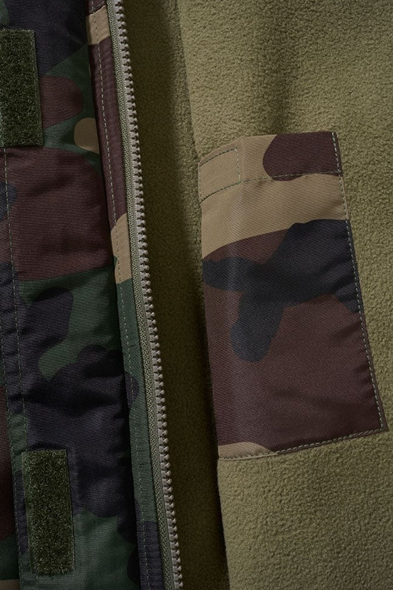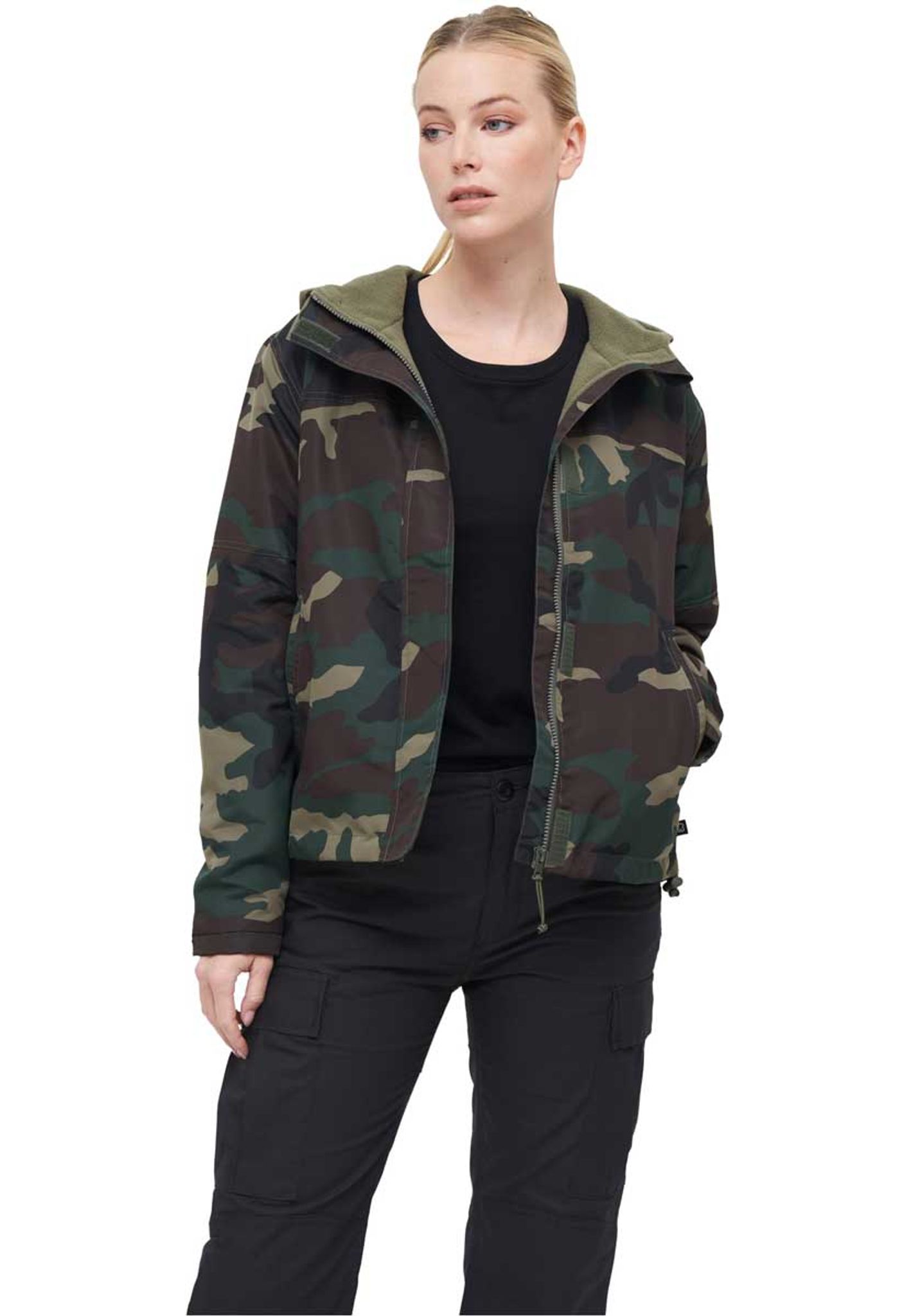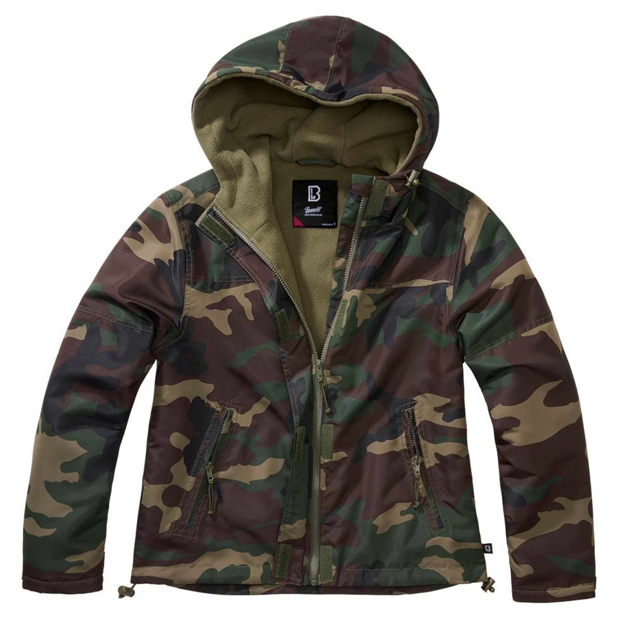 Vindjakke, hvis skal er i den klassiske skovkamouflage, og som tåler både vind og vand. Indersiden er dækket med et varmt fleecestof.