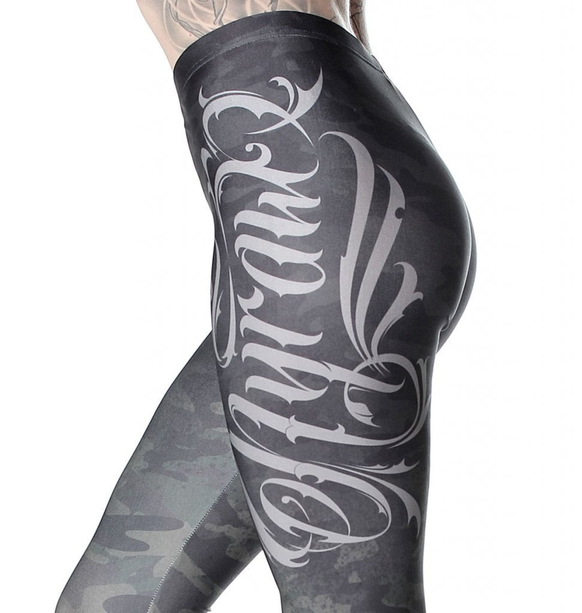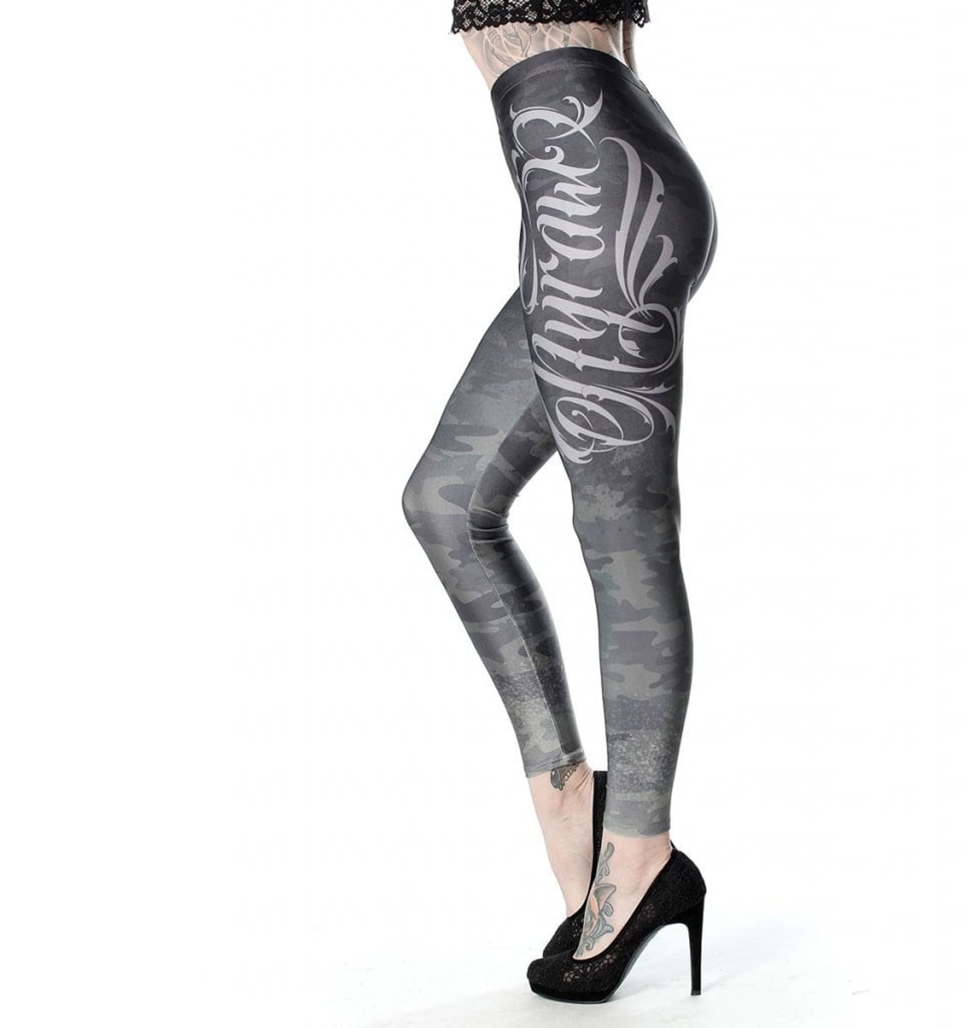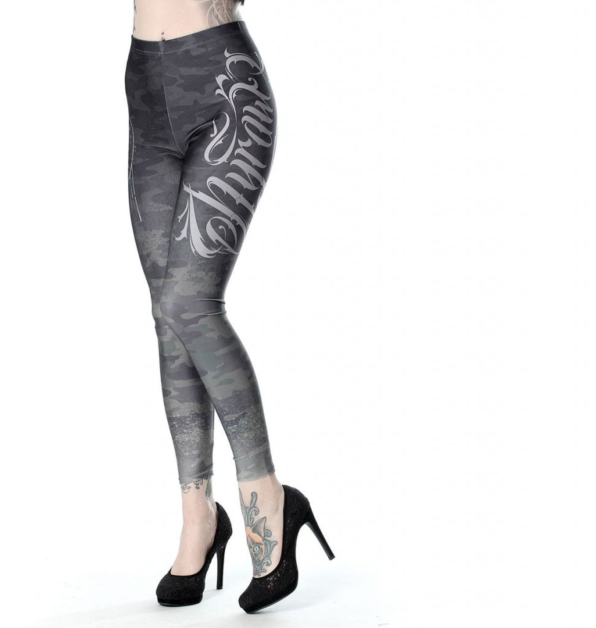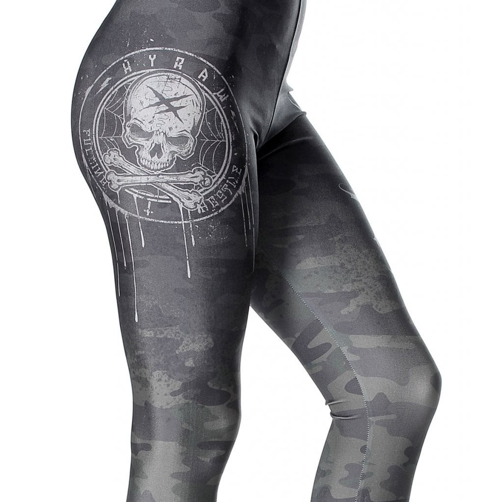 Et par smukt mønstrede leggings i mørk camouflage. På den ene hofte er der et stort Hyraw-logo, og på den anden side står Hyraw i en detaljeret og elegant skrifttype.
