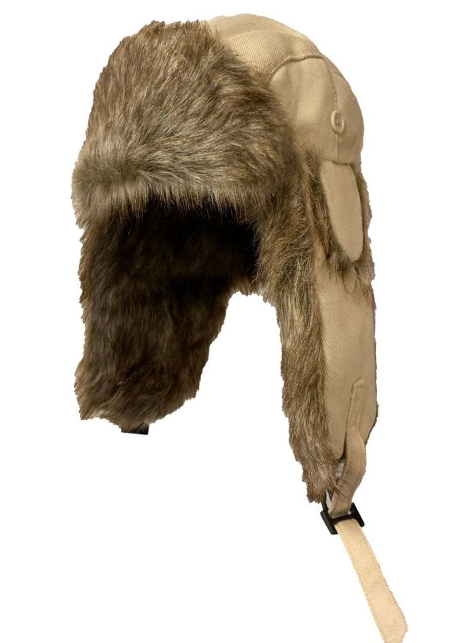 En pelshue med lærred i en cremet hvid skygge og klædt i dejlig pels. Hatten lukkes med en knap.