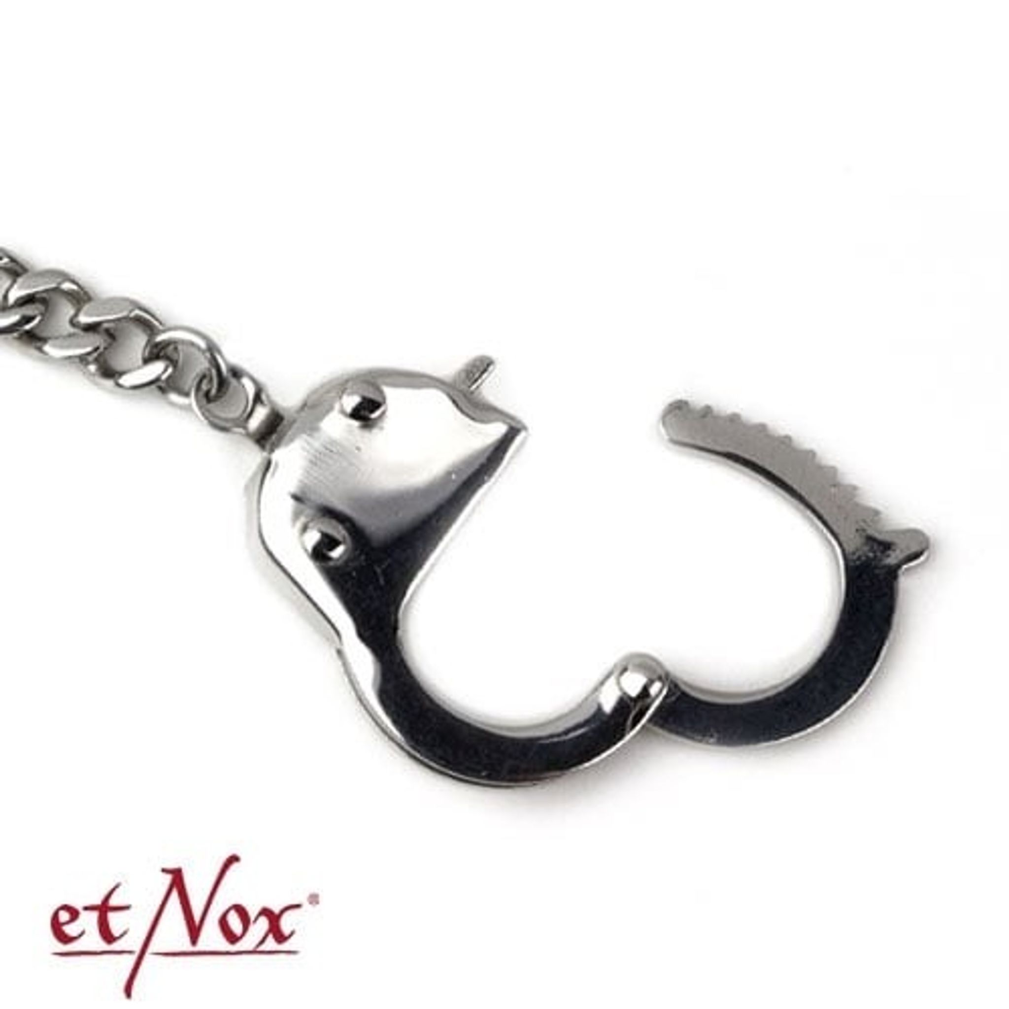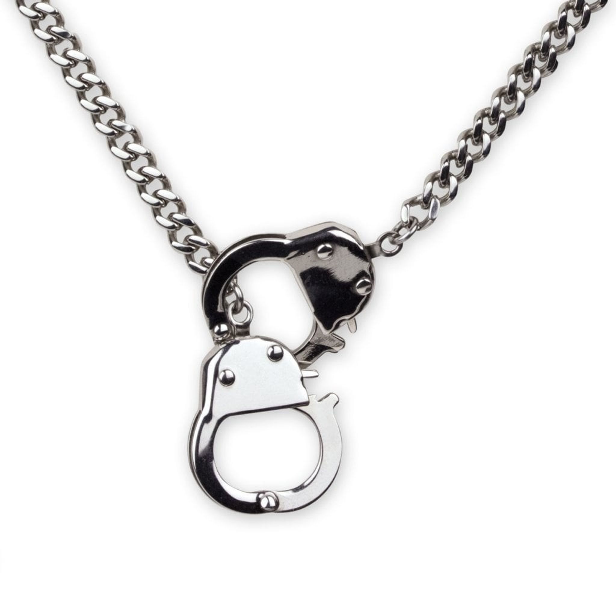 En halskæde i rustfrit stål med et par små håndjern foran. Håndjernene kan fastgøres på forskellige måder.
