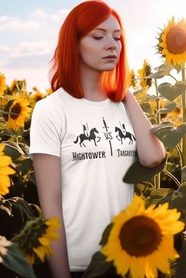 Et dramatisk opgør mellem House Hightower og House Targaryen finder sted på vores motiv for denne pige-T-shirt. To riddere står klar til kamp, som hver repræsenterer deres magtfulde hus. Med et sværdsymbol mellem dem er spændingen på sit højeste, og følelsen af en episk konfrontation er til at tage og føle på.