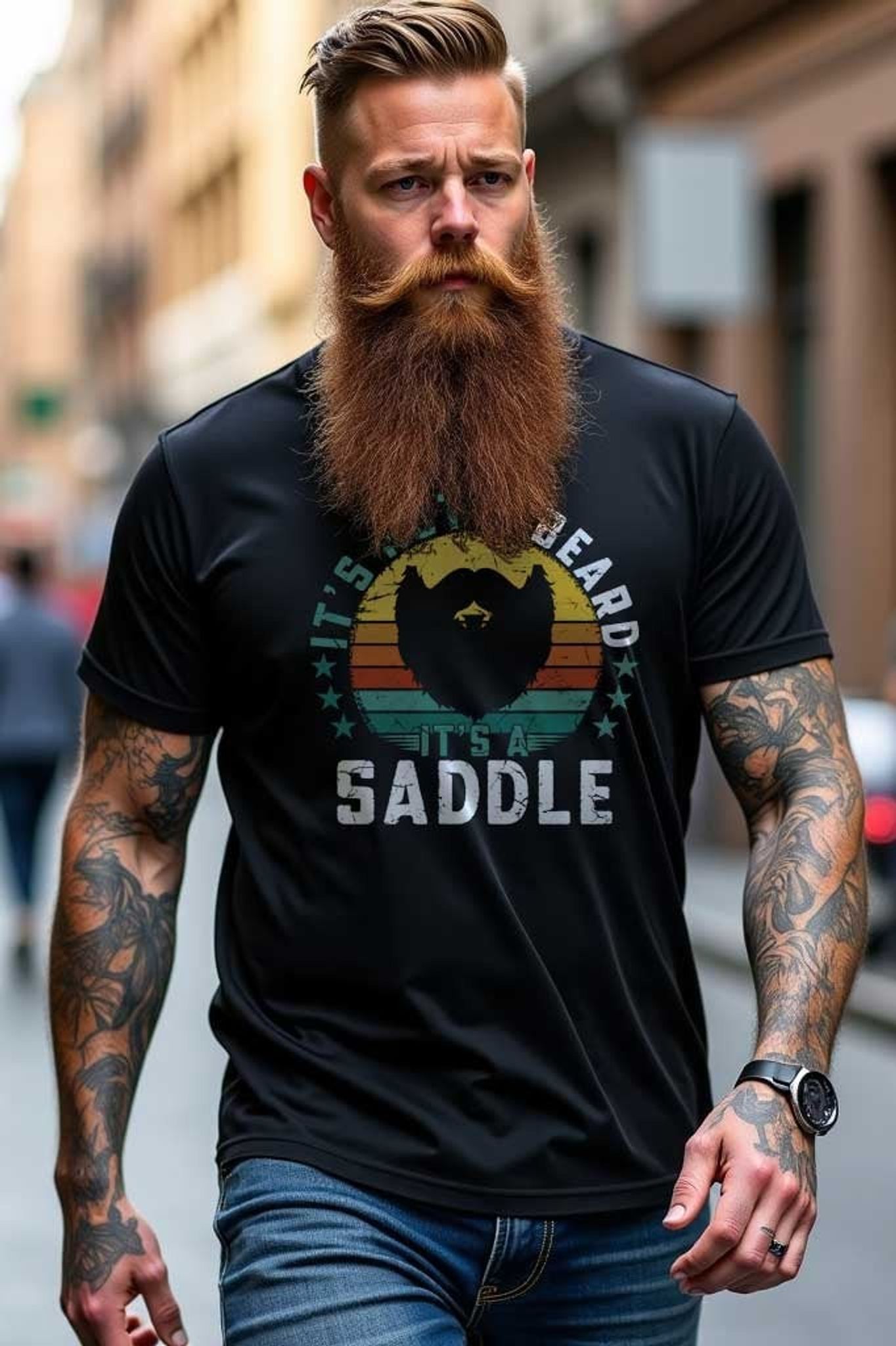 Med teksten "Det er ikke et skæg, det er en sadel", kombinerer den selvtillid med et legende budskab, der med garanti får folk til at smile.