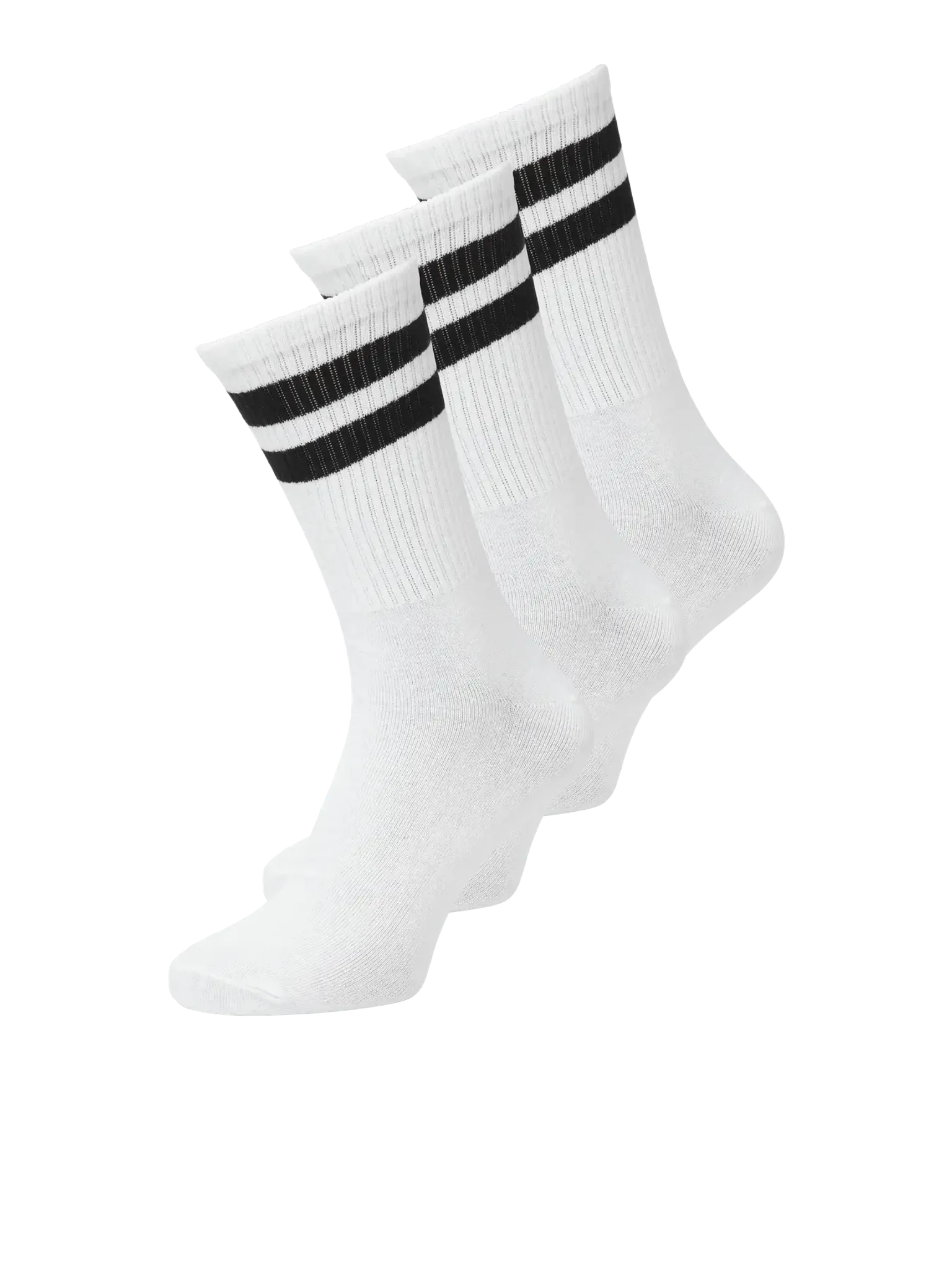 Dessa vita sportstrumpor med svarta ränder kombinerar en klassisk look med hög komfort och funktionalitet. De levereras i ett smidigt 3-pack och är tillverkade i ett mjukt och följsamt material som både andas och ger bra stöd under dagen. Den ribbade skaften gör att strumporna sitter på plats även under aktivitet, medan de kontrasterande ränderna upptill ger en sportig retrokänsla som lyfter hela outfiten.