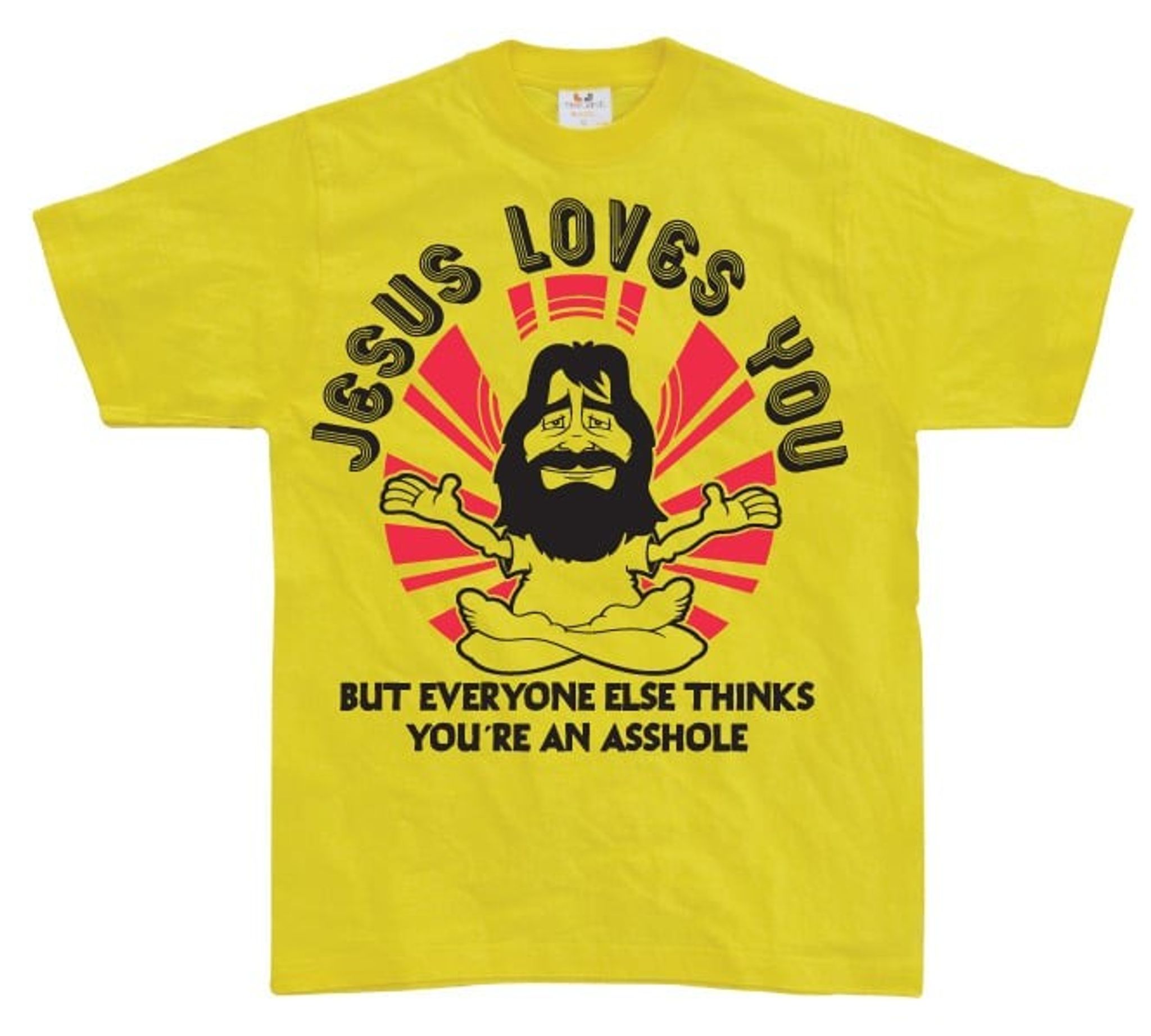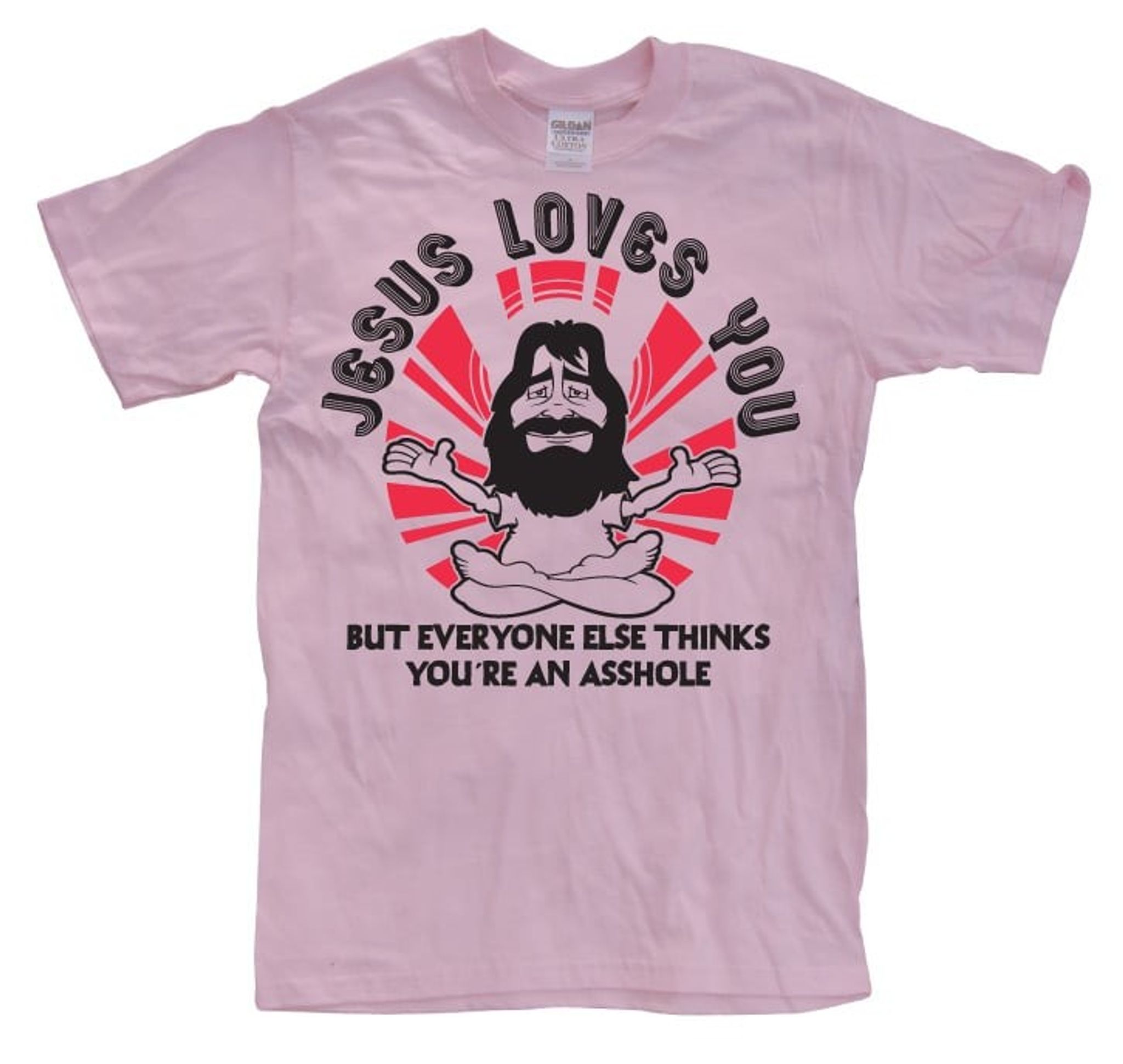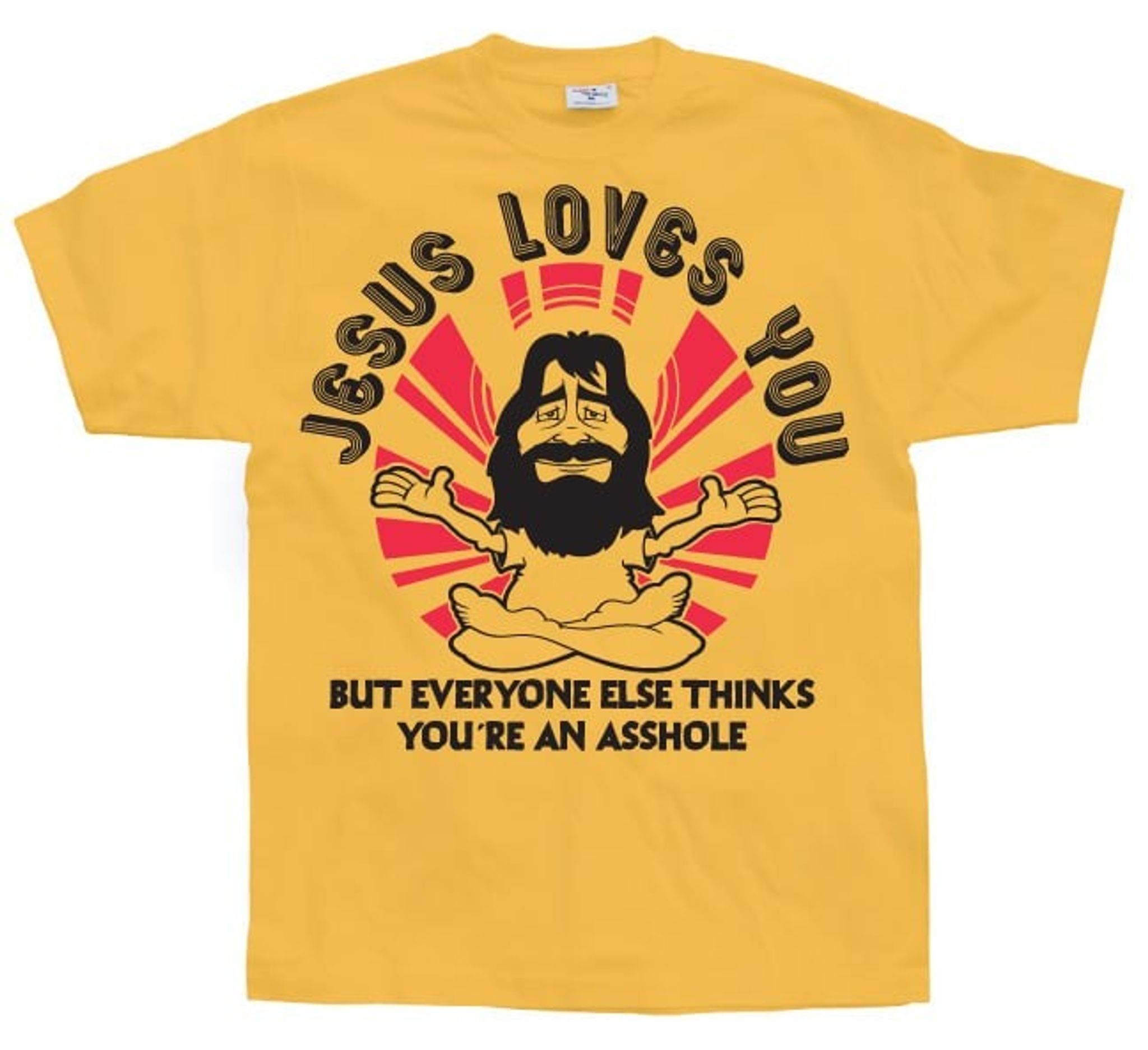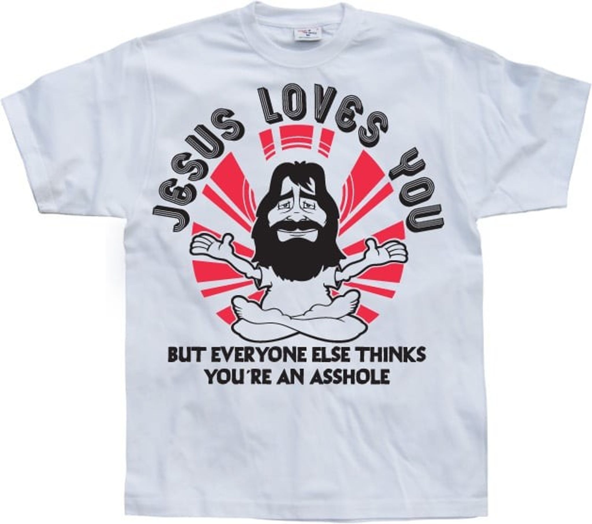 Denne humoristiske t-shirt er perfekt til dem, der kan lide at have det sjovt. Teksten "Jesus elsker dig. Men alle andre tror, at du er en røvhul." Giver et noget ironisk og legende touch til dit tøj. Hvem ved, måske får du endda nogle grin eller nikker fra forbipasserende.