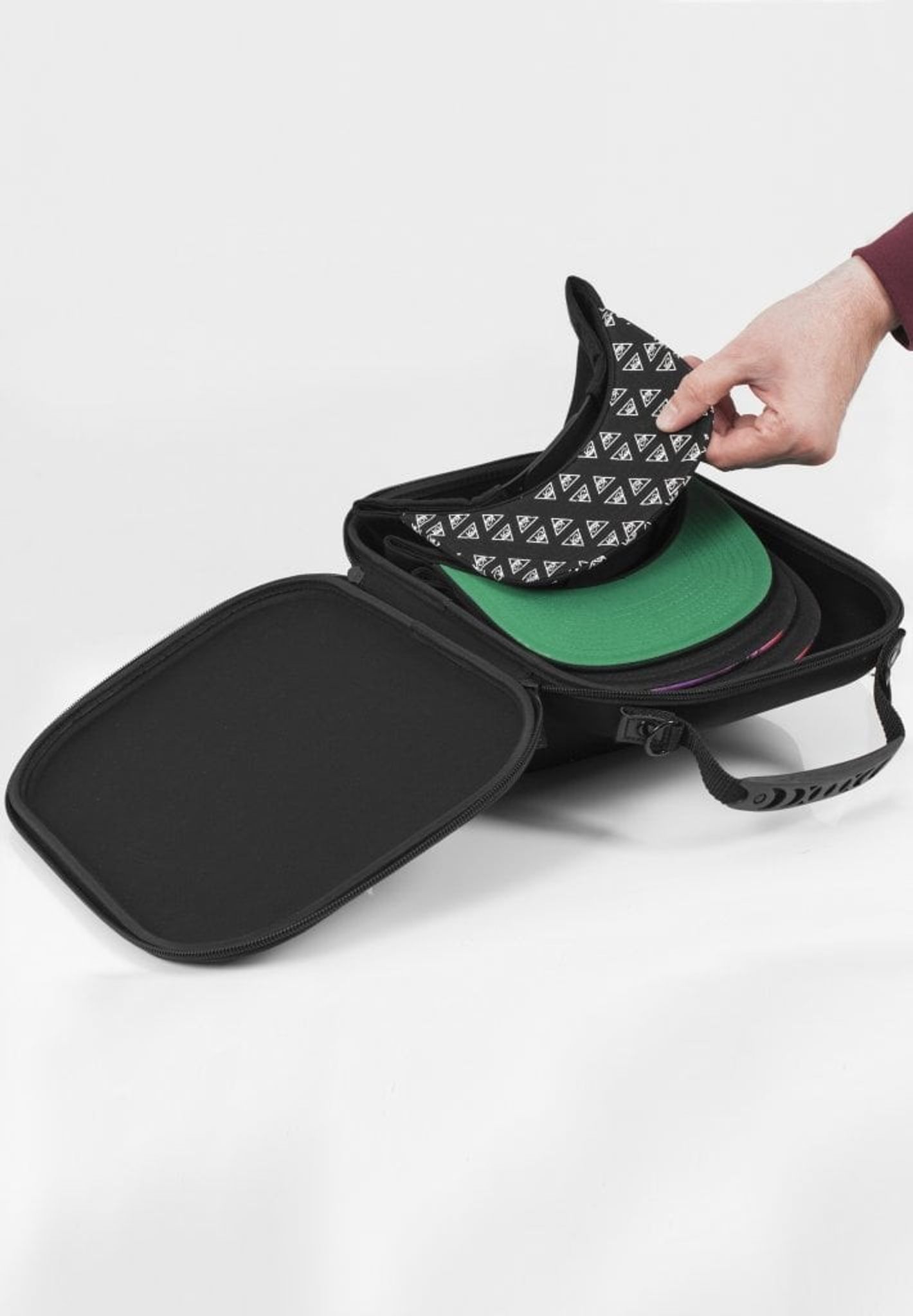 FLEXFIT kaskettaske er den perfekte ledsager til alle kasket-entusiaster! Tasken er designet til sikker opbevaring og beskyttelse af op til 6 hætter og er lavet af et holdbart og slagfast EVA-materiale. Den dobbelte lynlåslukning gør den nem at åbne, og to metalringe gør, at den nemt kan fastgøres til en kuffert eller rygsæk. For ekstra bekvemmelighed har tasken også 6 løkker til ventilation og gummierede håndtag for et behageligt greb under rejsen. Med sit slanke design og cool logo-branding er FLEXFIT Cap Carrier den perfekte måde at opbevare og rejse med dine kasketter.