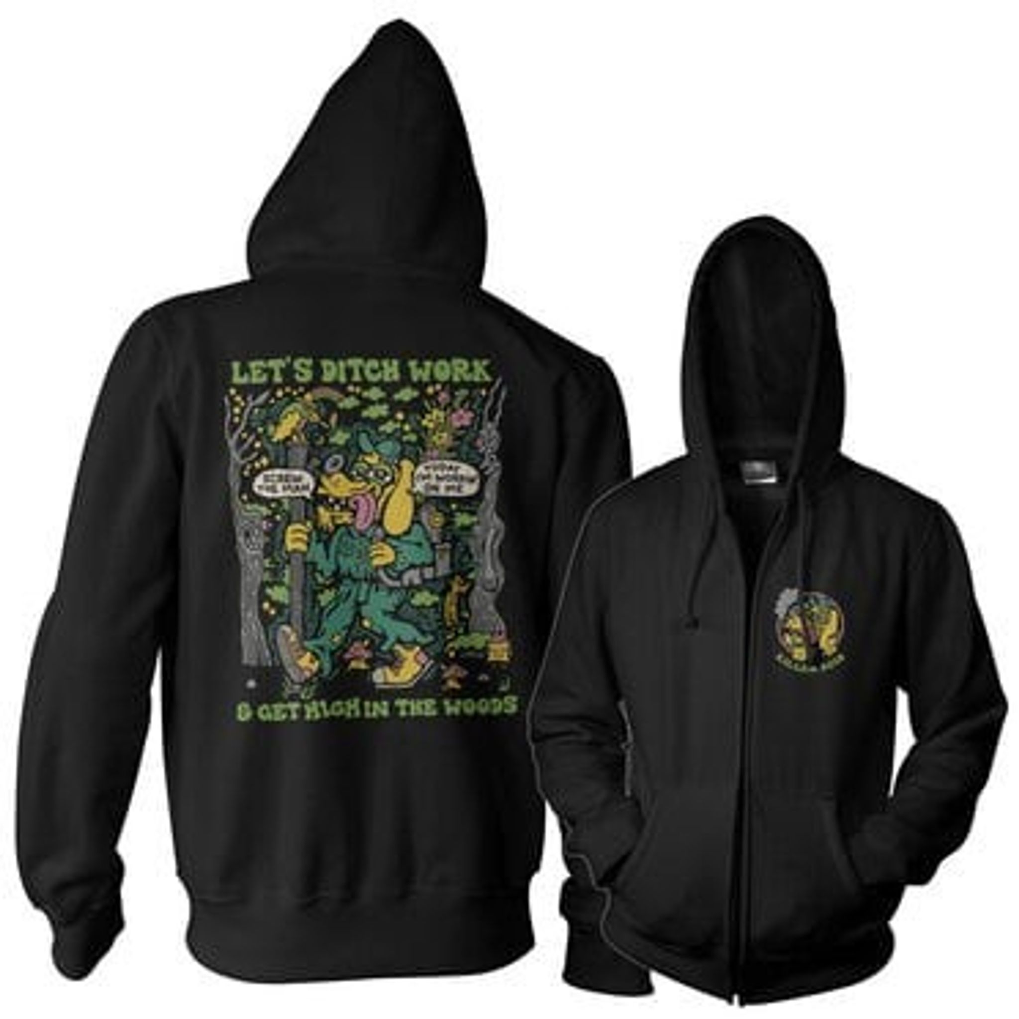 Men det er på bagsiden, at den virkelige magi sker. Her pryder en tegneseriefigur, klædt i grønne overalls, et myldrende skovmiljø. Med sætninger som "Let's ditch work & get high in the woods" og "Screw the man - Today I'm workin' on me" inviterer motivet til en rebelsk og frihedssøgende attitude.
