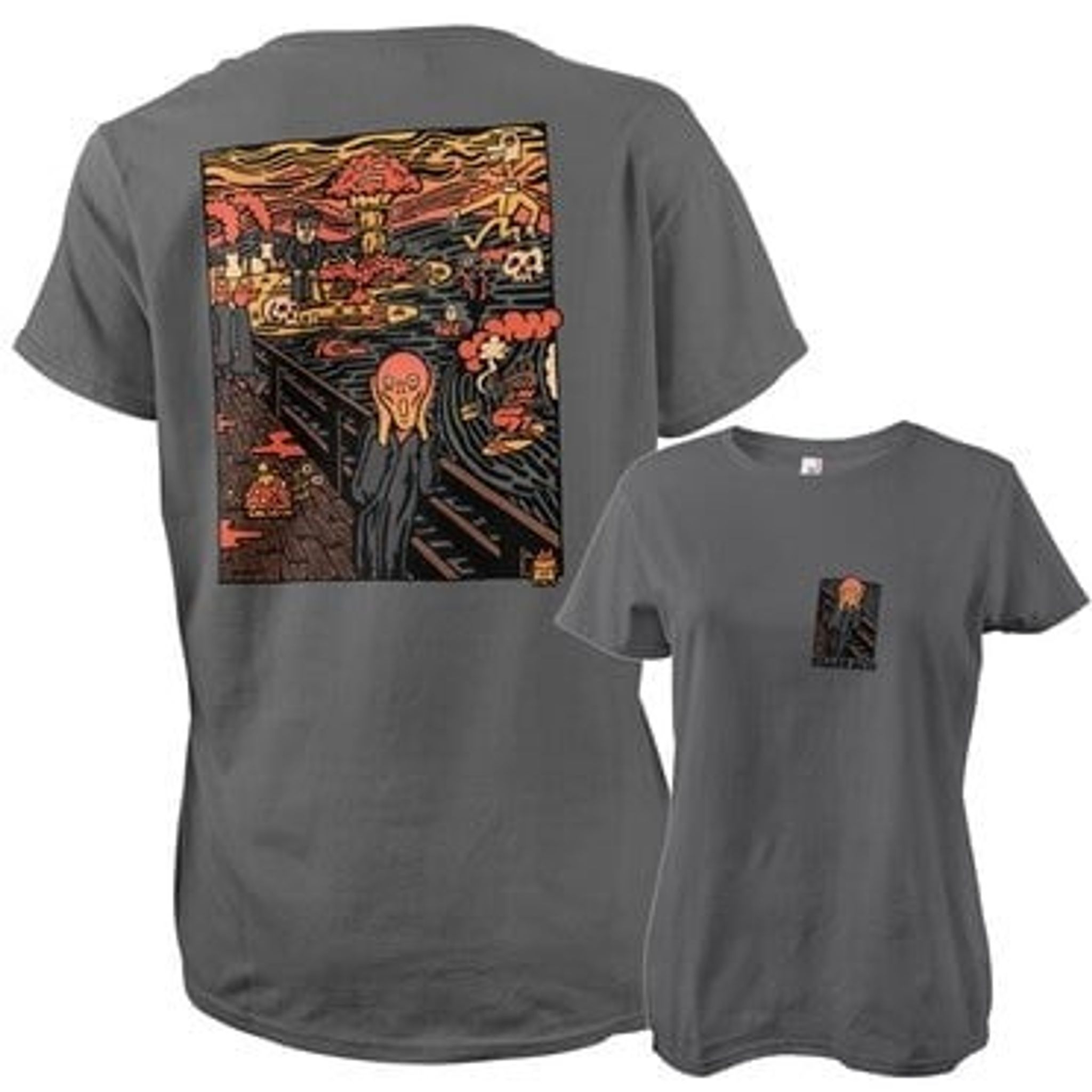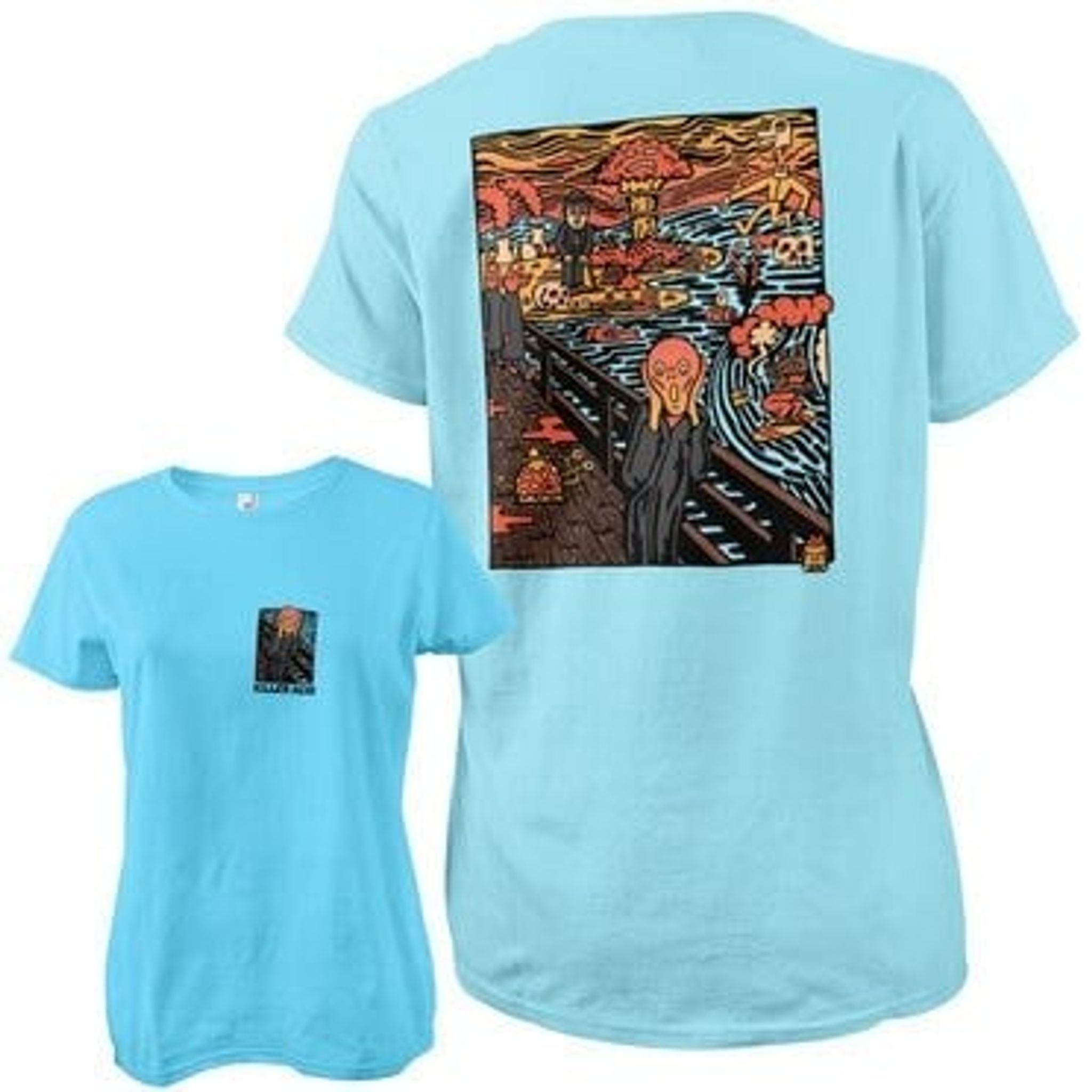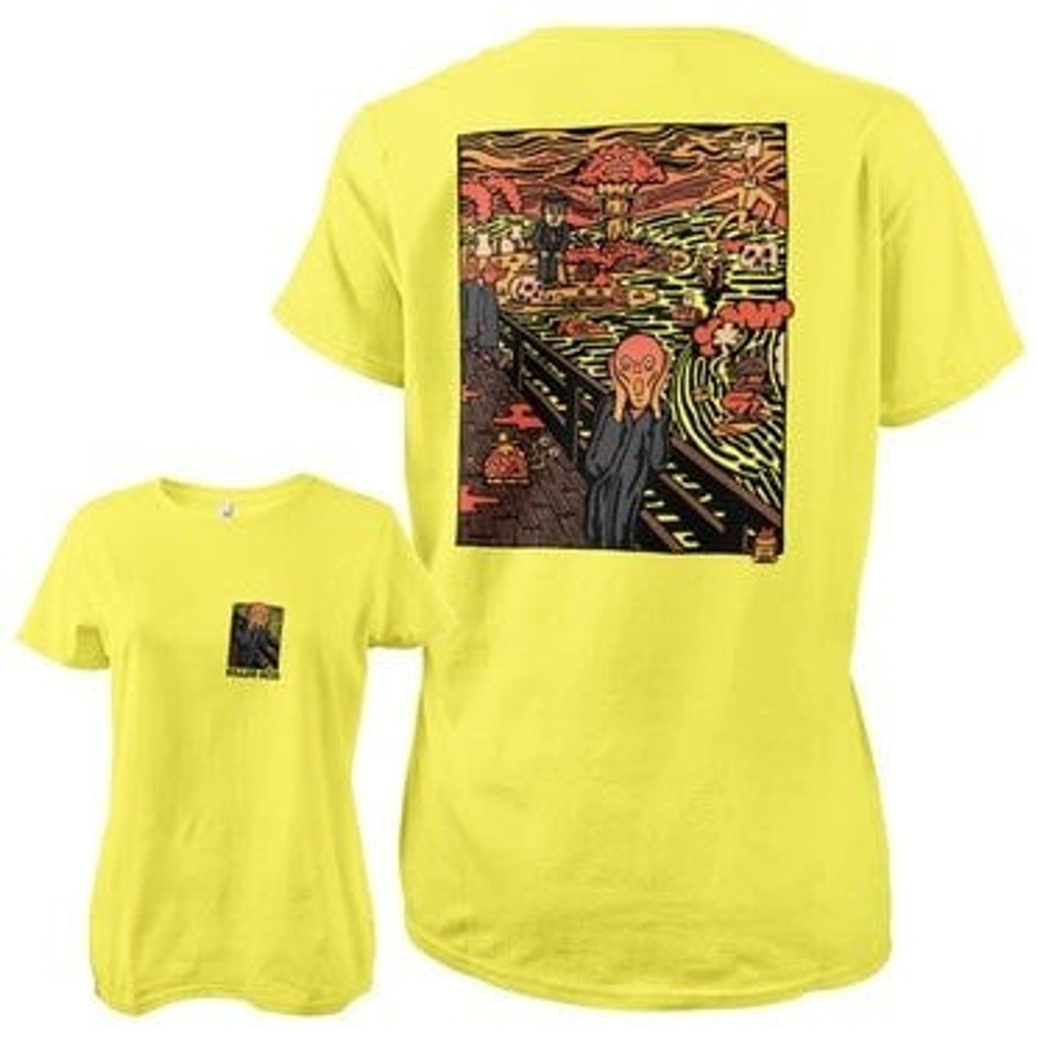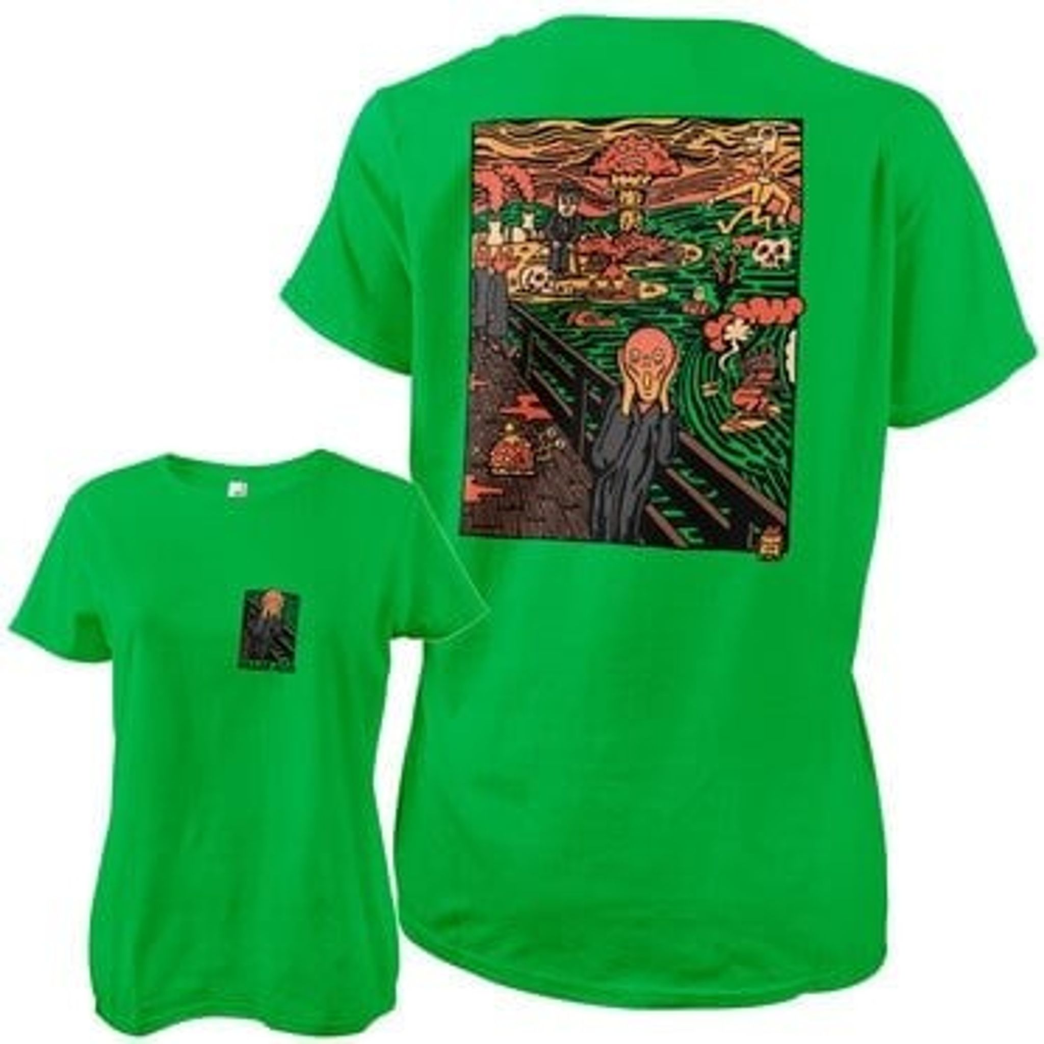Bagsiden af t-shirten tager os med på en farverig rejse gennem et fantastisk landskab, hvor atomeksplosioner og rumvæsener sameksisterer med en række bizarre elementer.