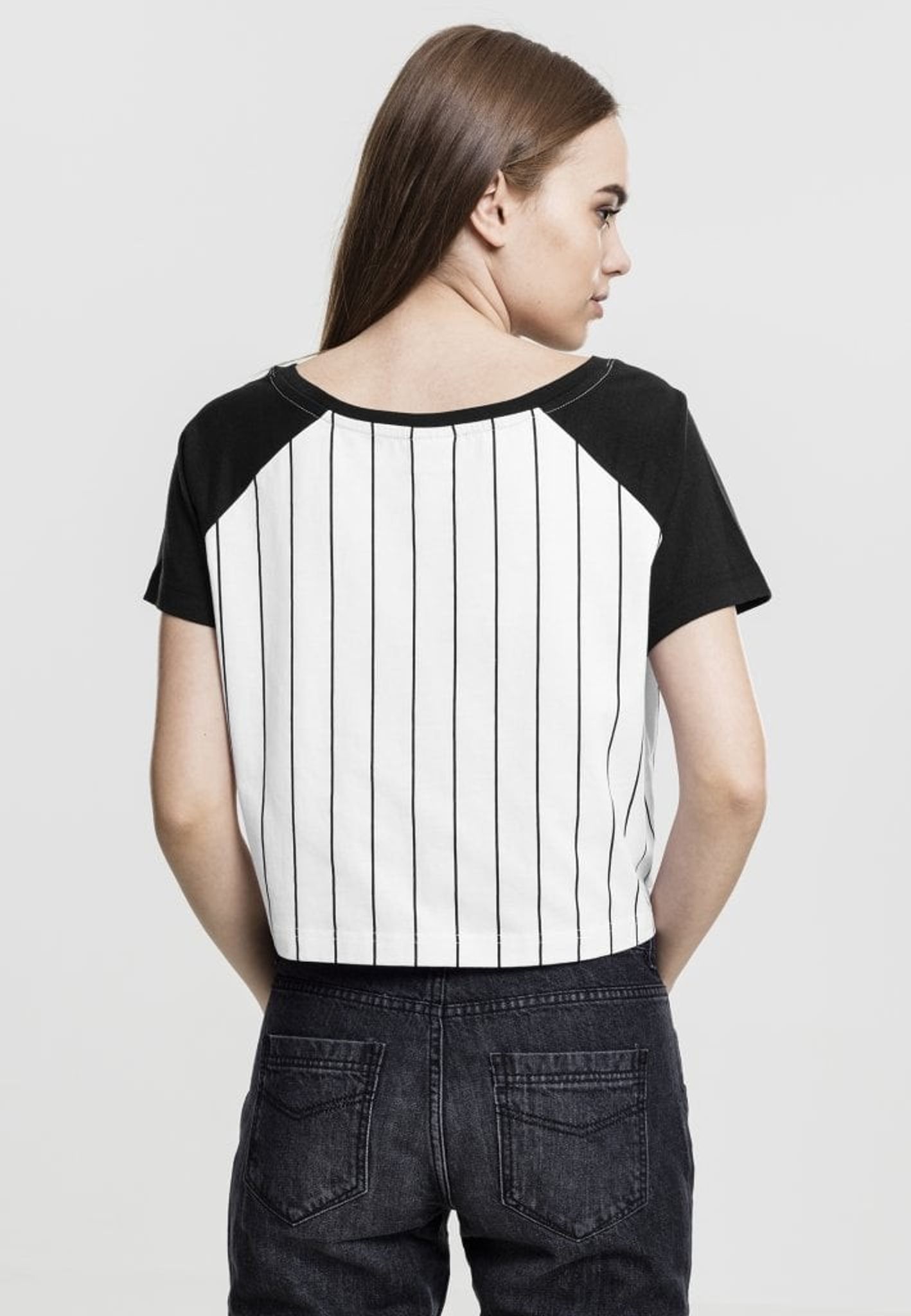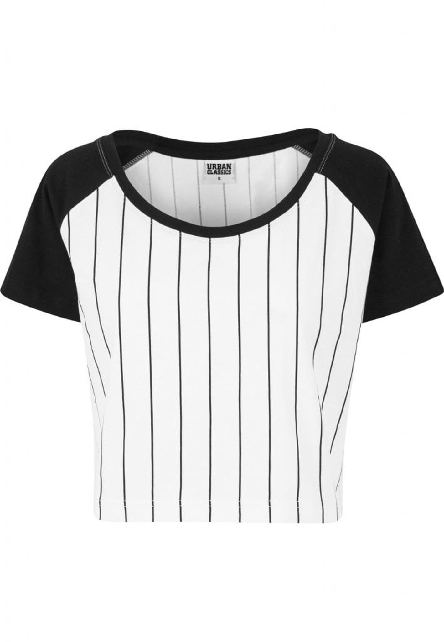 Dette er en kort baseballtrøje, sort og hvid med sorte striber.