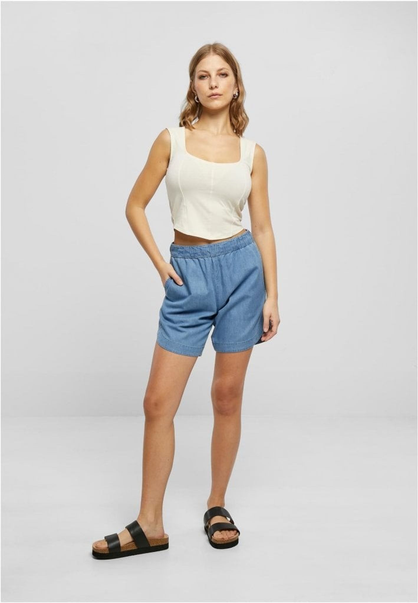 Dame-corsage-toppen er designet med en slim pasform og har tre splitsømme foran, hvilket giver den et klassisk corsage-look. Toppen har en afrundet kant, der tilspidser til et punkt, mens halsudskæringen har en oval form. De brede skulderstropper på toppen sidder behageligt på skuldrene.