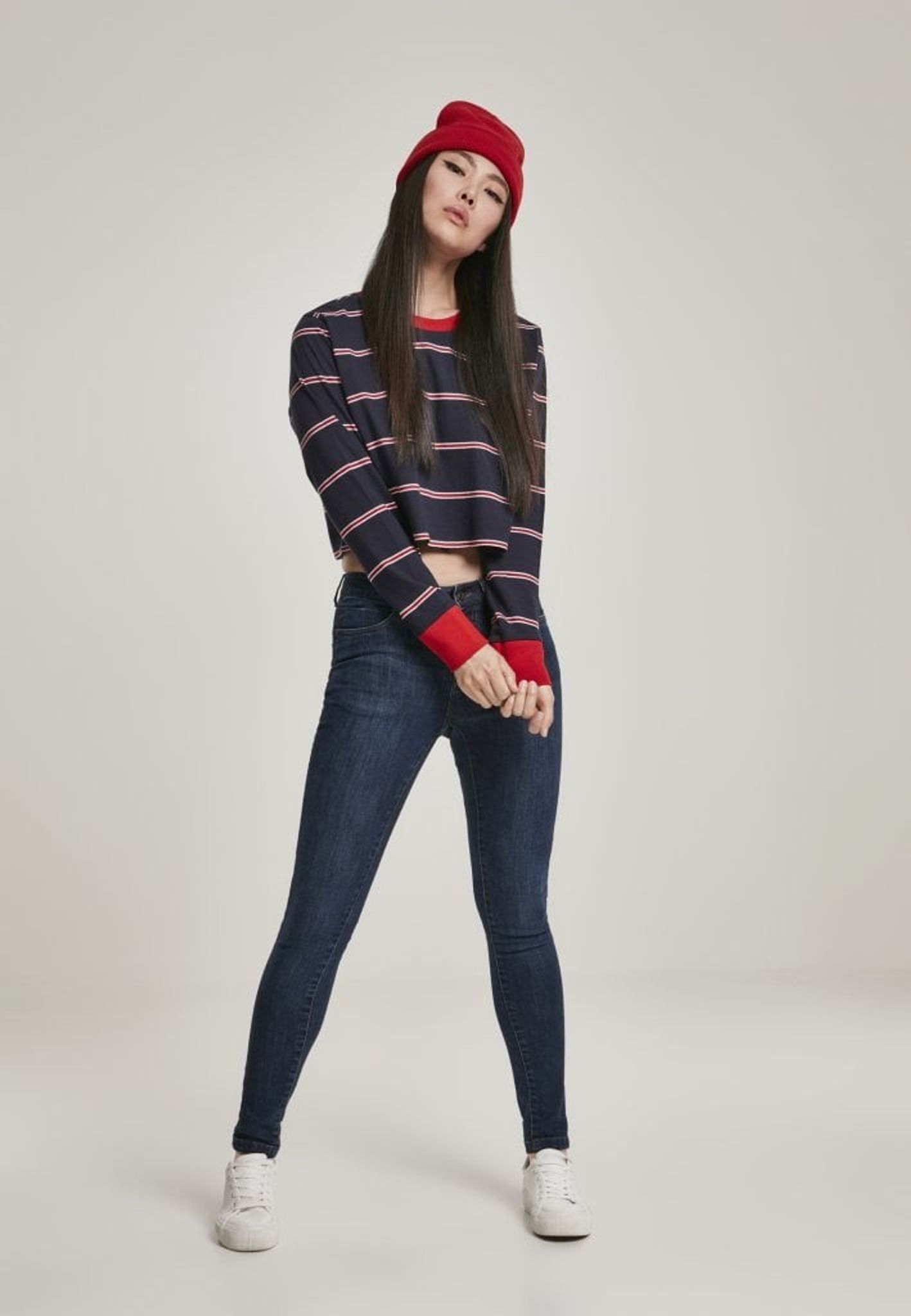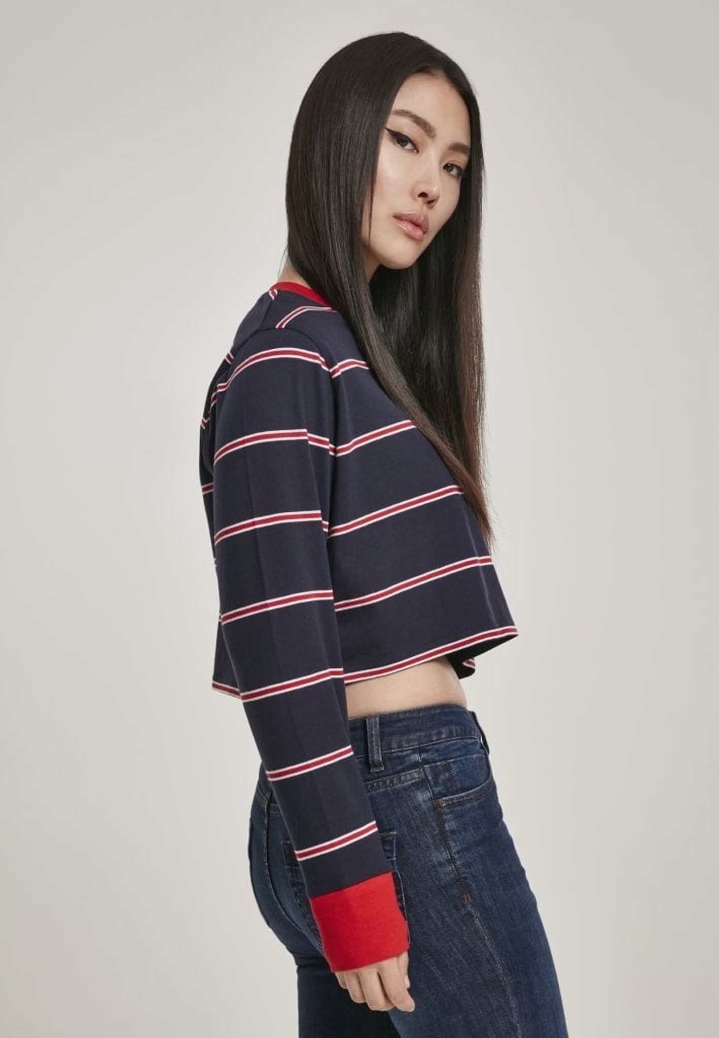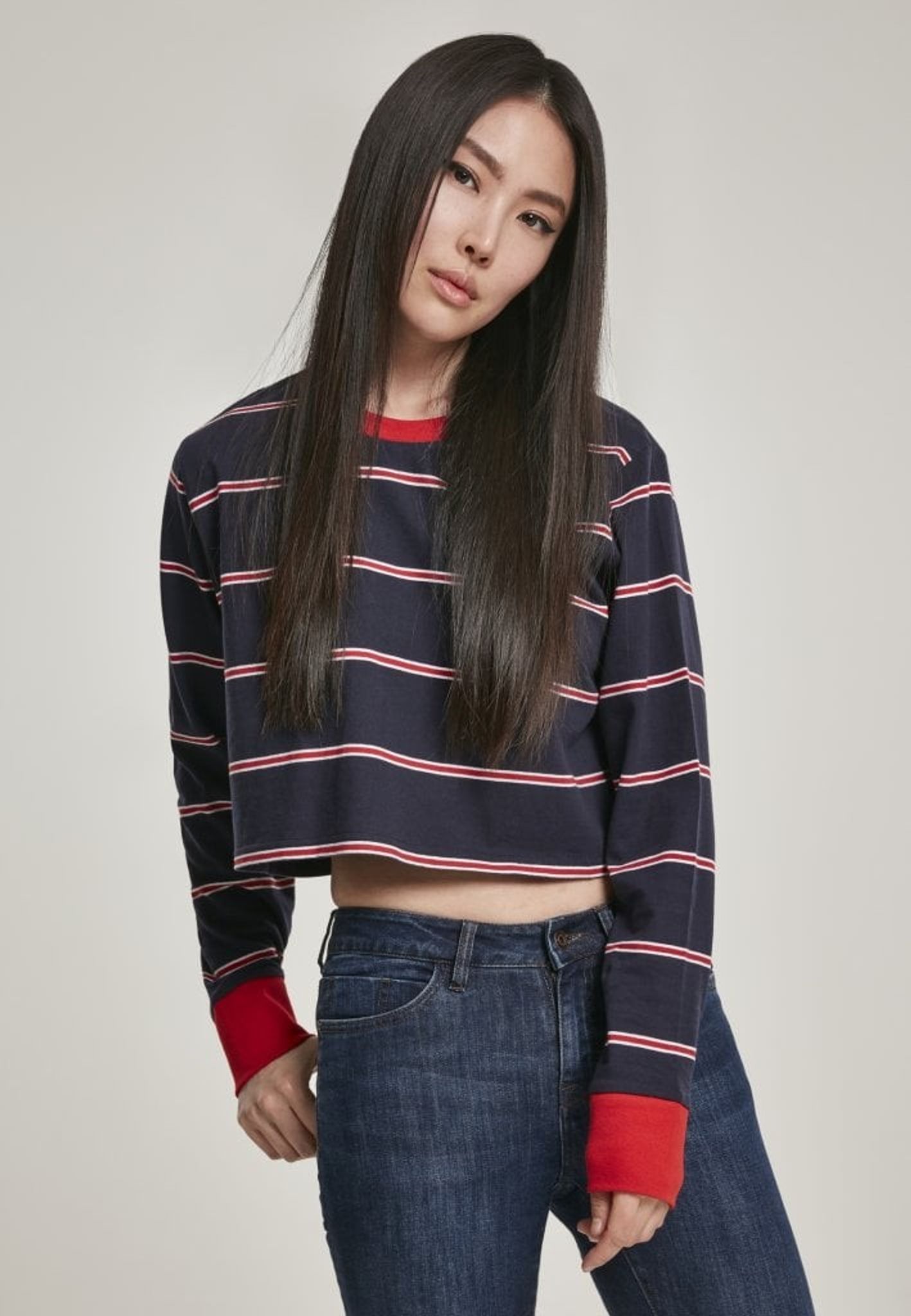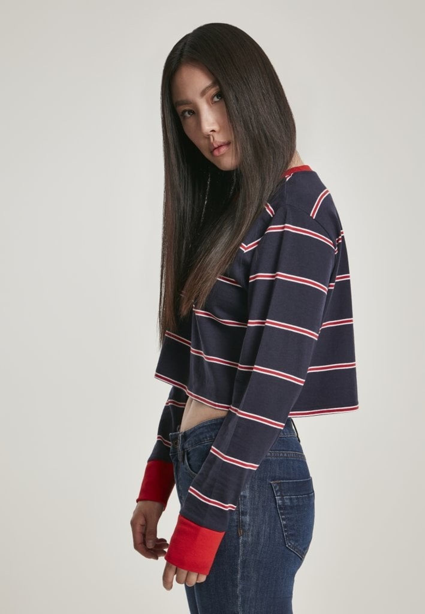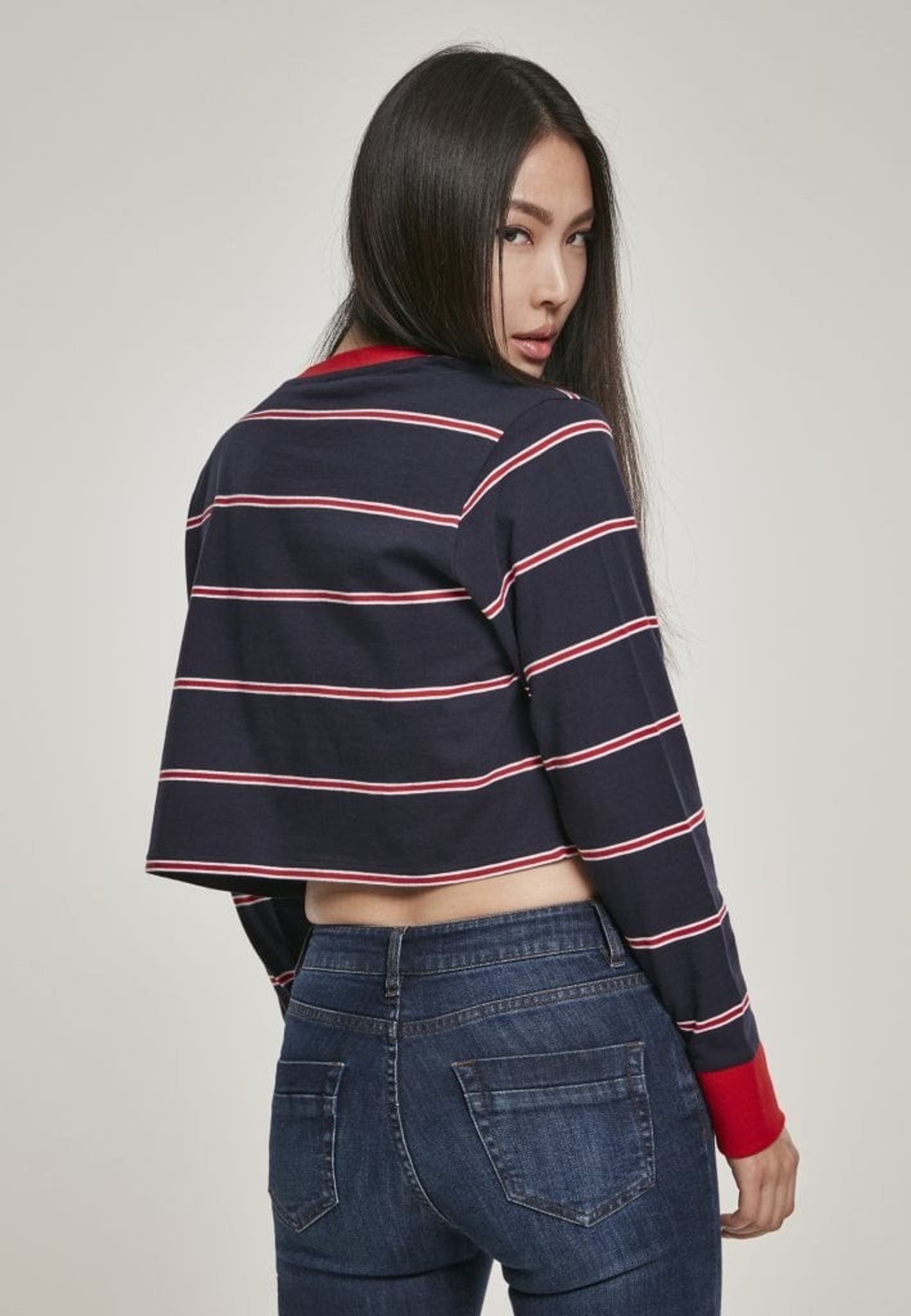 Denne sweater slutter lige under brystet midt i maven. Sweaterens hals er rund, og både halsudskæringen og armpuderne er røde.