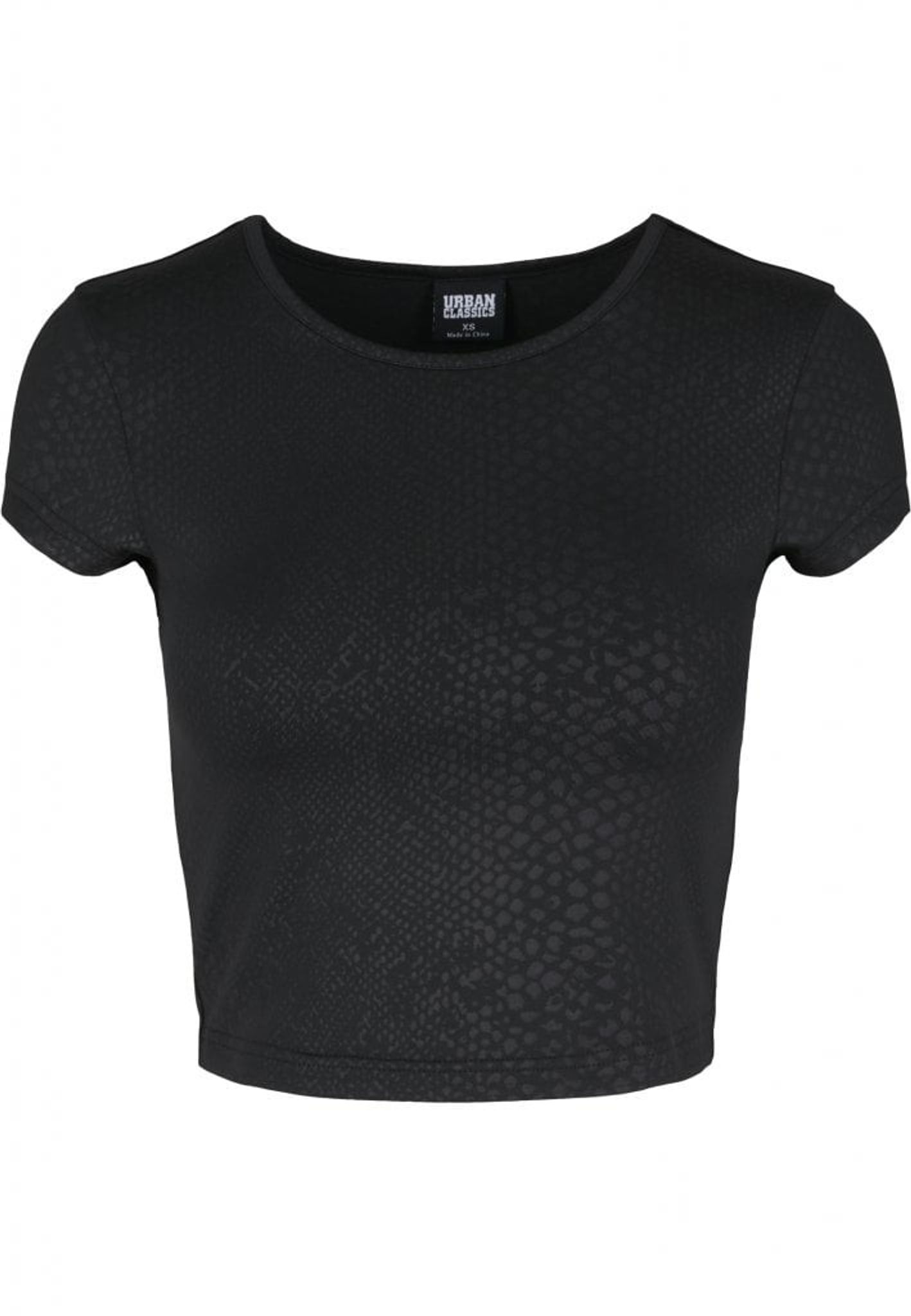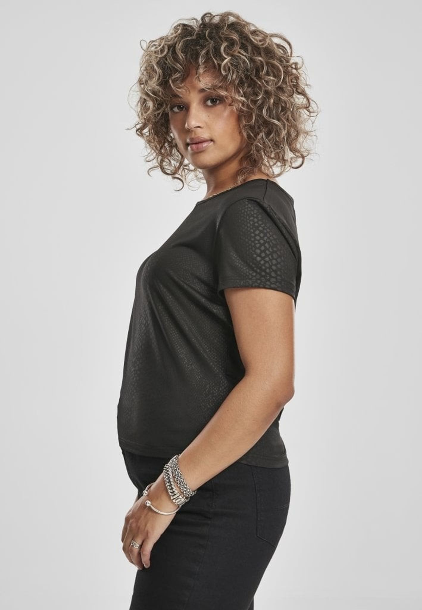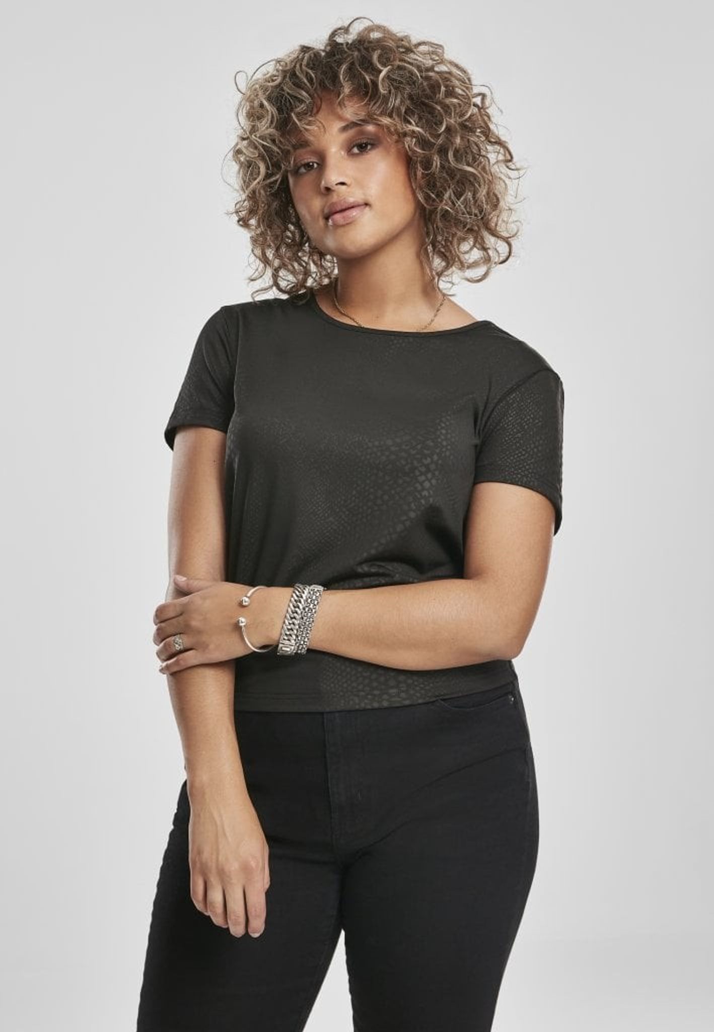 En sort t-shirt i en smuk kombination. En klassisk t-shirt lavet i et smukt sort skinnende stof.
