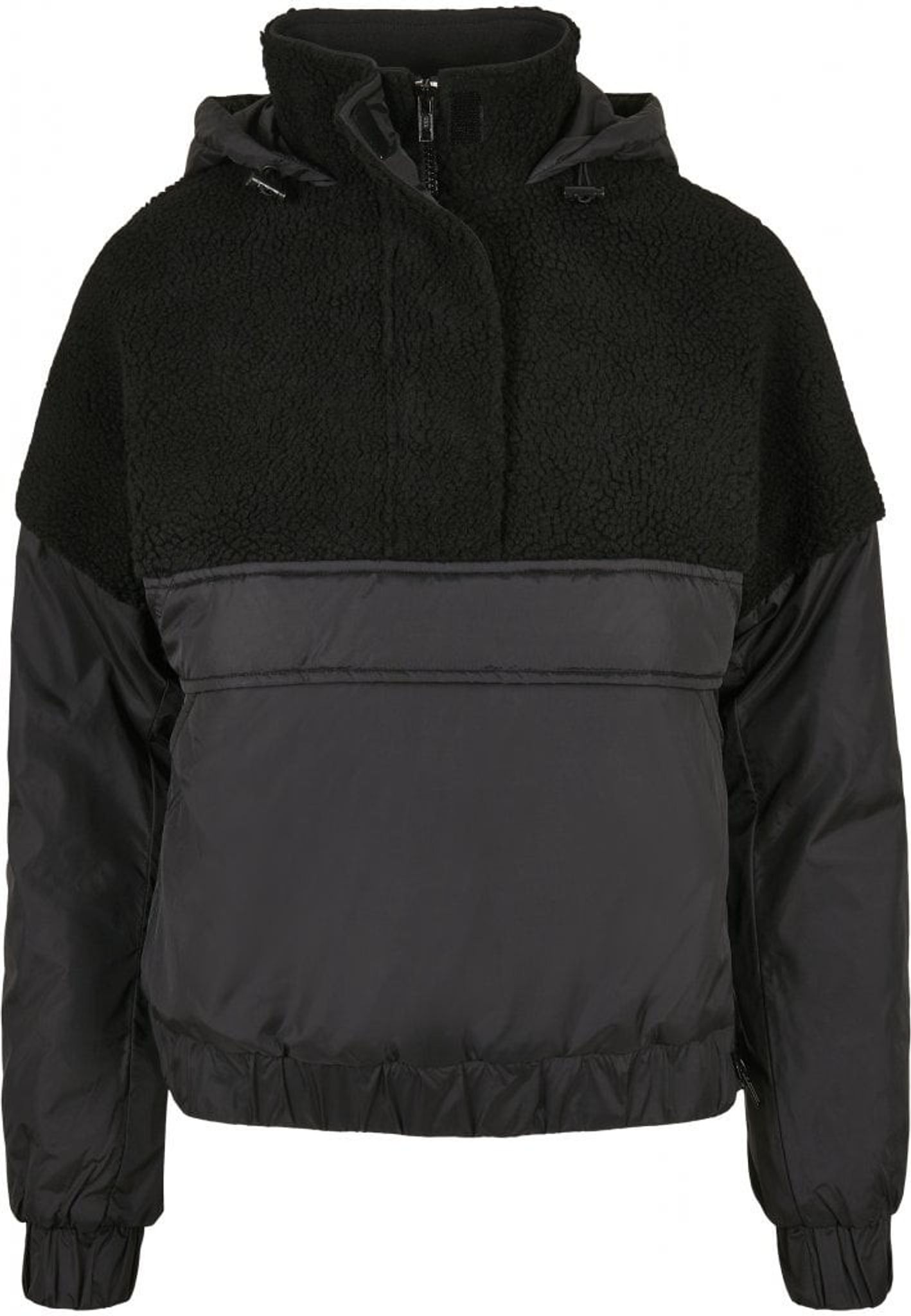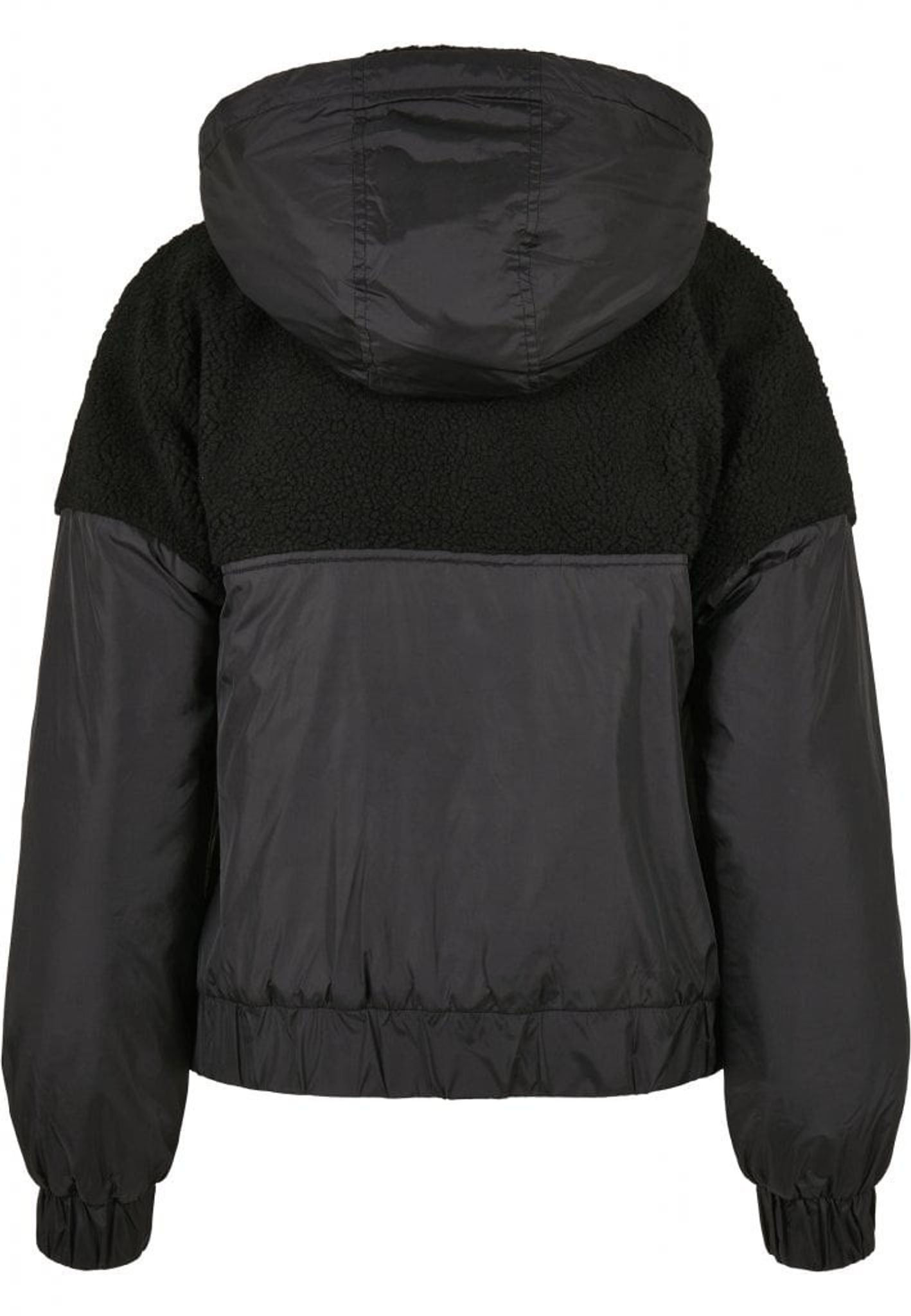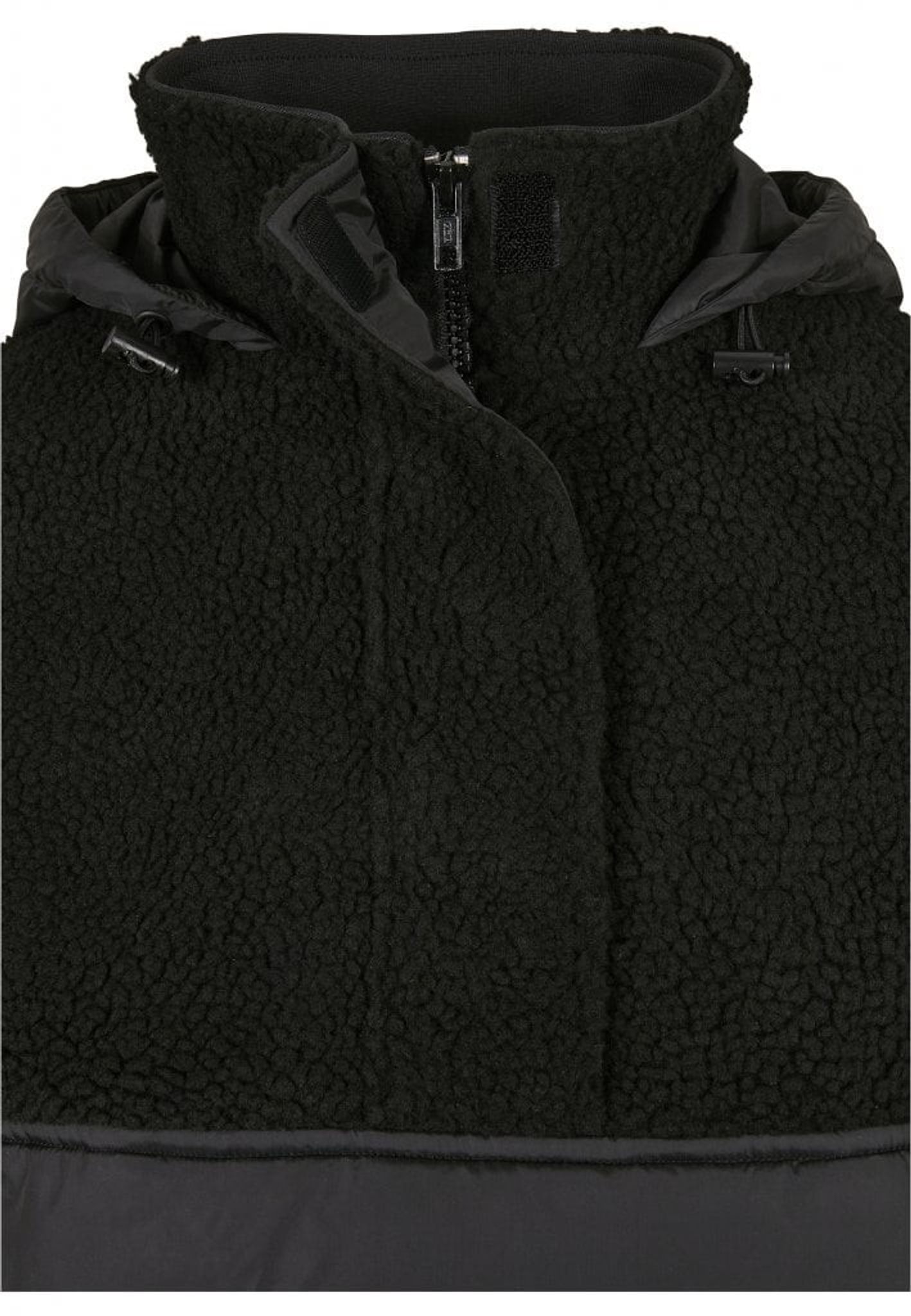 Skulderområdet har teddystof, mens jakkens bund og hætte er i skinnende nylon. Det bliver en god kombination.