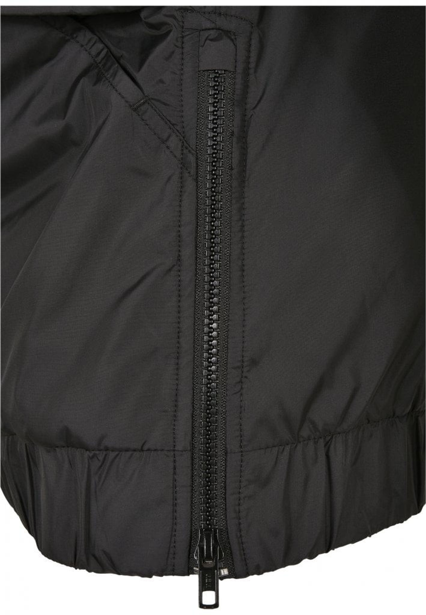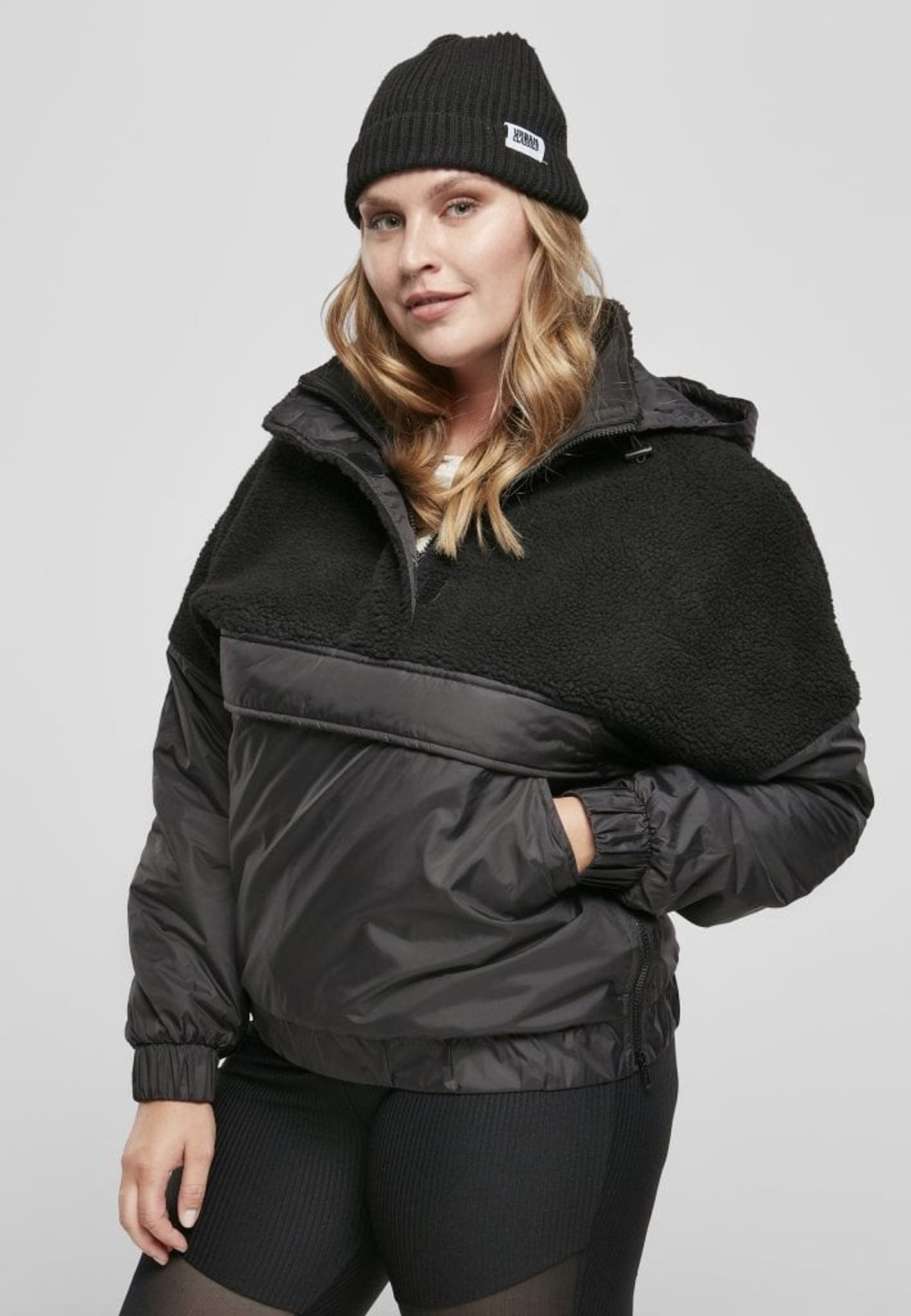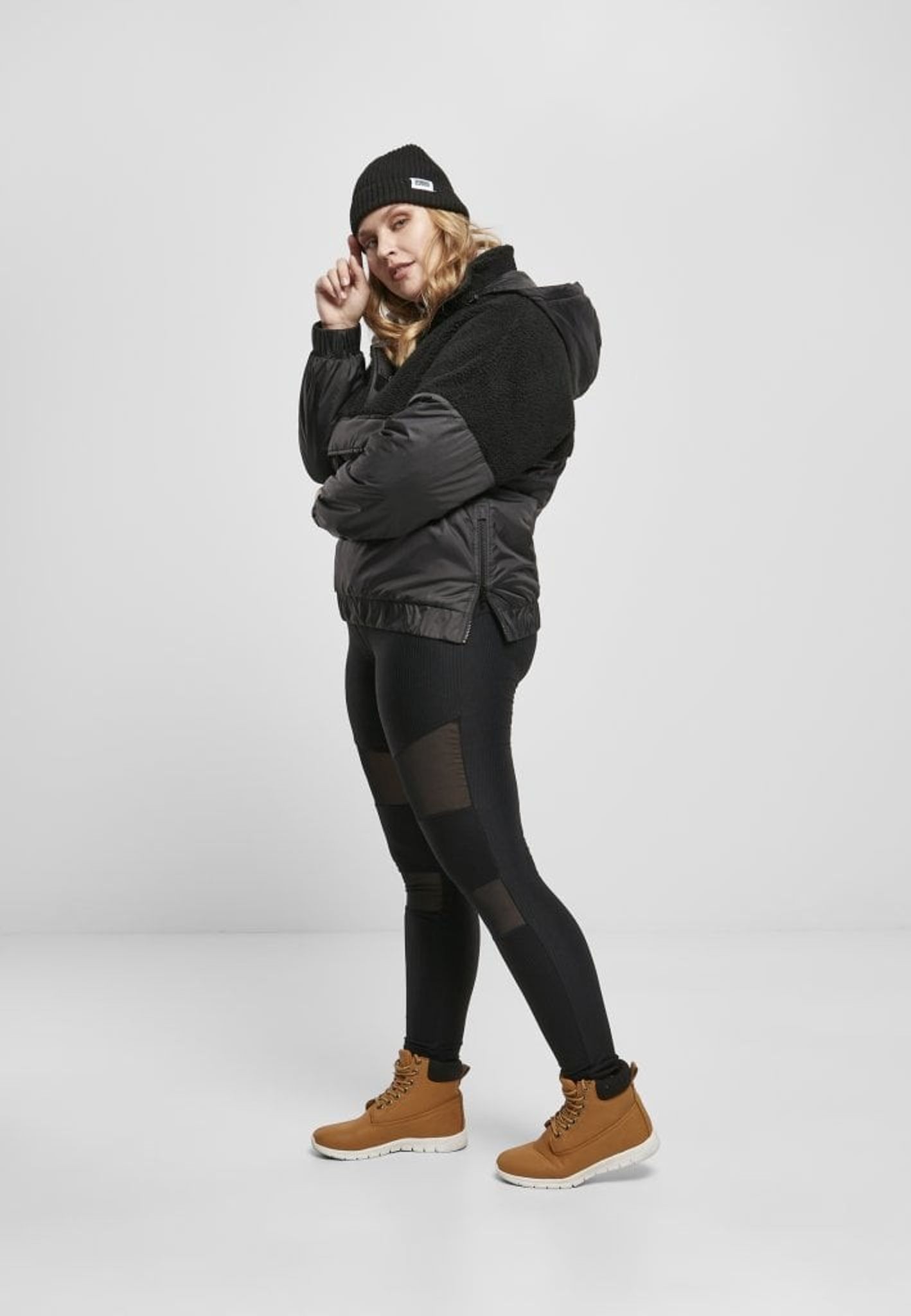 Skulderområdet har teddystof, mens jakkens bund og hætte er i skinnende nylon. Det bliver en god kombination.