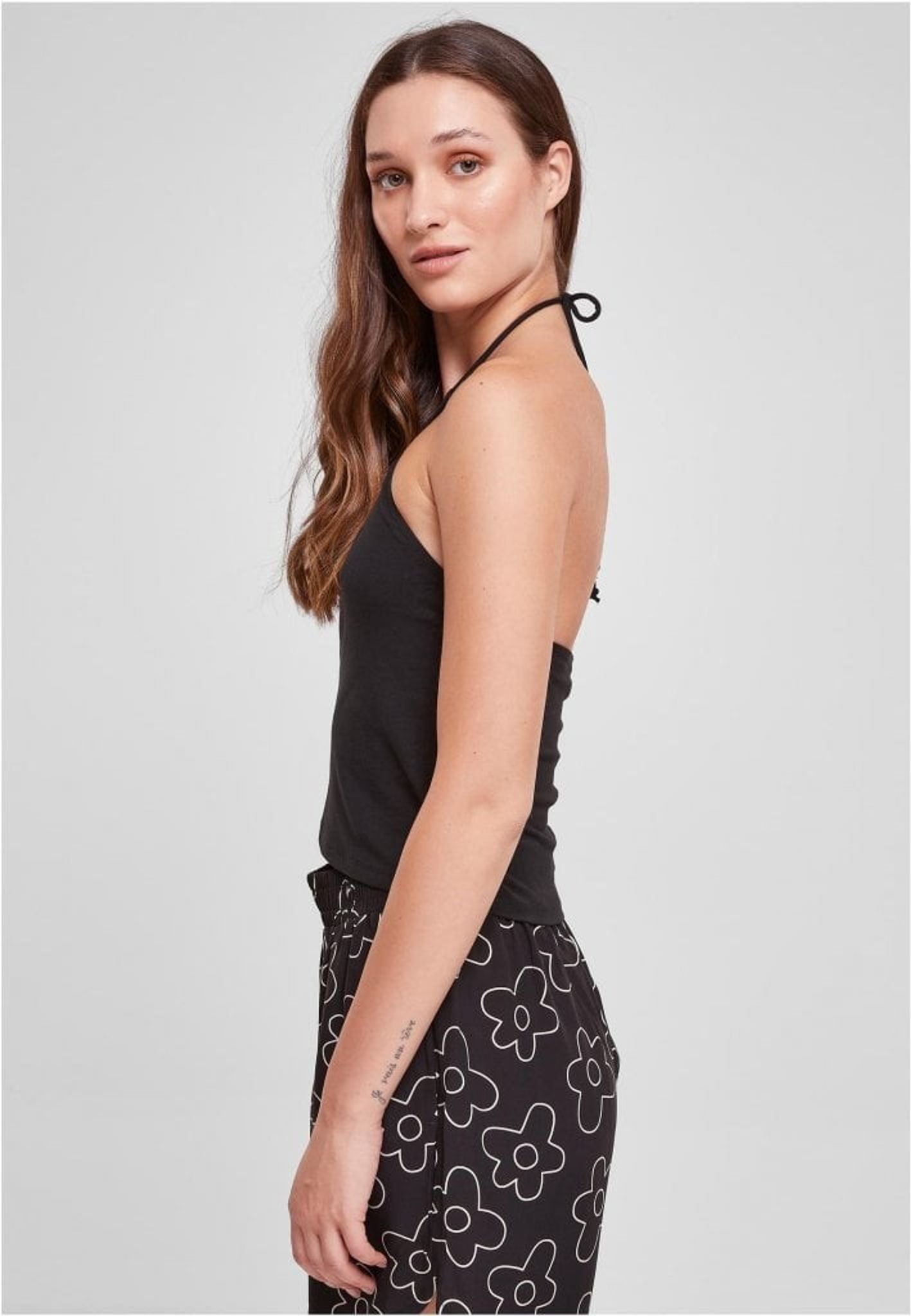 Toppen er designet med en slim fit og en kort længde, der følger kroppens linjer. Dens omviklede skulderrem tilføjer et stilfuldt og moderne touch til designet.