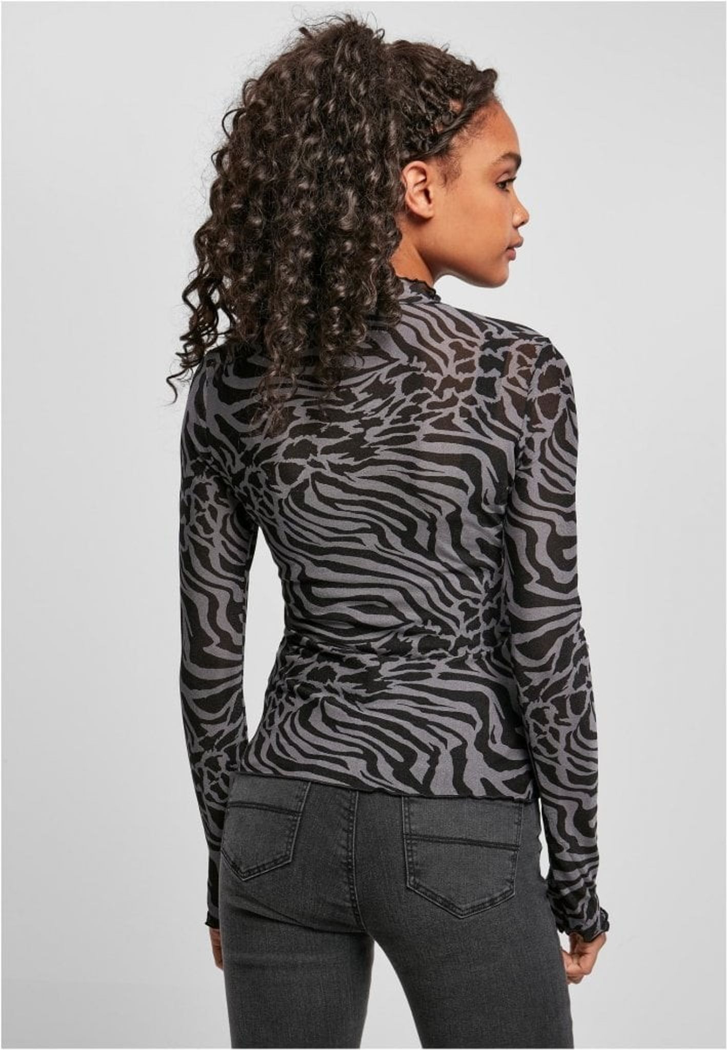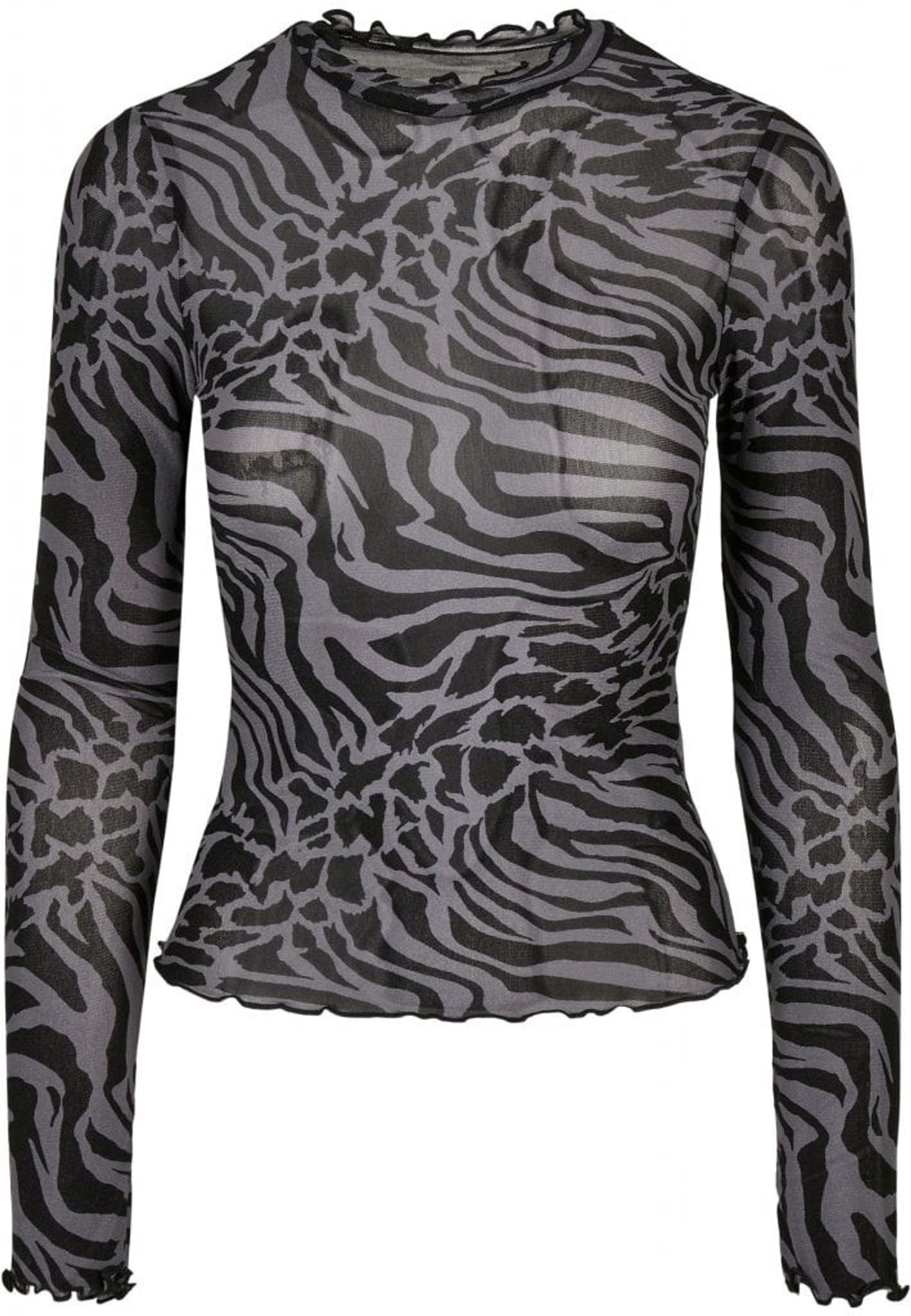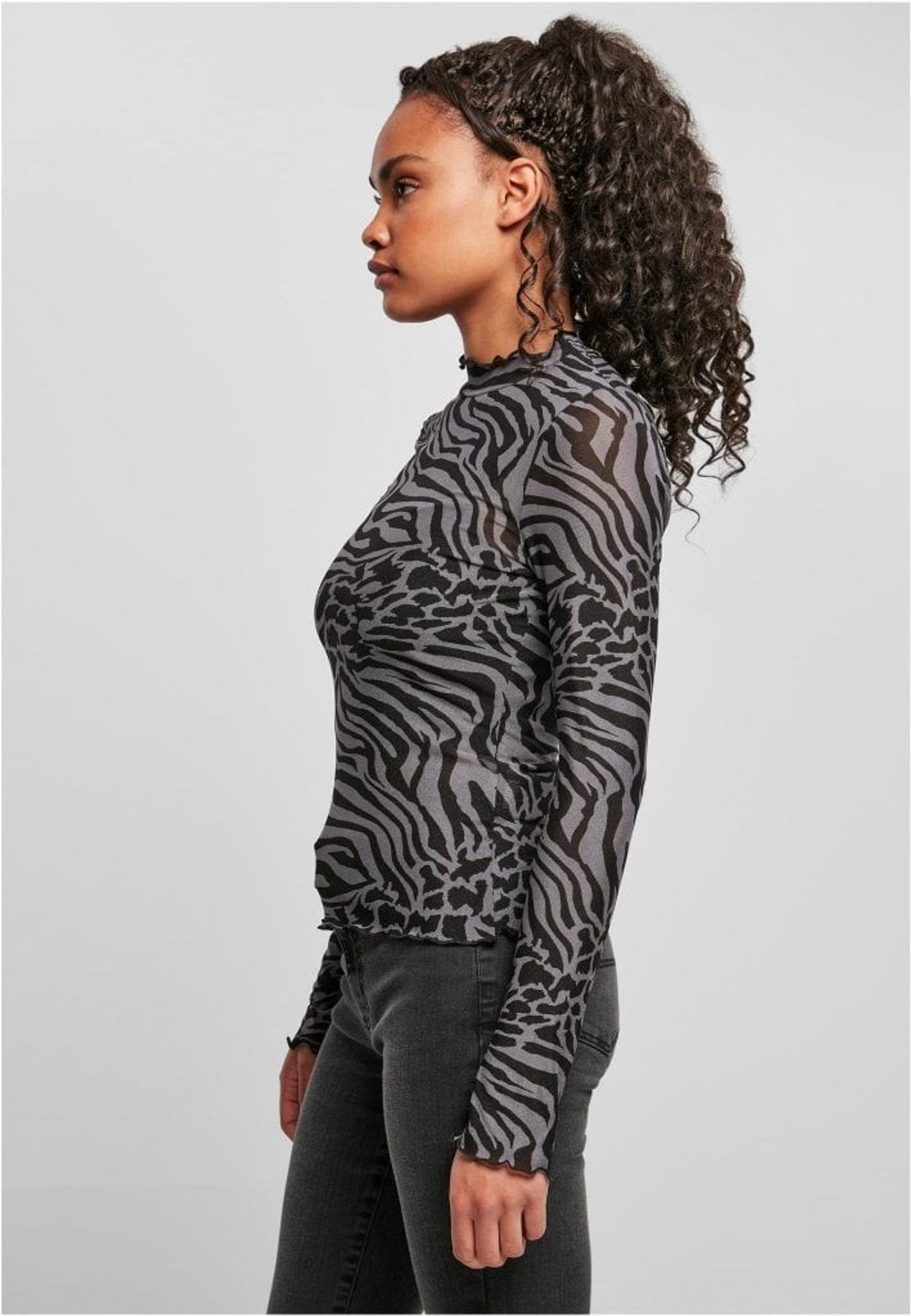 Denne spændende langærmede top er lavet af delvist gennemsigtigt mesh stof, der giver et unikt og dragende look. Allover-printet minder om det dristige og slående mønster af en zebras striber, hvilket giver tøjet et strejf af vildskab.