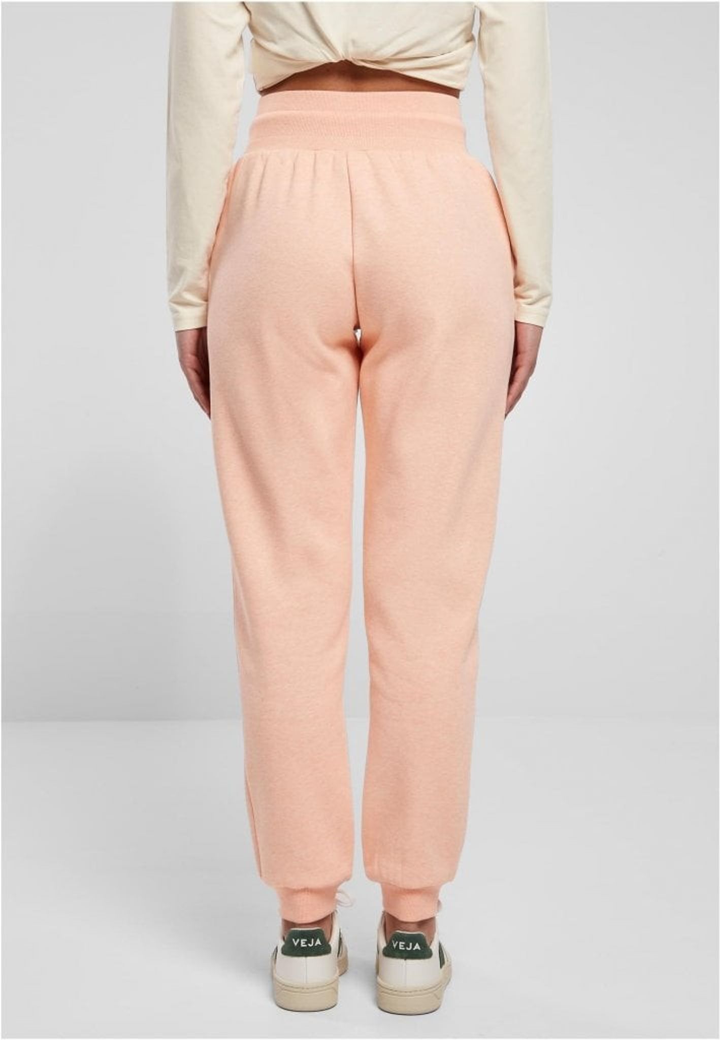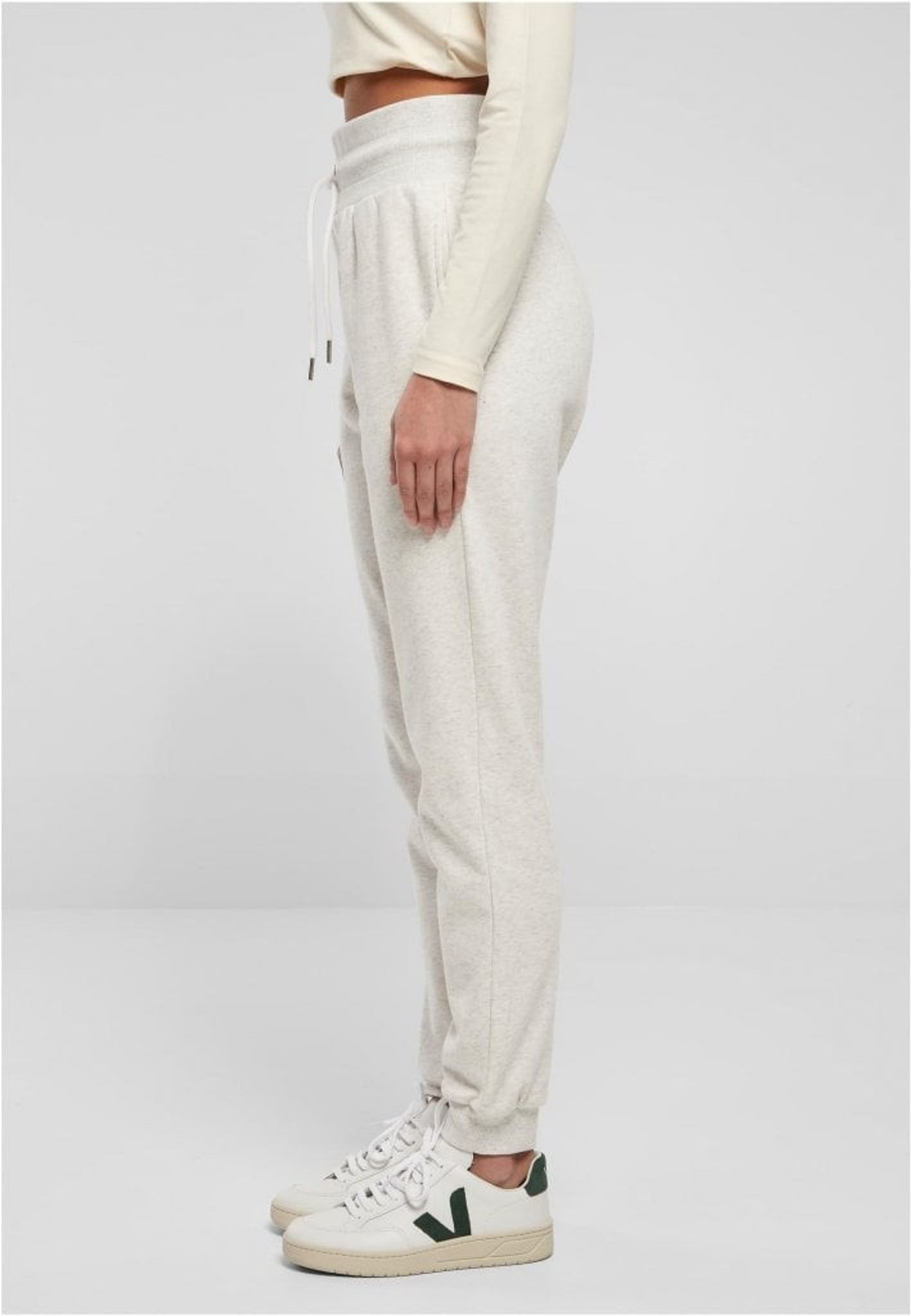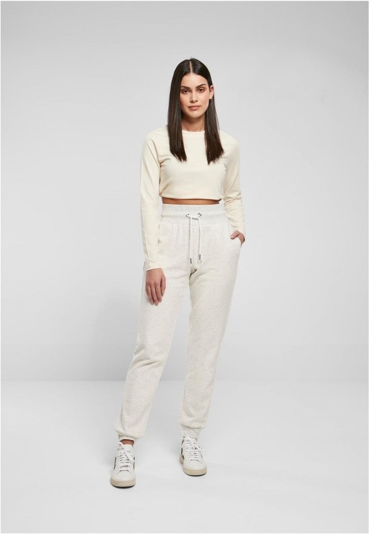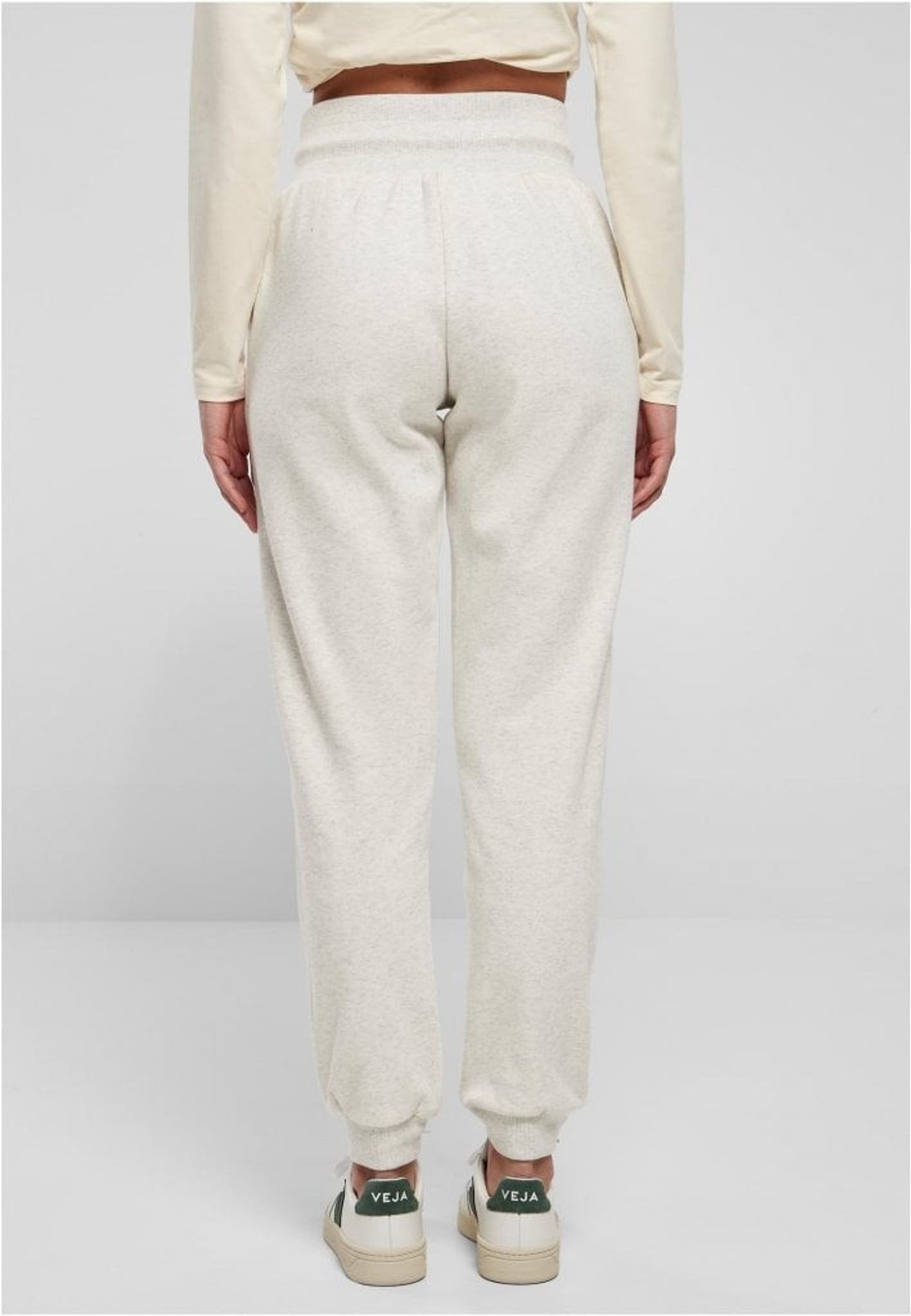 Joggingbukser til kvinder, der tilfredsstiller med en sporty stil i melange toner og er høj komfort. Et særligt træk er den ekstra brede, høje og elastiske linning med snøre. Bløde bukserne er udstyret med to sidelommer og brede manchetter. De er lavet af et blødt og fleksibelt sweat stof og har en normal pasform.