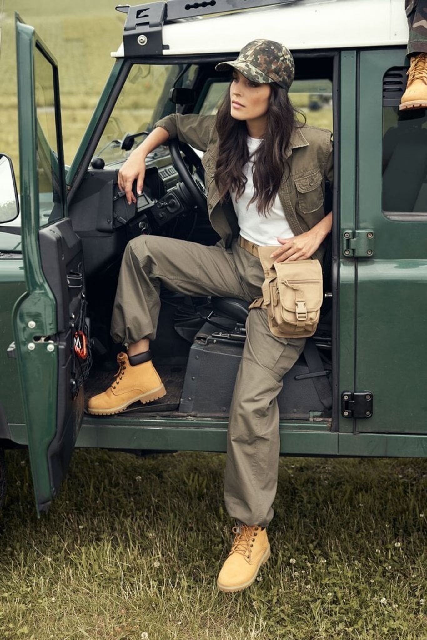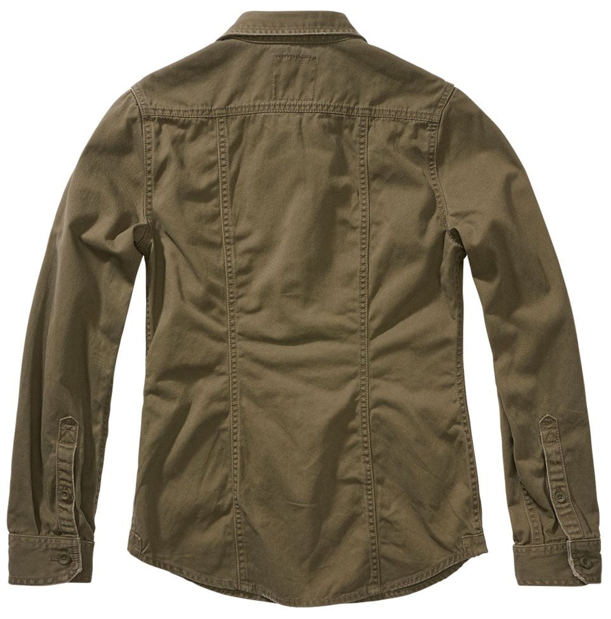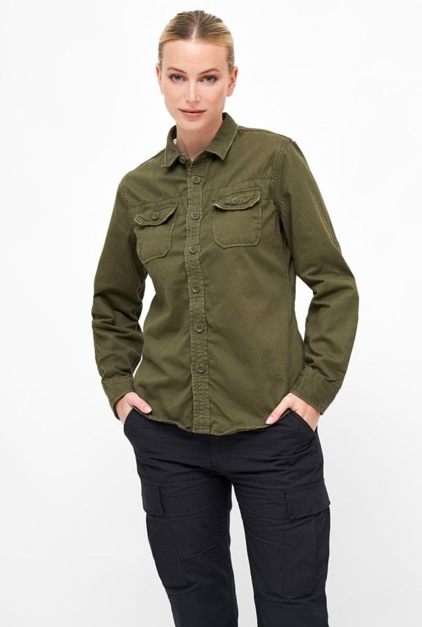 En virkelig flot og flot designet dameskjorte i bomuldsstof. Skjorten har flere stilfulde slidstykker, der giver den et stilfuldt vintage look. Stoffets militærgrønne farve gør skjorten til en rigtig stylist.