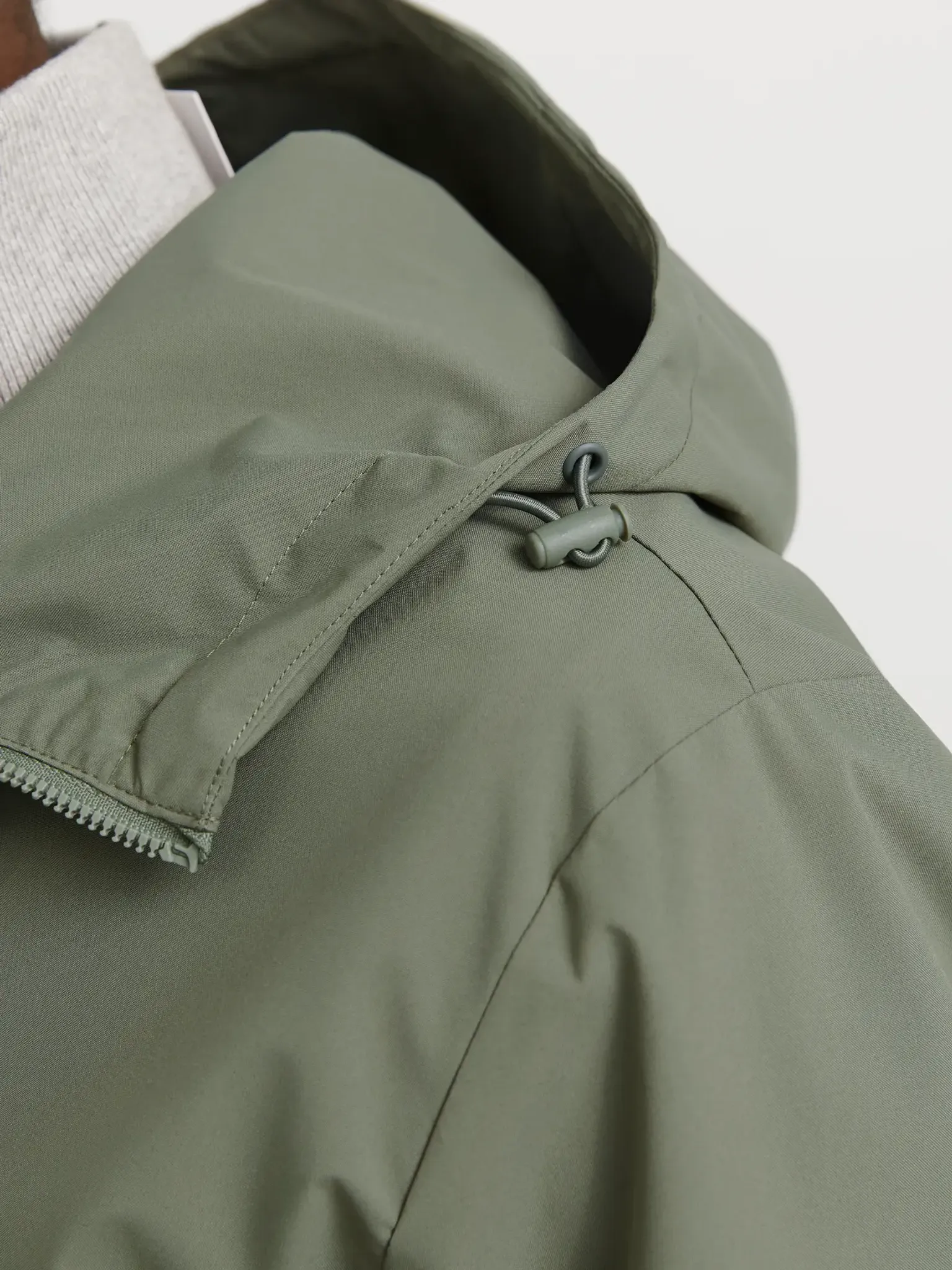 - Hals: Huva med snörreglering