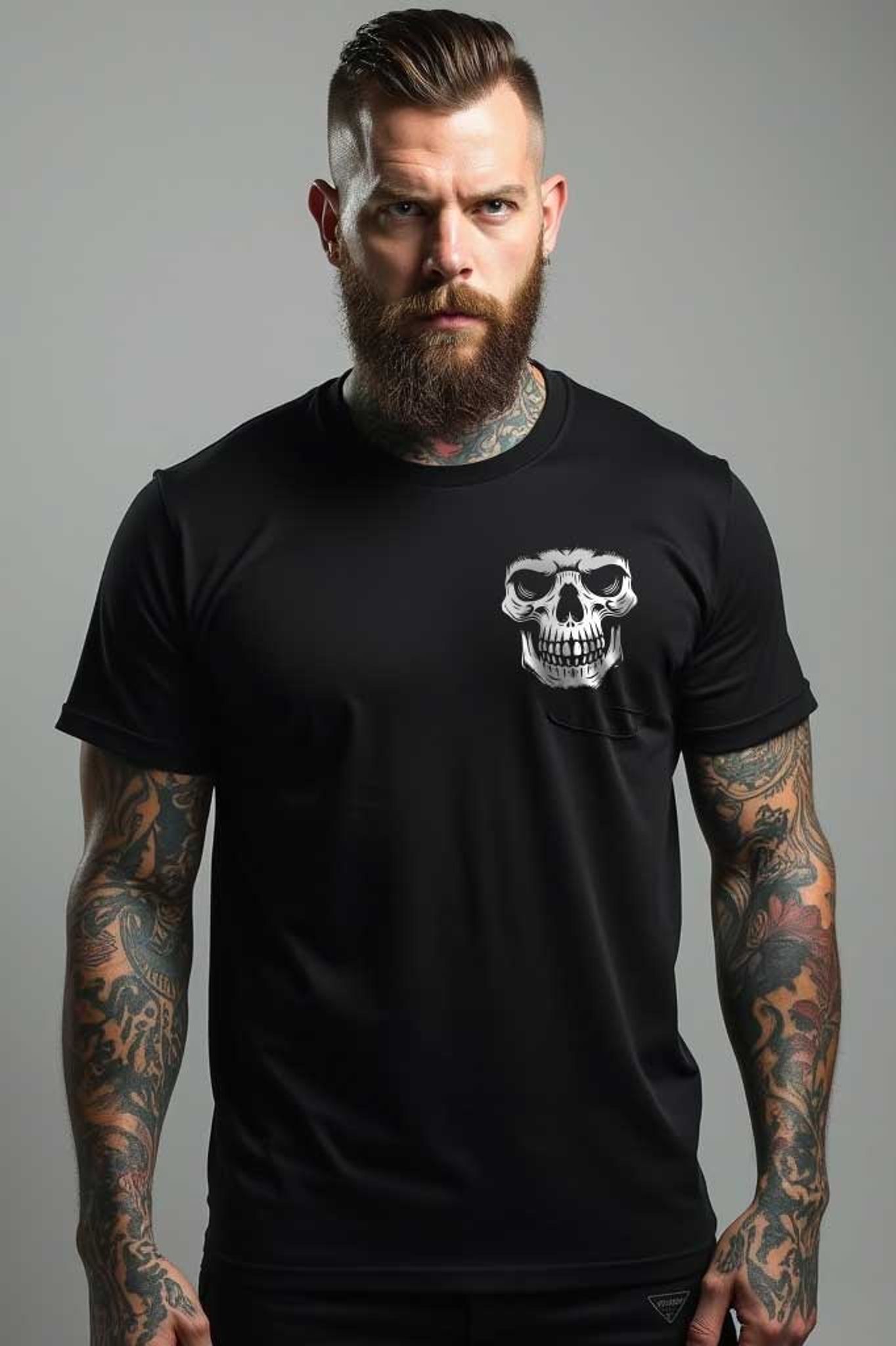En svart T-shirt med en enkel men effektfull detalj – en vit dödskalle tryckt på bröstet. Det är inte ett skrik, det är ett tyst budskap om attityd. Den rena designen gör att du kan bära den till allt, från slitna jeans till skinnjacka, och den håller lika bra i vardagen som på spelningen. Den sitter skönt, känns rätt och ger dig en kant som sticker ut utan att behöva säga ett ord. En tröja för dig som inte ber om uppmärksamhet – men får den ändå.