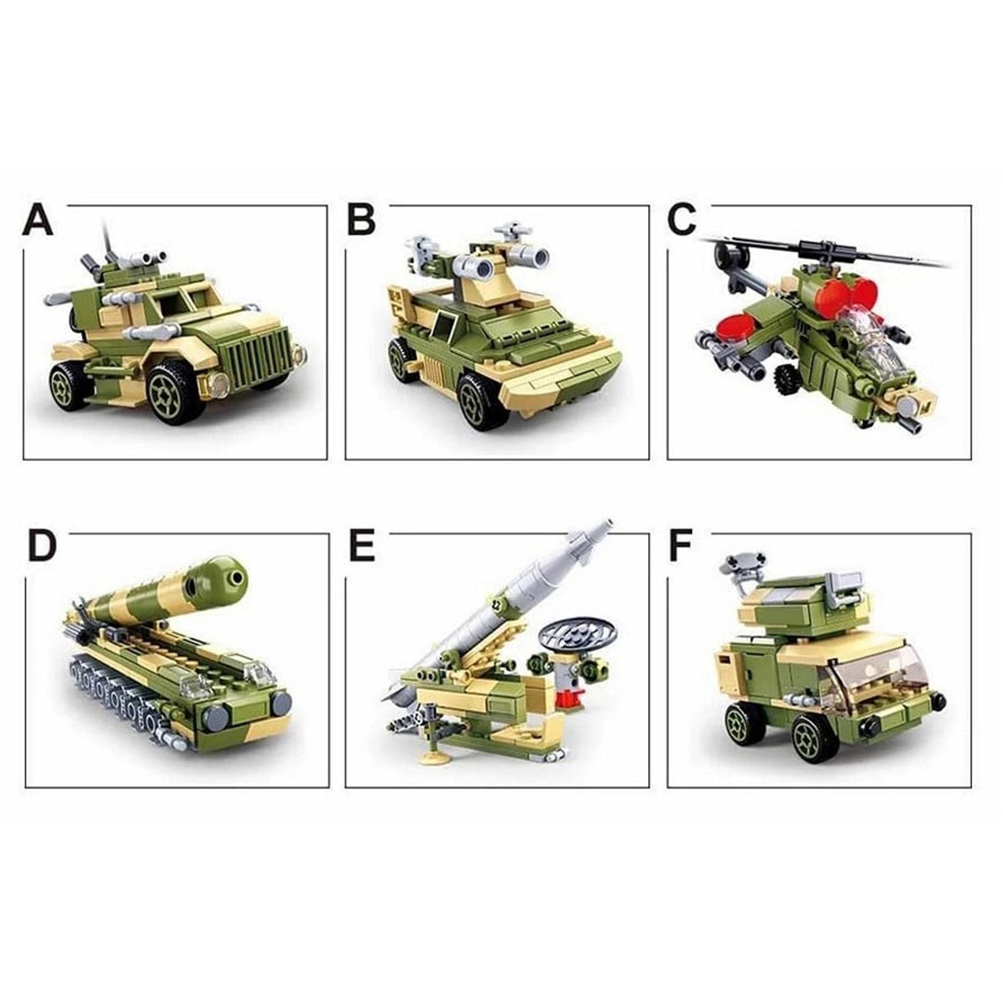 M38-B0758 Sluban Launching Vehicle 6 i 1 er et imponerende byggesæt, der er en del af Army-serien. Sættet tilbyder en alsidig byggeoplevelse, hvor brugeren kan skabe flere forskellige køretøjer og strukturer.