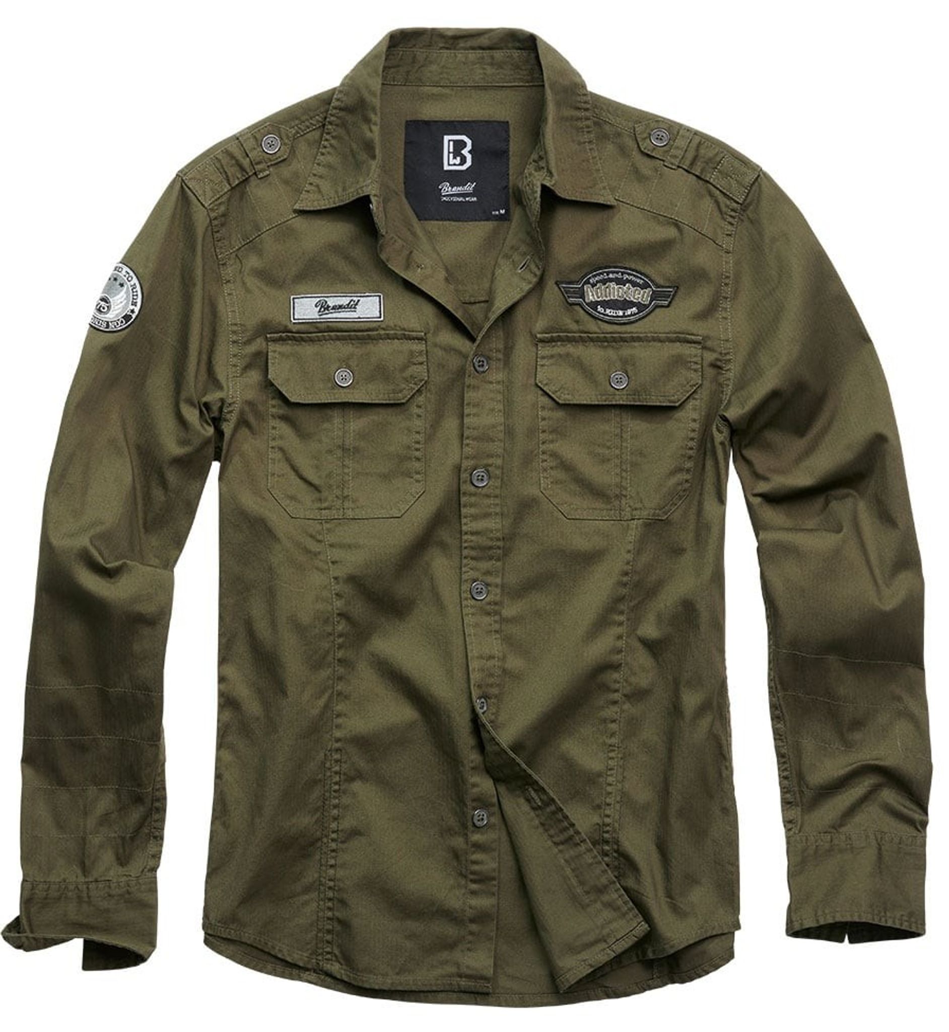 En behagelig skjorte i høj kvalitet i et militært look med sit olivengrønne stof, skulderklapper og patches. Skjorten har to brystlommer med knapper. Skjorten lukkes også med knapper.