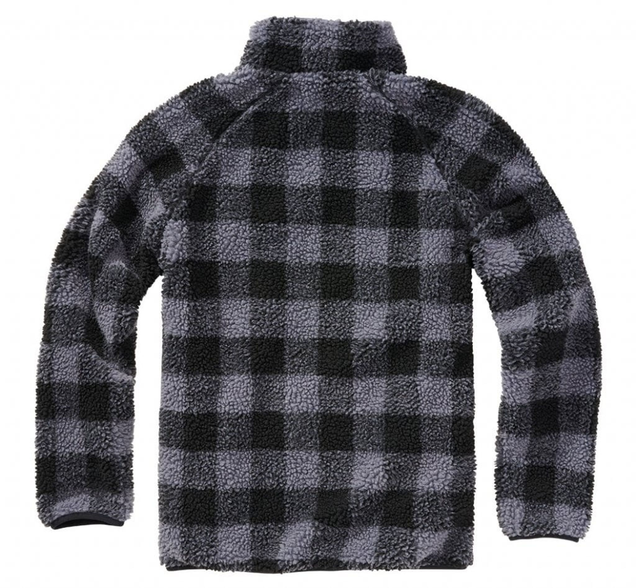 En grå og sort bamsefleece med et ternet mønster hentet fra de klassiske flannelskjorter.