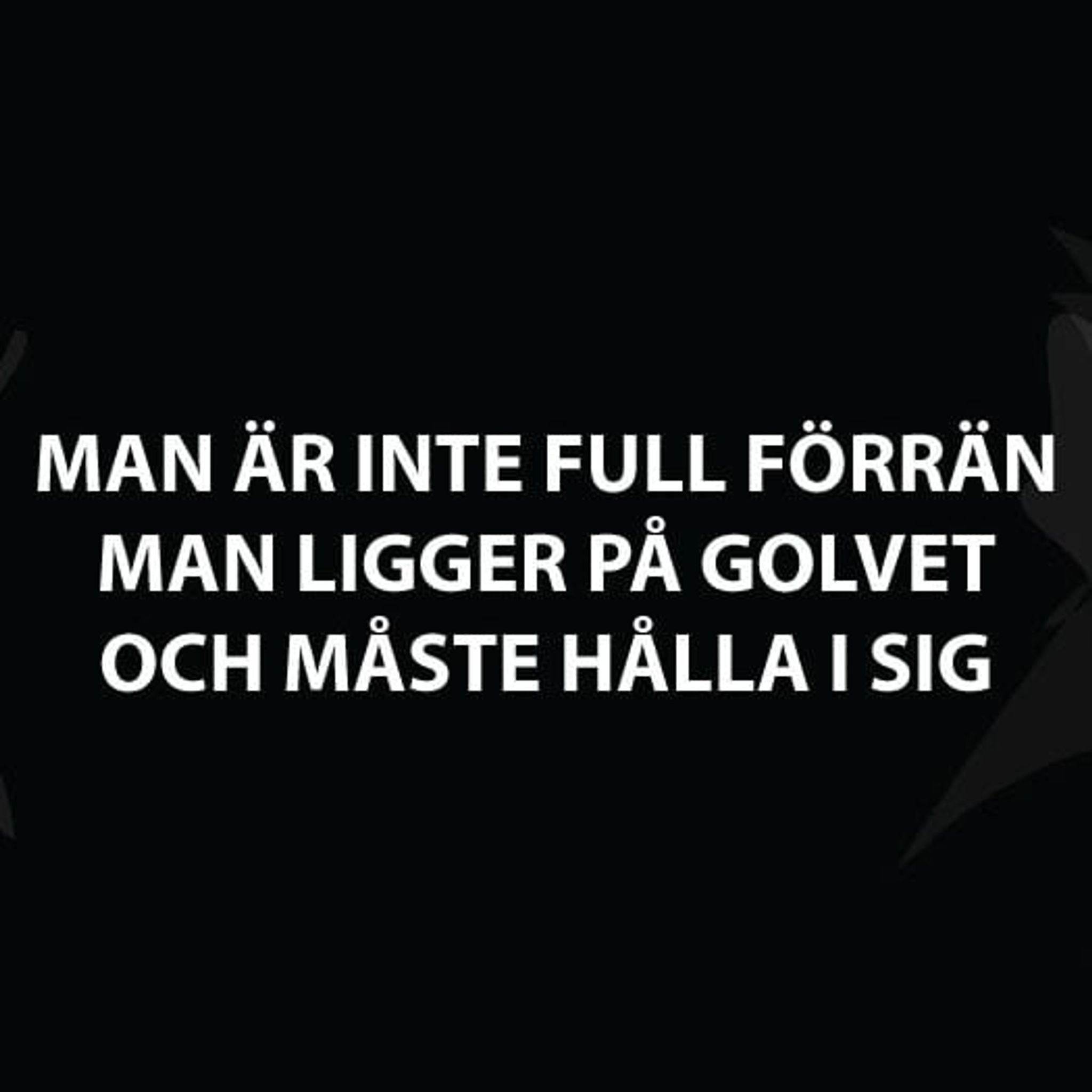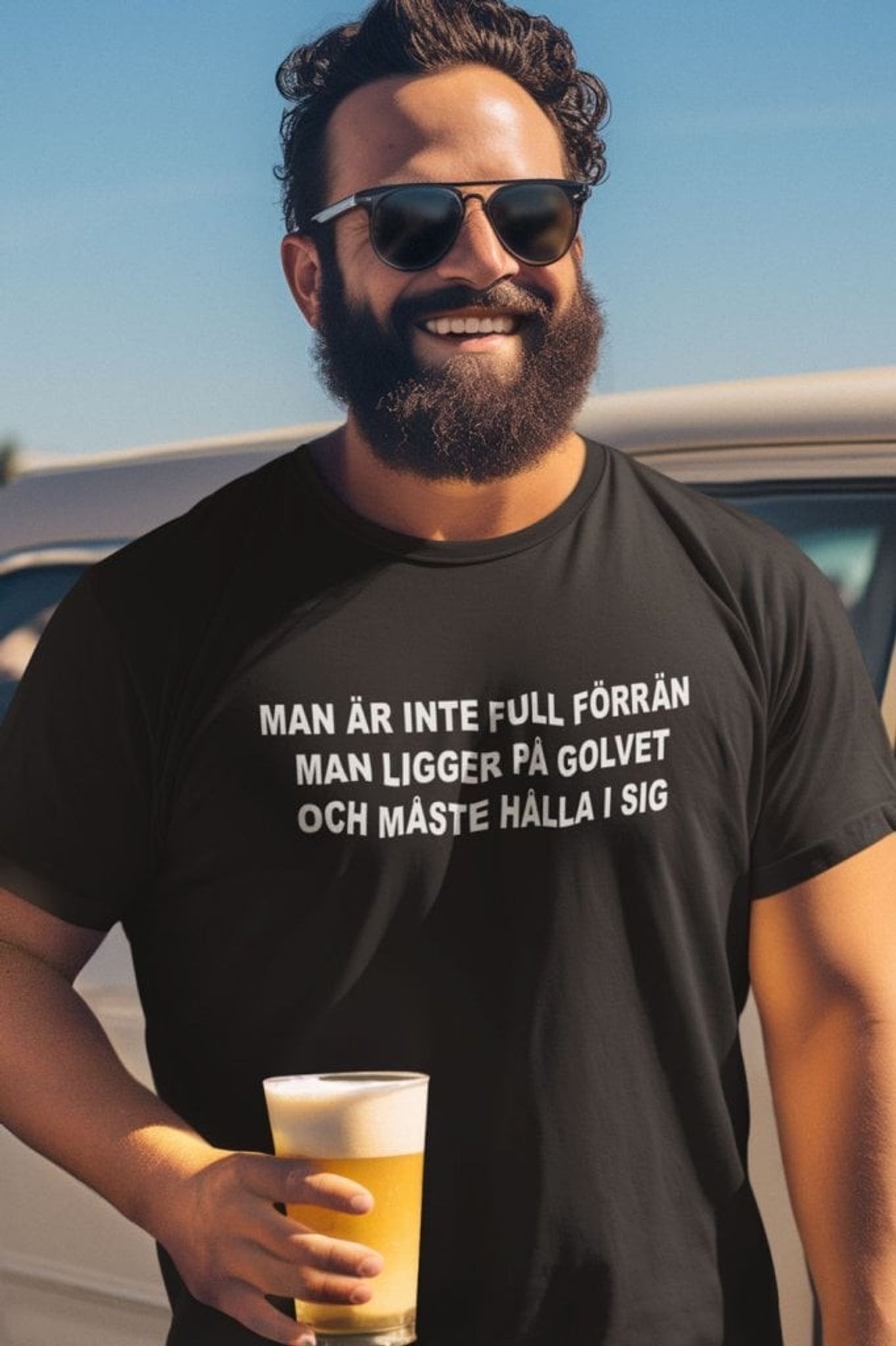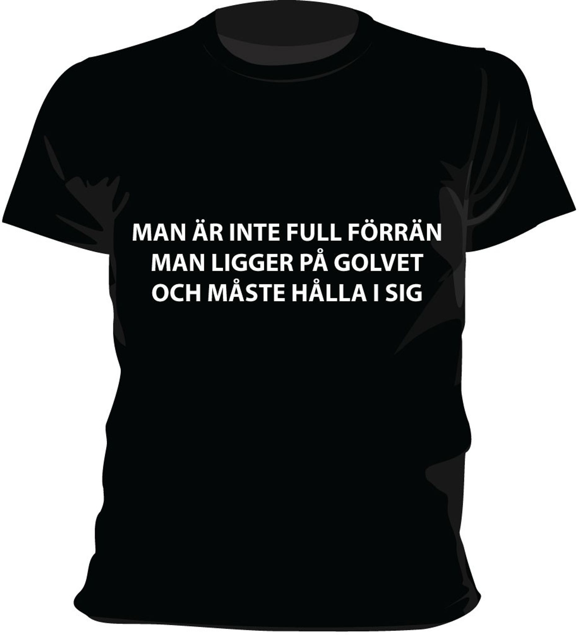 T-shirt med texten: Man är inte full förrän man ligger på golvet och måste hålla i sig!