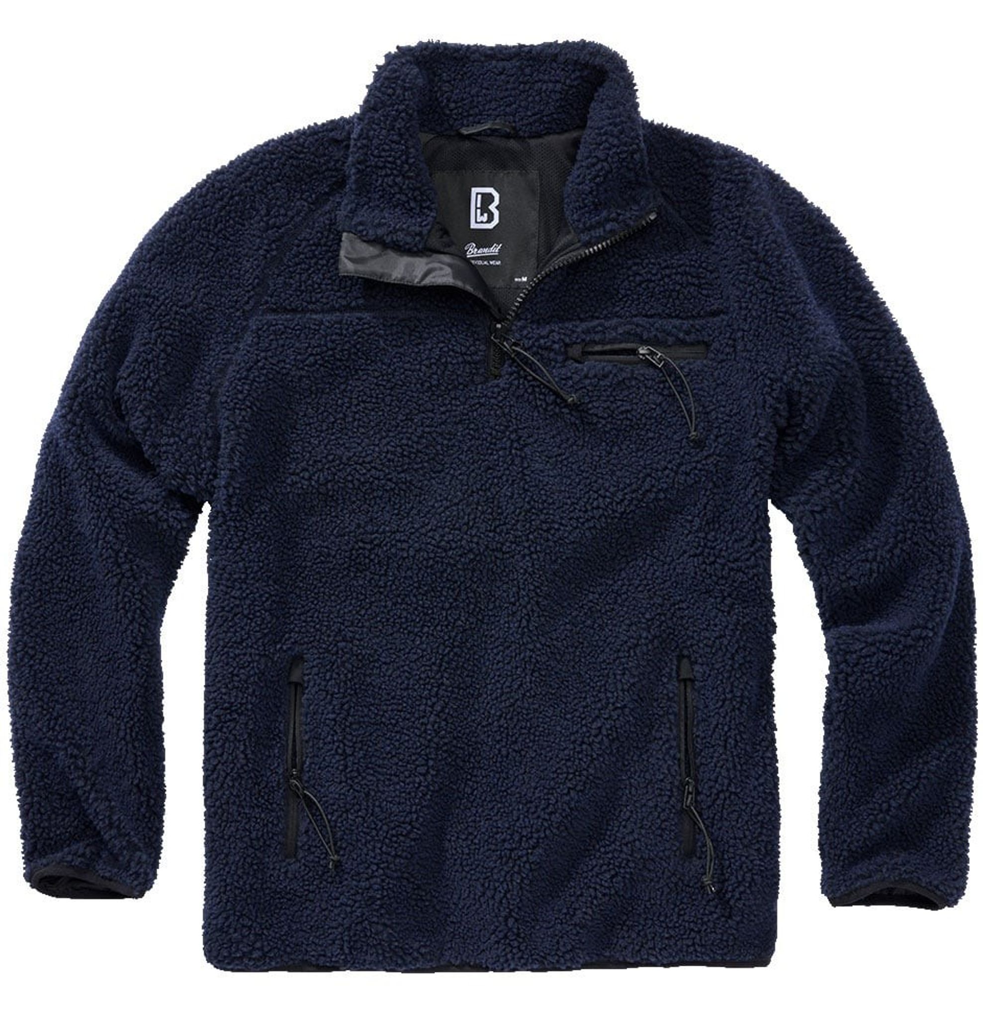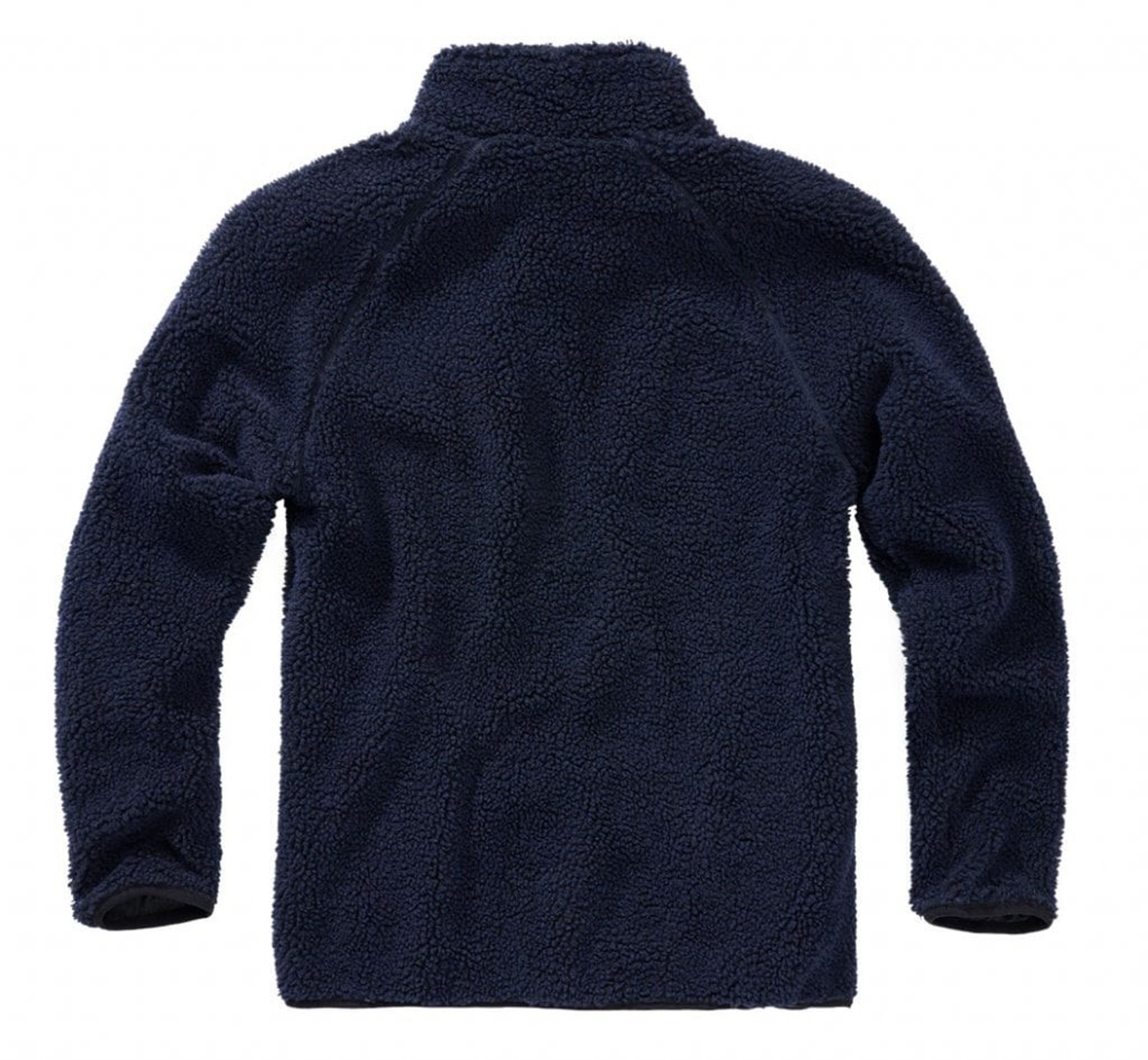 En pullover teddy jakke i en elegant marineblå farve og med sorte lynlåse på både hals og lommer.