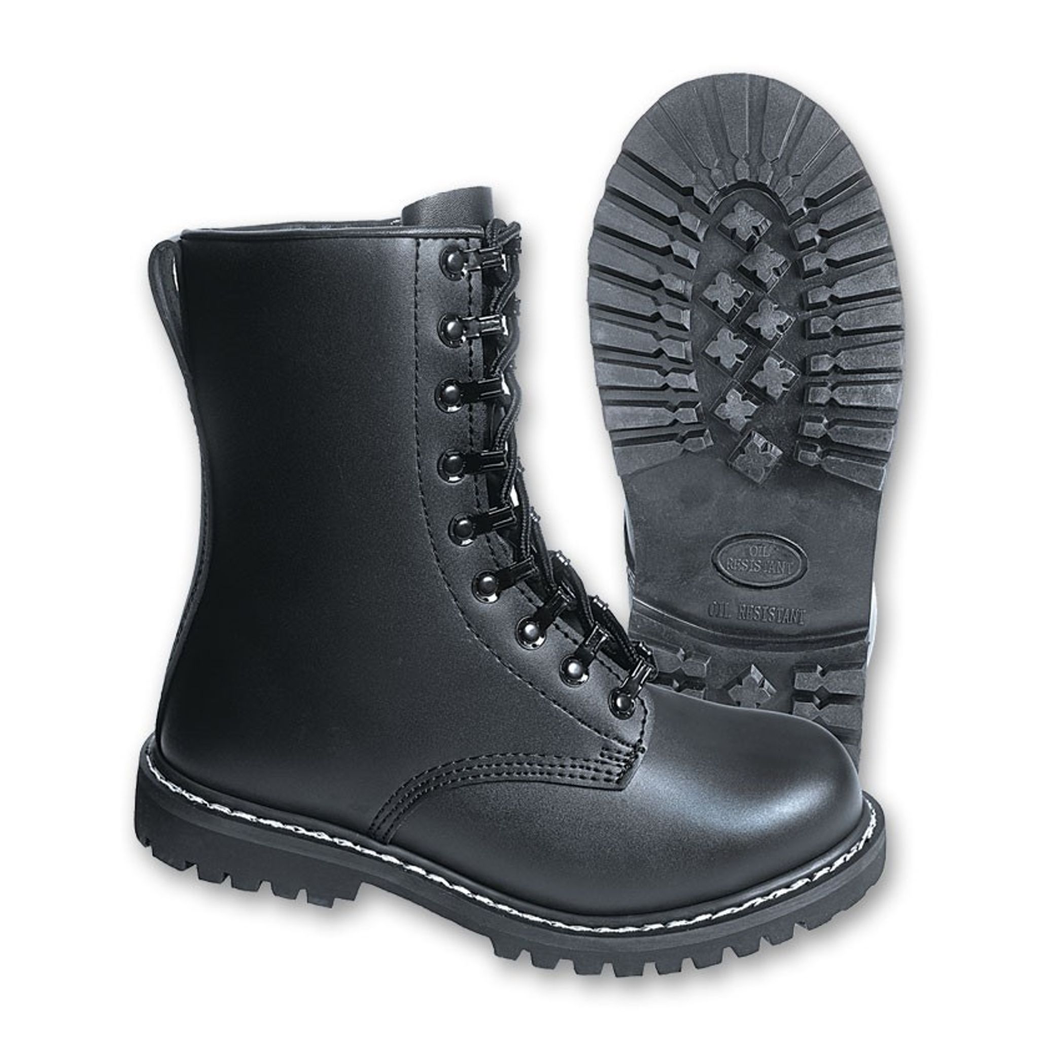 Disse jet-sort bekæmpe støvler er lavet af holdbart læder og forstærket med stålsnuder.
