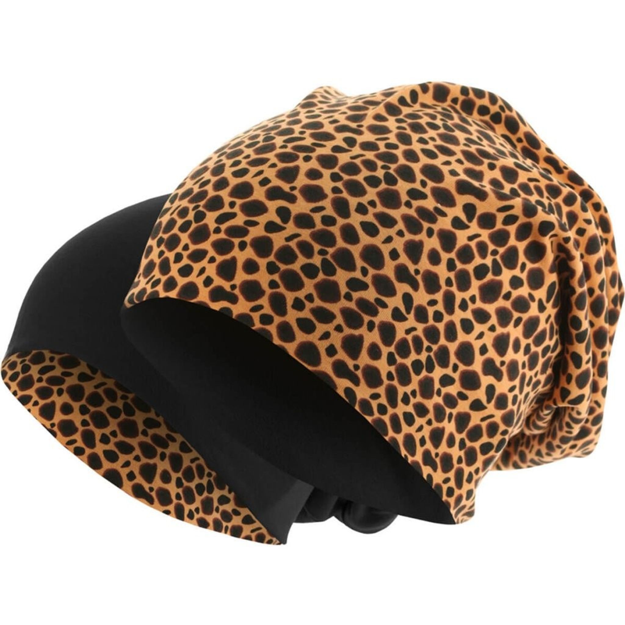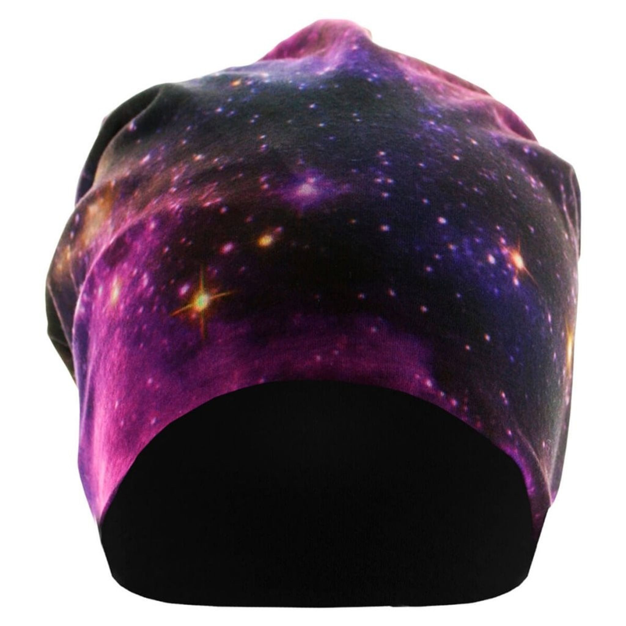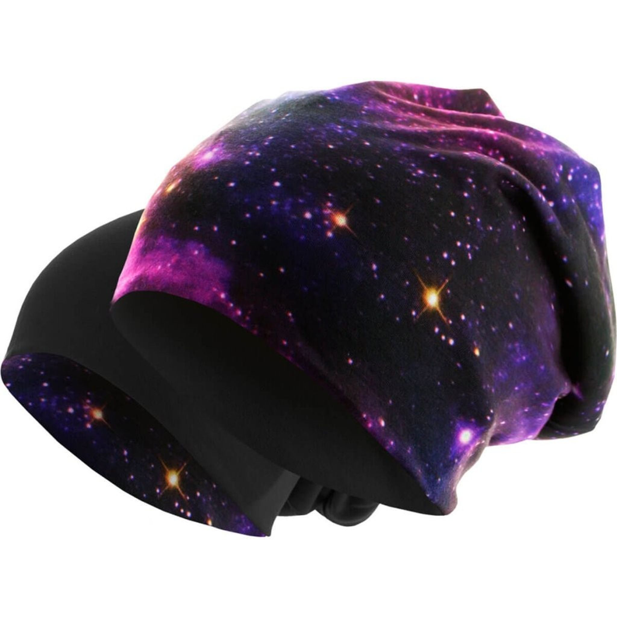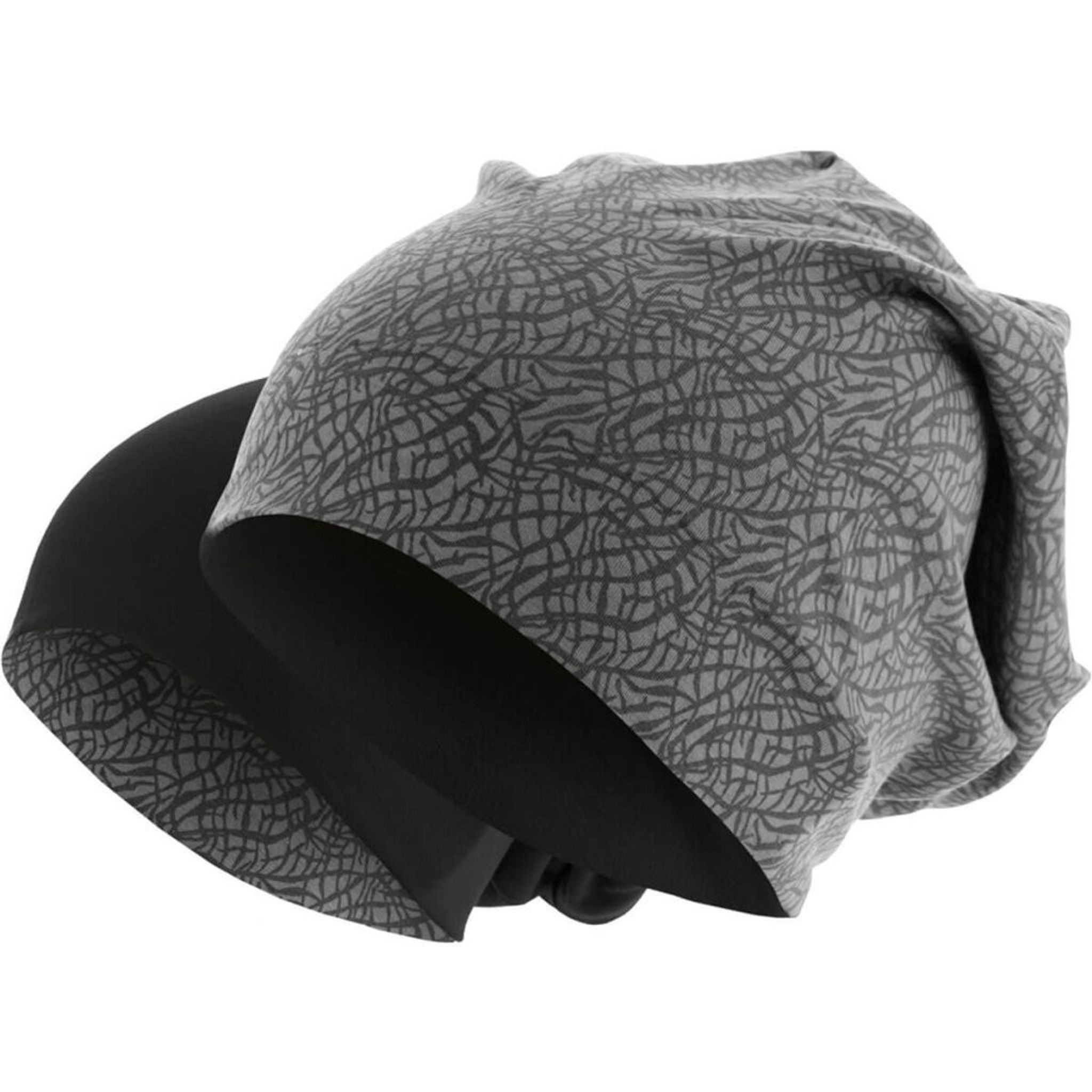 En lång mössa med en tryckt sida och en helsvart eller grå sida.